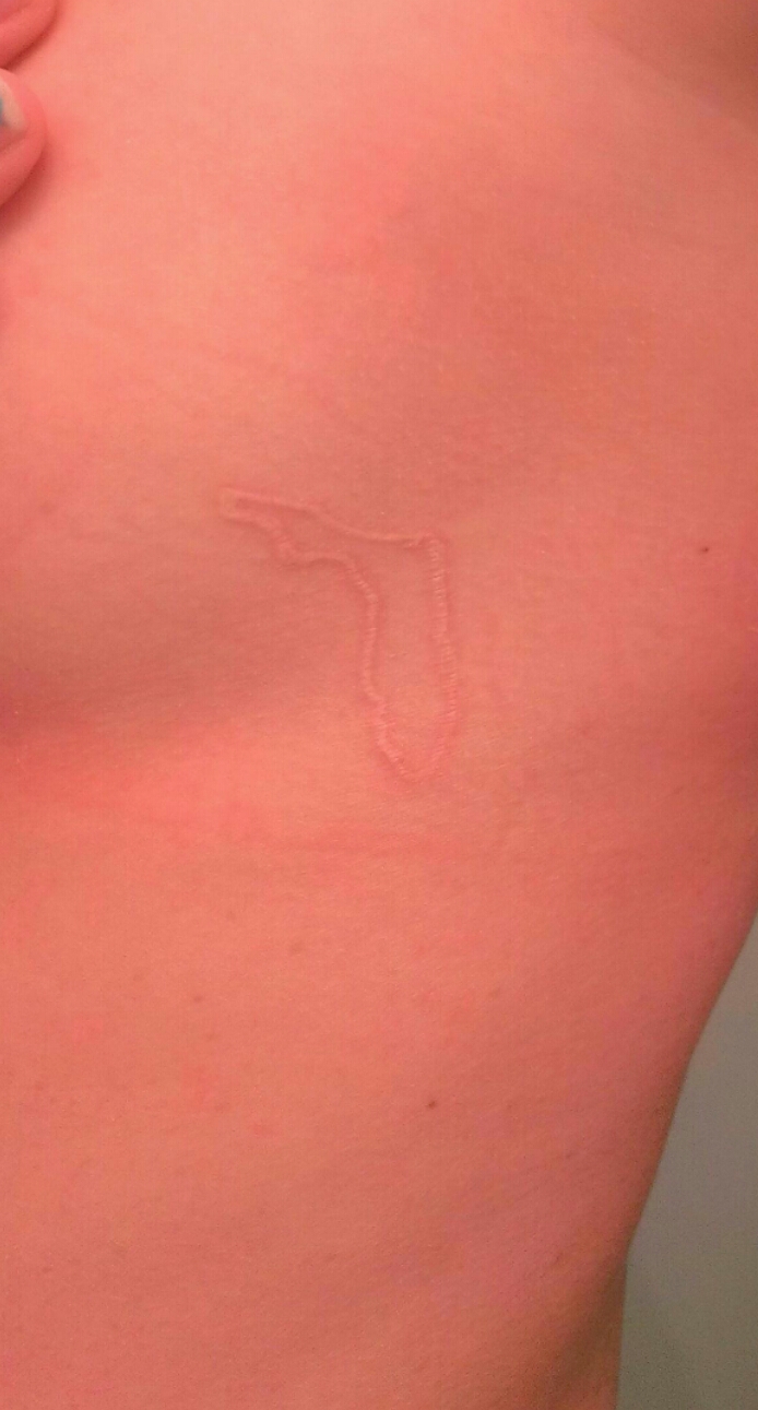 I got a white outline tattoo of Florida. Florida is my birth place and my safe haven. It was where I spent most of my life with dad and where I promised my life to DH. It is in a location that will seldom, if ever, be seen. It is white so it is almost invisible because it is not meant to be shown. It's sole purpose is to keep my family together in this life and any other.