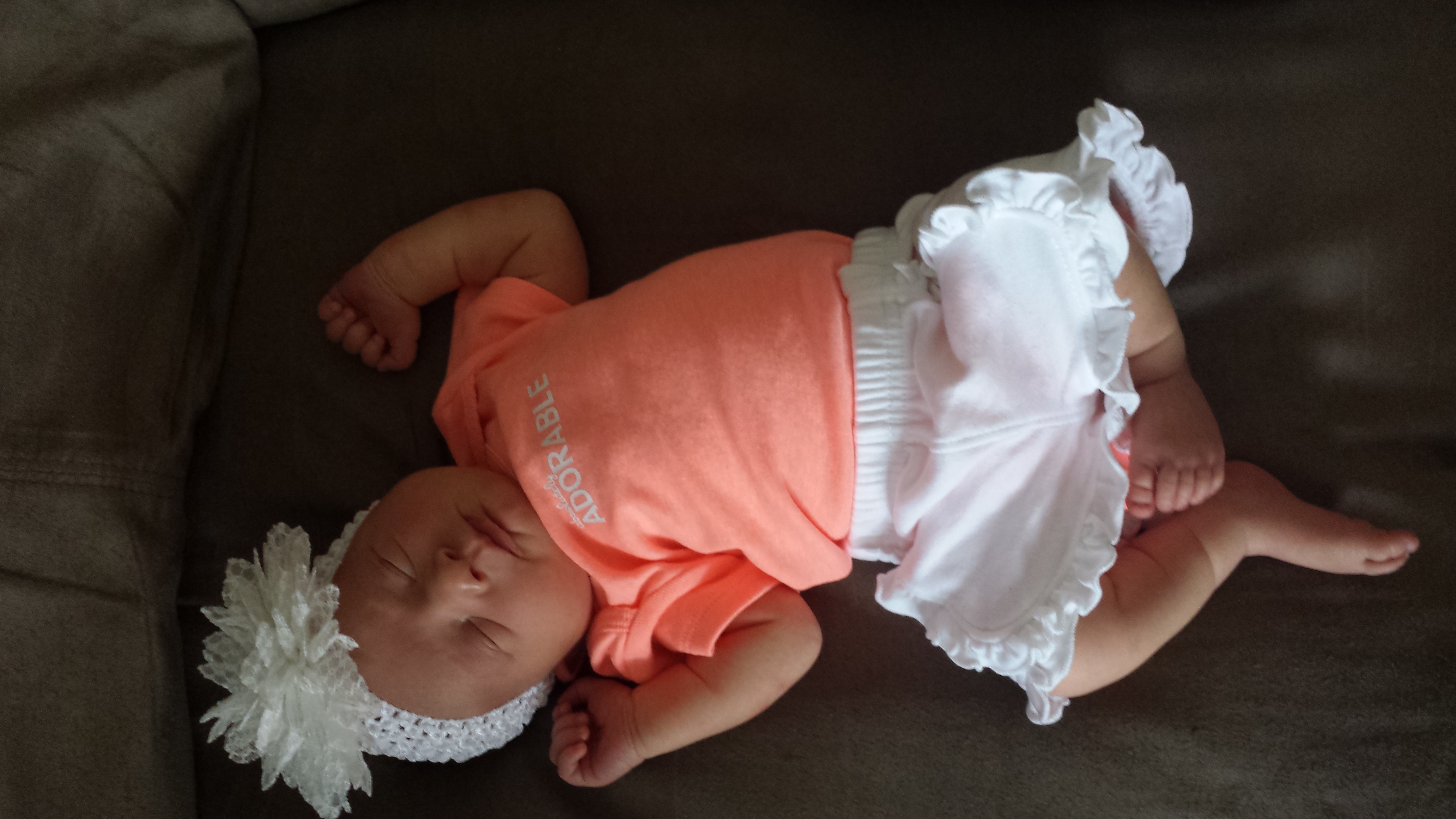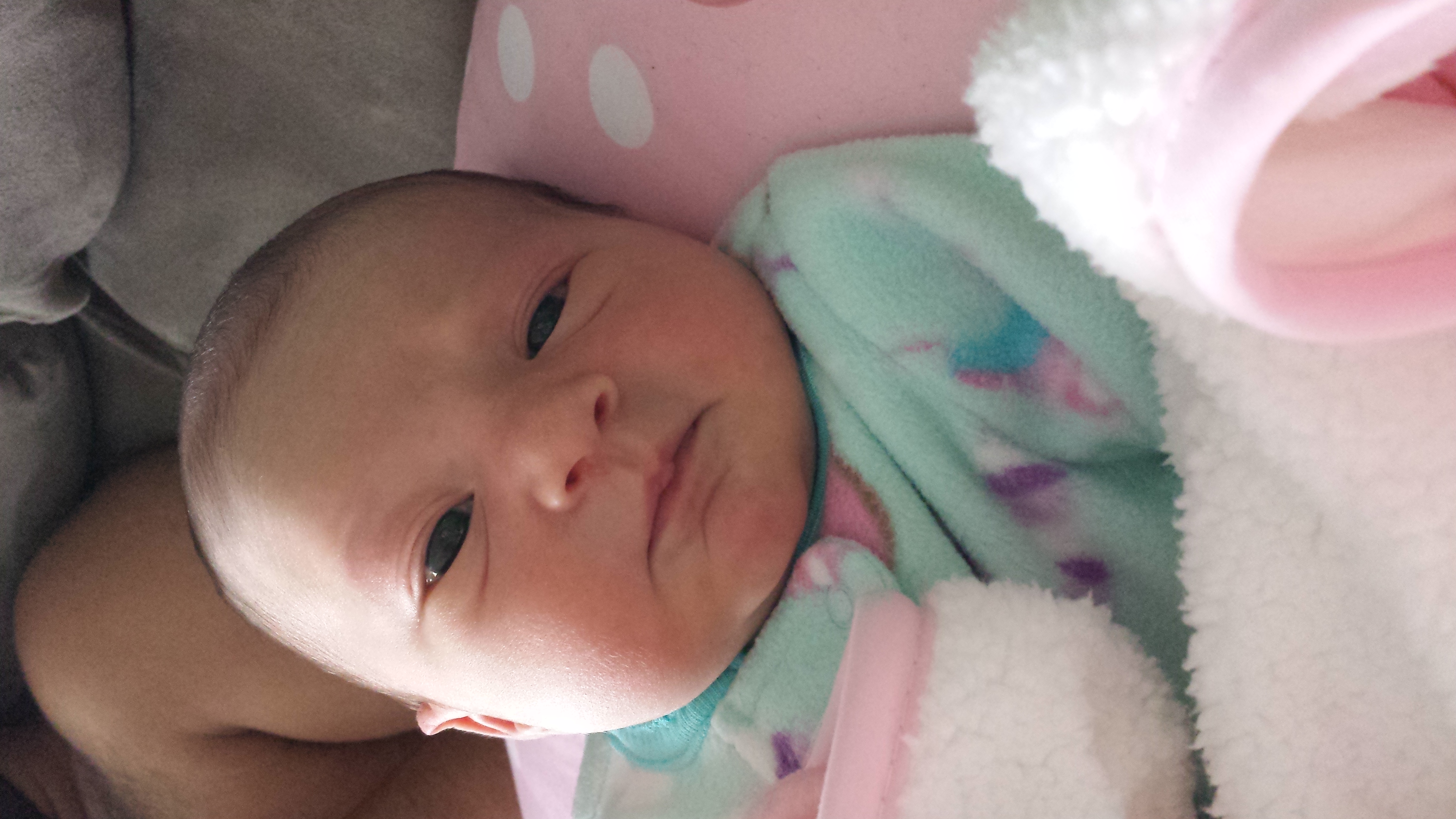 Long version: I was induced Thursday 4/17/14 @ 40w3d - 4cm 80%. I arrived at the hospital at 5:30am, filled out a bit of paperwork and headed back to L&D around 6:30am. Shift change was at 7am so I was bummed to learn I wouldn't keep my nurse since she was so nice. So around 7am I met my new nurse and her shadow. Shadow was nominated to start my IV which resulted in me passing out because she lost the vein and I happened to look over to see blood pouring out of my hand. After that ordeal my main nurse got the IV in with no problems at all and they started my pitocin around 7:30am. My doctor arrived about an hour later to break my water. I opted for a med free birth which literally surprised everyone who entered my room and my contractions were bearable until around 1pm. I had just been checked and was at 6cm and totally thinned except for the very right side so it was suggested I sit up straight or lay on my right side, both made my contractions worse and I felt myself losing it. I'm assuming that's when I really hit transition because in a matter of minutes my body felt the need to push. Shadow happened to come into the room at that time because baby had jumped off the monitor. When I told her I needed to push she told me that there was no way since they had just checked me and I was only 6cm. At that point my husband spoke up and let her know this is exactly how I acted when I had my son and I was indeed ready so she reluctantly checked me again only to feel my baby girl's head. She yelled for my main nurse who then yelled for the closest doctor. Everything after that was pretty much a blur, I remember my body still trying to push while I was trying to wait for my OB to run from her building, another doctor coming into the room and telling me it was ok to push, pushing twice and baby girl shot into the world like a rocket @ 1:22pm. My OB literally ran in a minute after she was born. She talked me through delivering the placenta and stitched my first degree tear in the same spot I tore with DS. I was able to skin to skin with baby girl for a few minutes before she was taken to the NICU because she was having a bit of trouble breathing since she didn't have time to clear all the fluid from her lungs due to how fast she came. We were so lucky she only had to spend an hour being monitored before she was back with us. Baby weighed 8lbs 8oz and was 20 in long. We had a great hospital stay although things sure have changed a ton in the 2 1/2 years since I had my son. We were discharged on Saturday with baby weighing 7.10 and since being home LO is a great nurser but we are having trouble with her gaining weight. We've already had 3 doctor visits and if she is not back up to birth weight by her 2 week appt. next week I'm so worried they will tell me to supplement. So I'm now feeding every 2 hours around the clock which makes for a very tired momma! Thanks for reading! Sorry for any typos or if this turns out to be one huge lump, I'm on mobile while I'm sure you guessed it - nursing with sore nips!