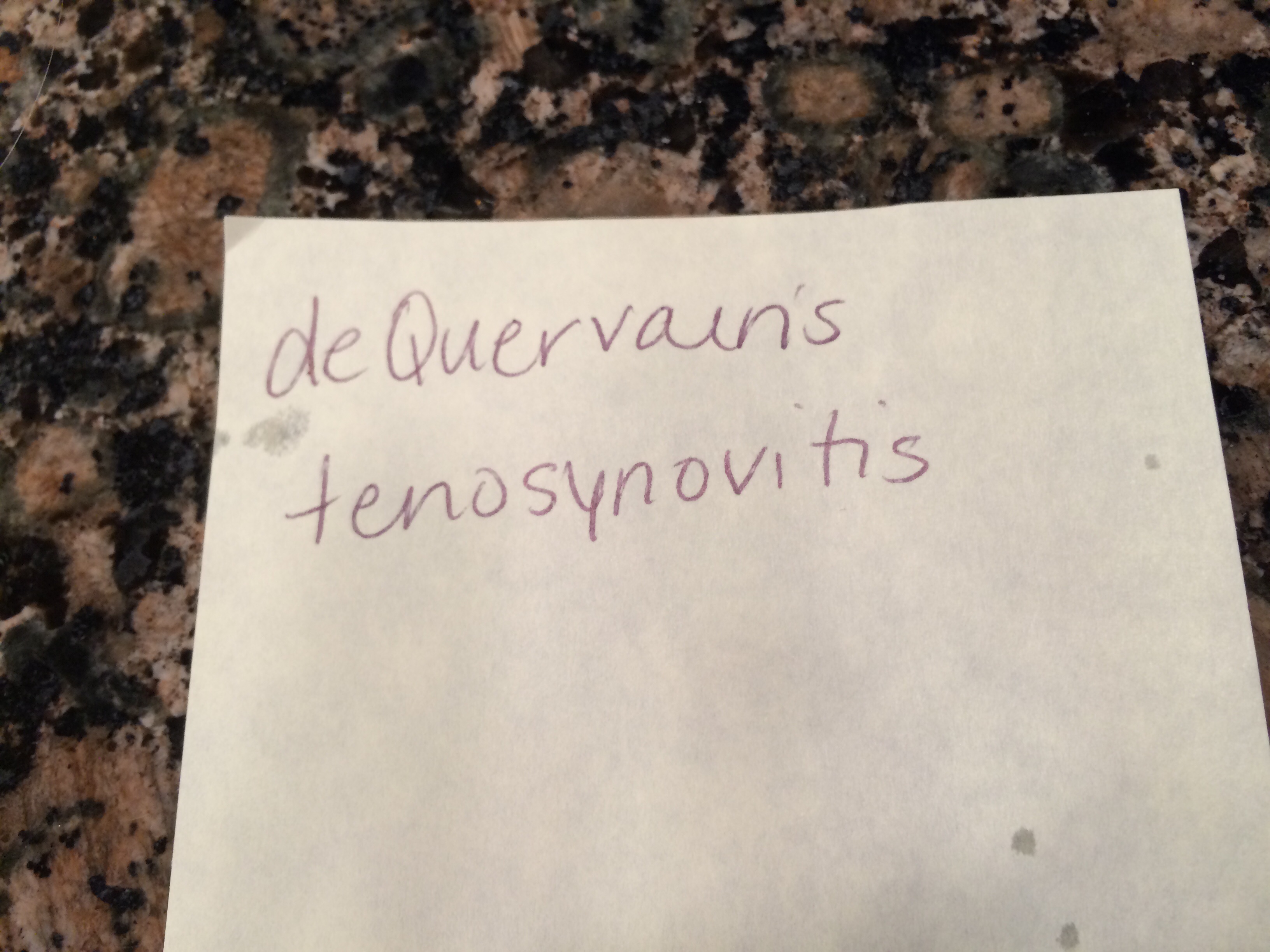 I have my regular OB at 11. After today they will be weekly! Wow! I'm hoping I'm still measuring on track! I feel so huge! Also need to talk to my doc about horrible pain in my thumbs/wrists/forearms. It's not Carpal Tunnel but something similar. Here's the sticky note pic of what the technical name is in case anyone else has it.