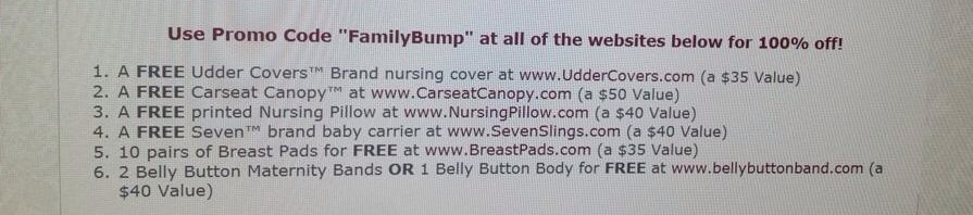 Hey ladies in the picture is some free items you can order and the promo code is for 100% off just pay shipping! I personally have ordered and recieved the car seat canopy and sling! The carsear canopy can used for the car seat, tummy time and nursing cover! Hope you all enjoy!