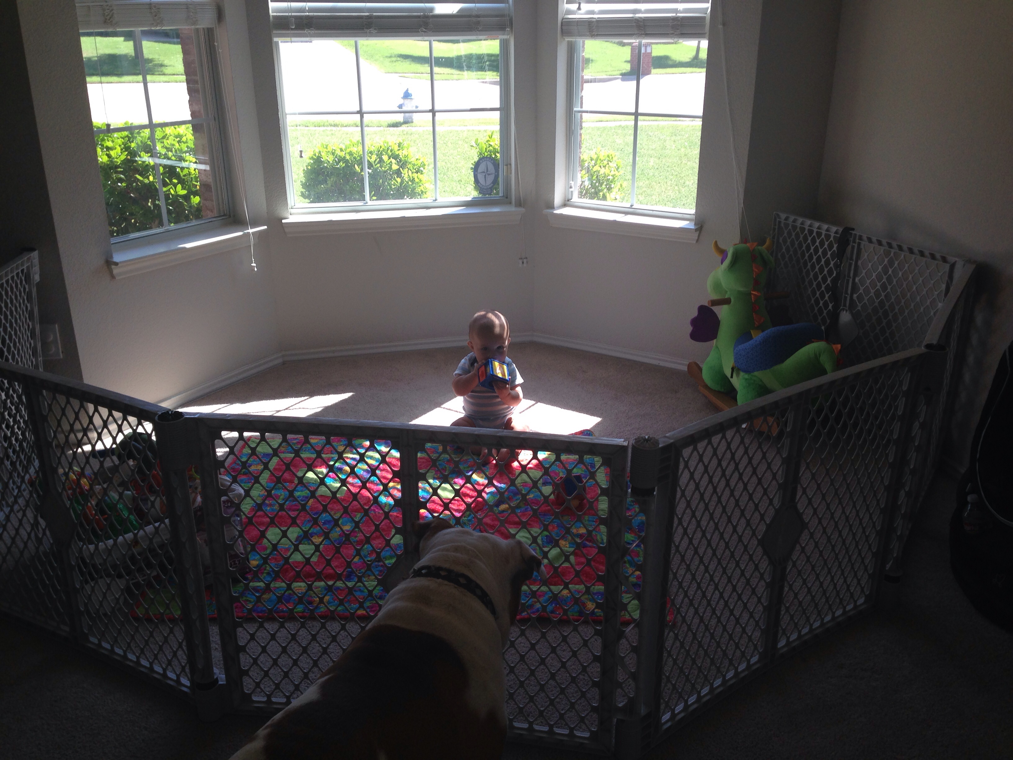 For a while we used the PnP in combo with the bouncy to block him in...then he learned to push them aside. Now we currently use a fold up table turned on its side to keep him out of the dining room. Our house is klassy!