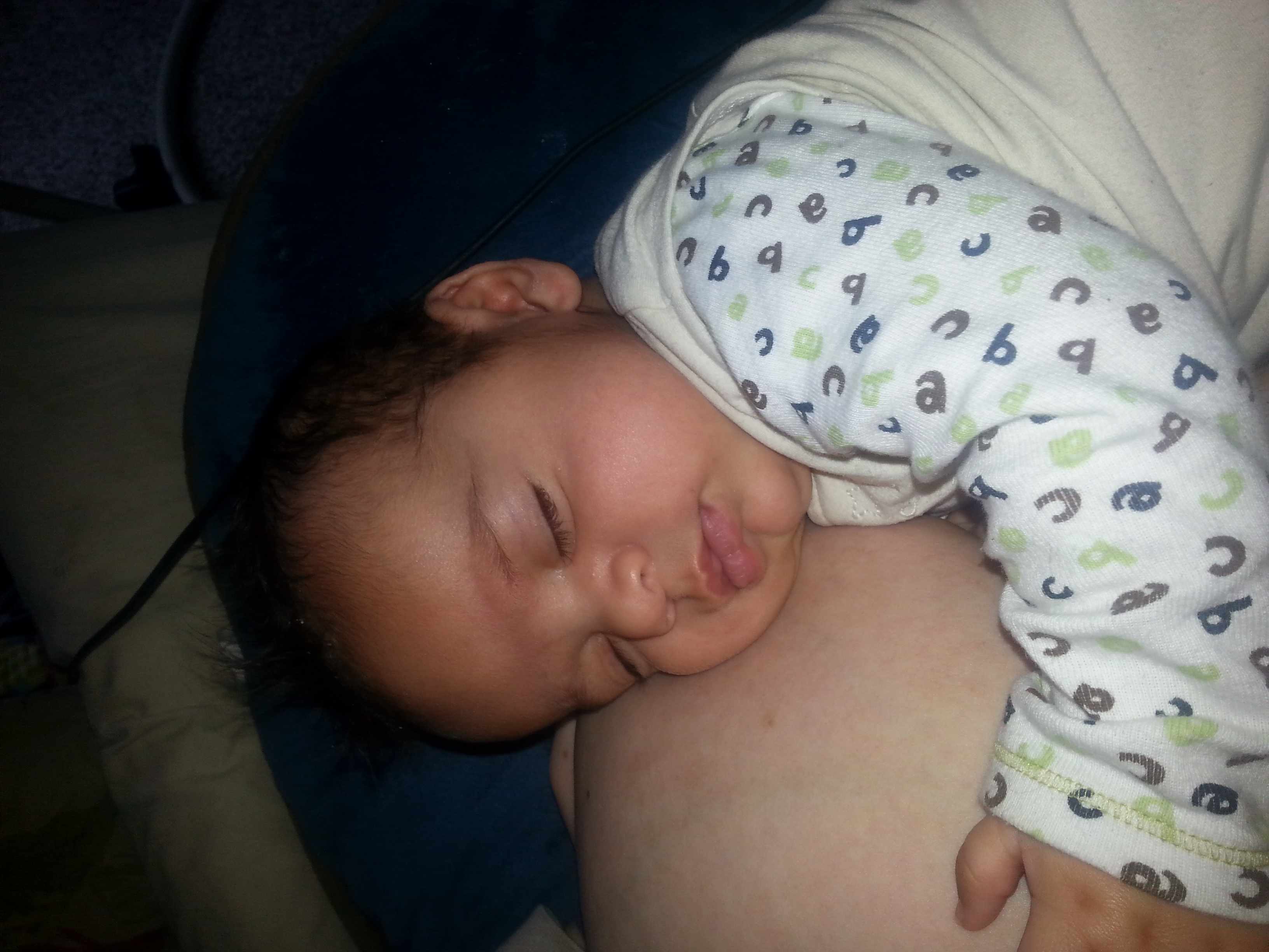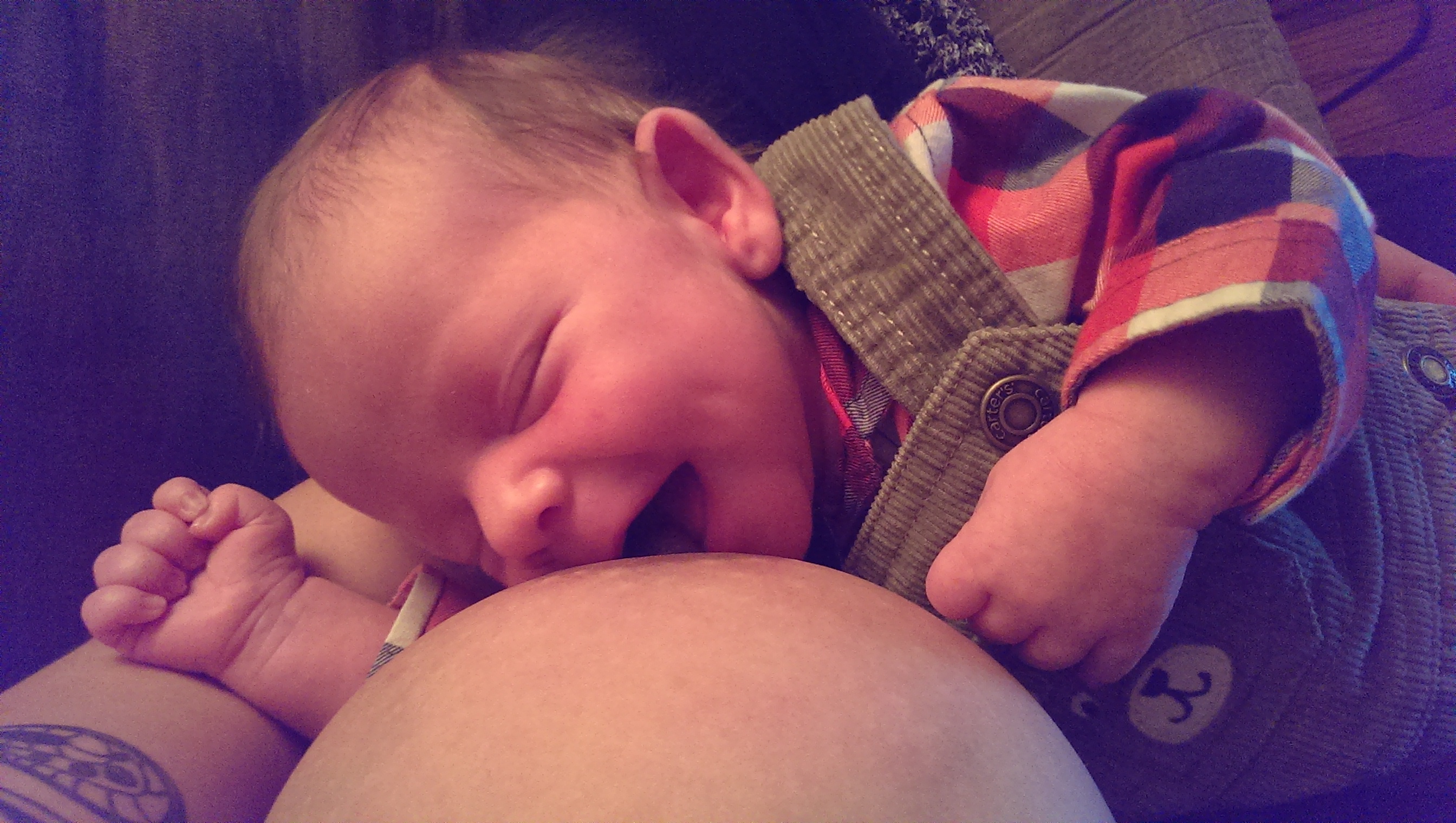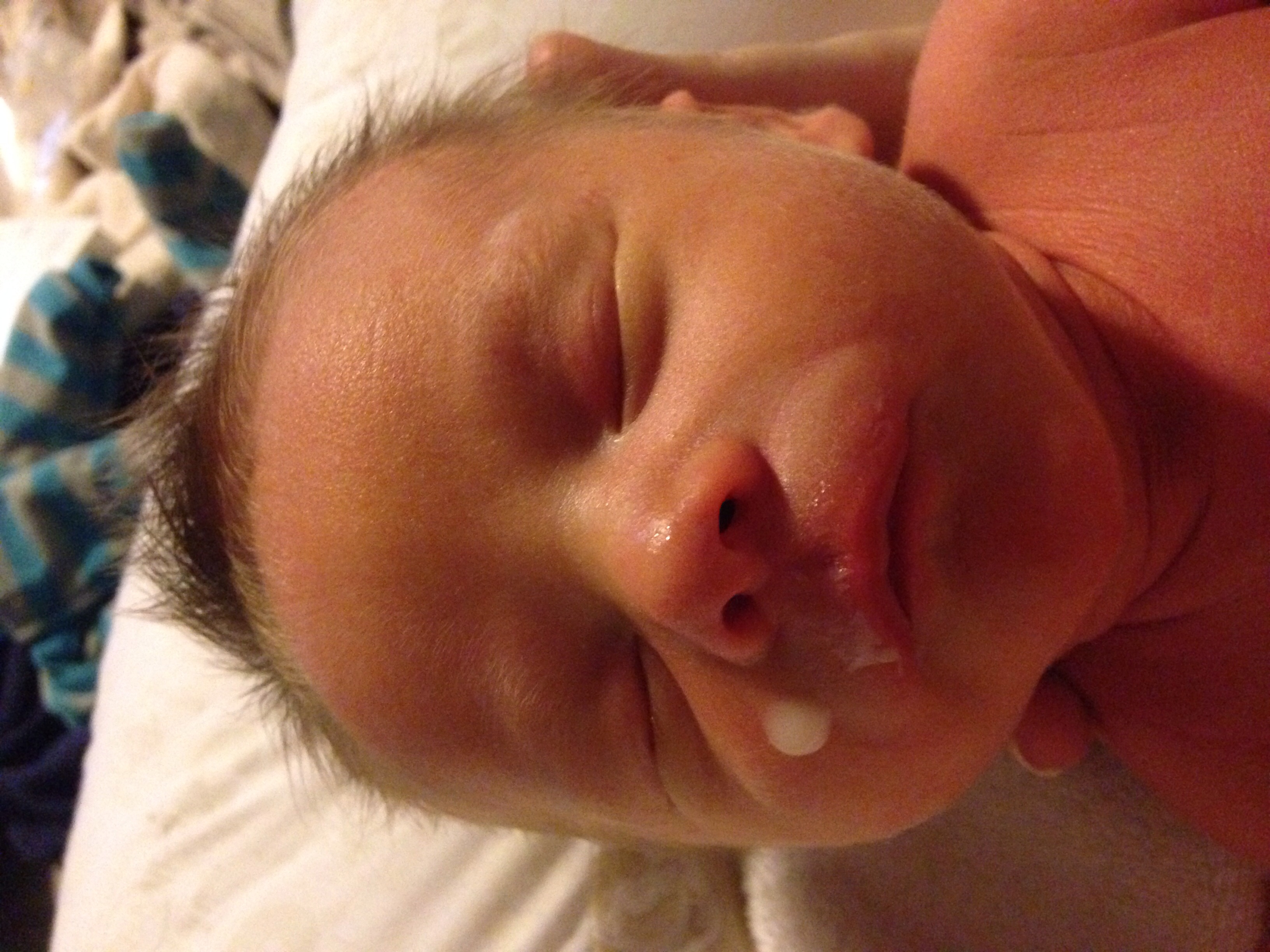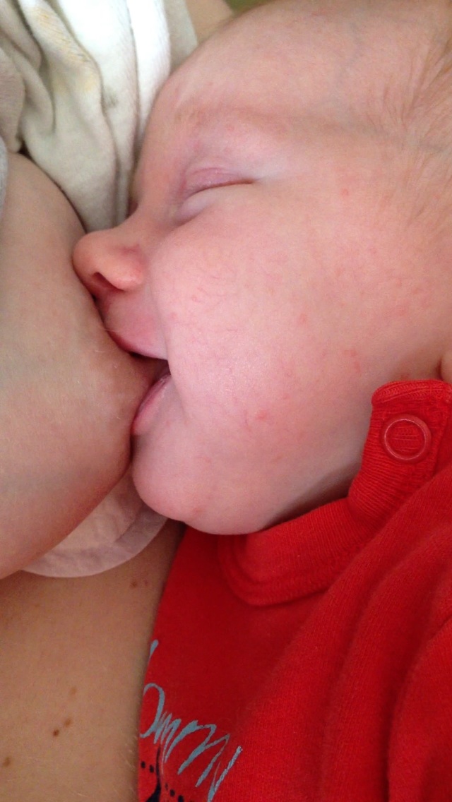 I love the milk glisten on the chin & the fact that his eyes are barely open. I wish this photo had sound because he was making this really low hum-like grunt that quite obviously meant he was so full. Lol!