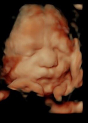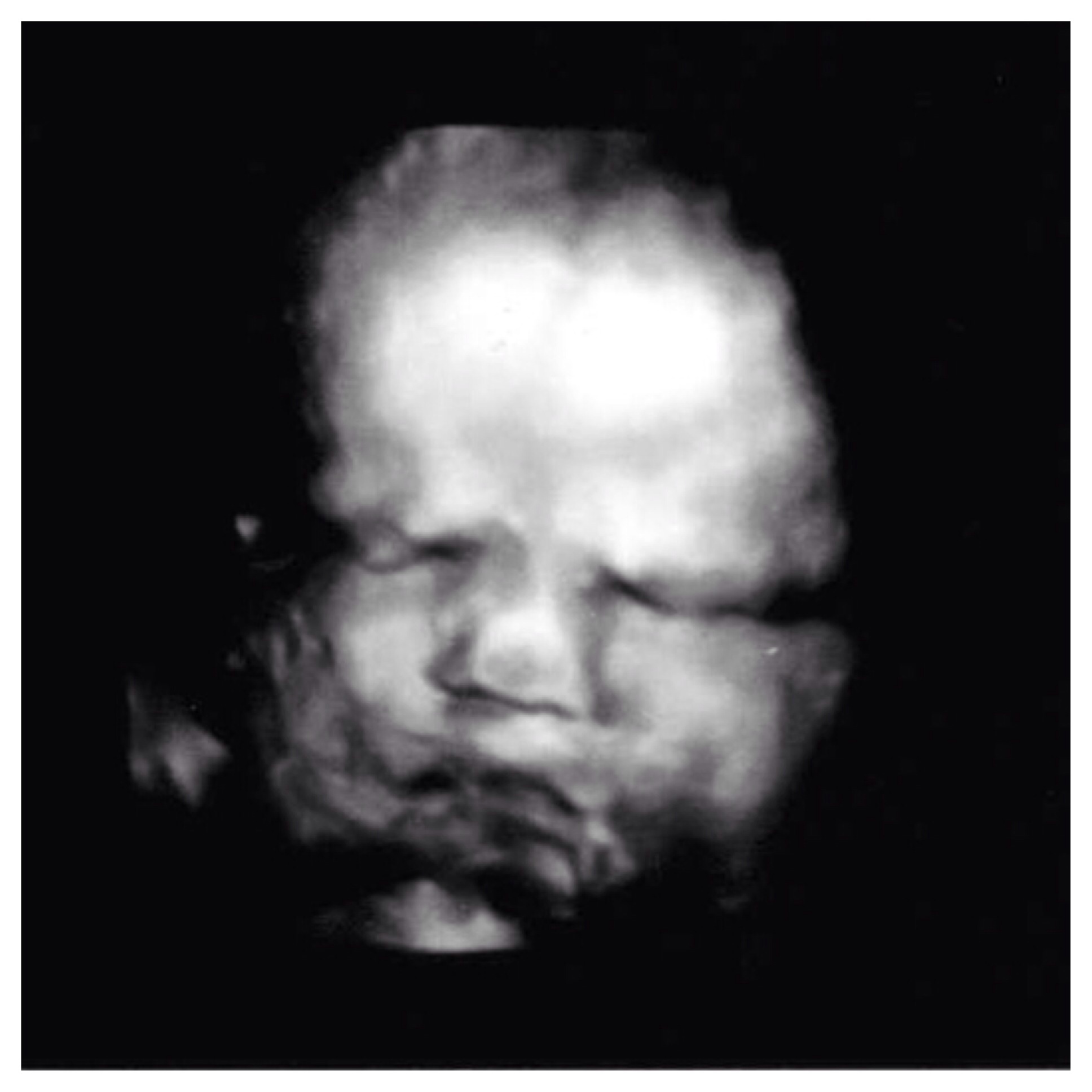 Our big fella looks less funny and more pissed. He's smashed up against my pelvis and has the umbilical cord covering his chin. Poor guy. He looks ready to come out. Already weighing in at 7.8 pounds with an even larger head size and I'm only 35 weeks. Dr said he's gonna be pretty bruised when he does get out (I have to have a c section) but LO doesn't know that so he keeps squeezing himself further down and his Charlie Brown head just doesn't fit.