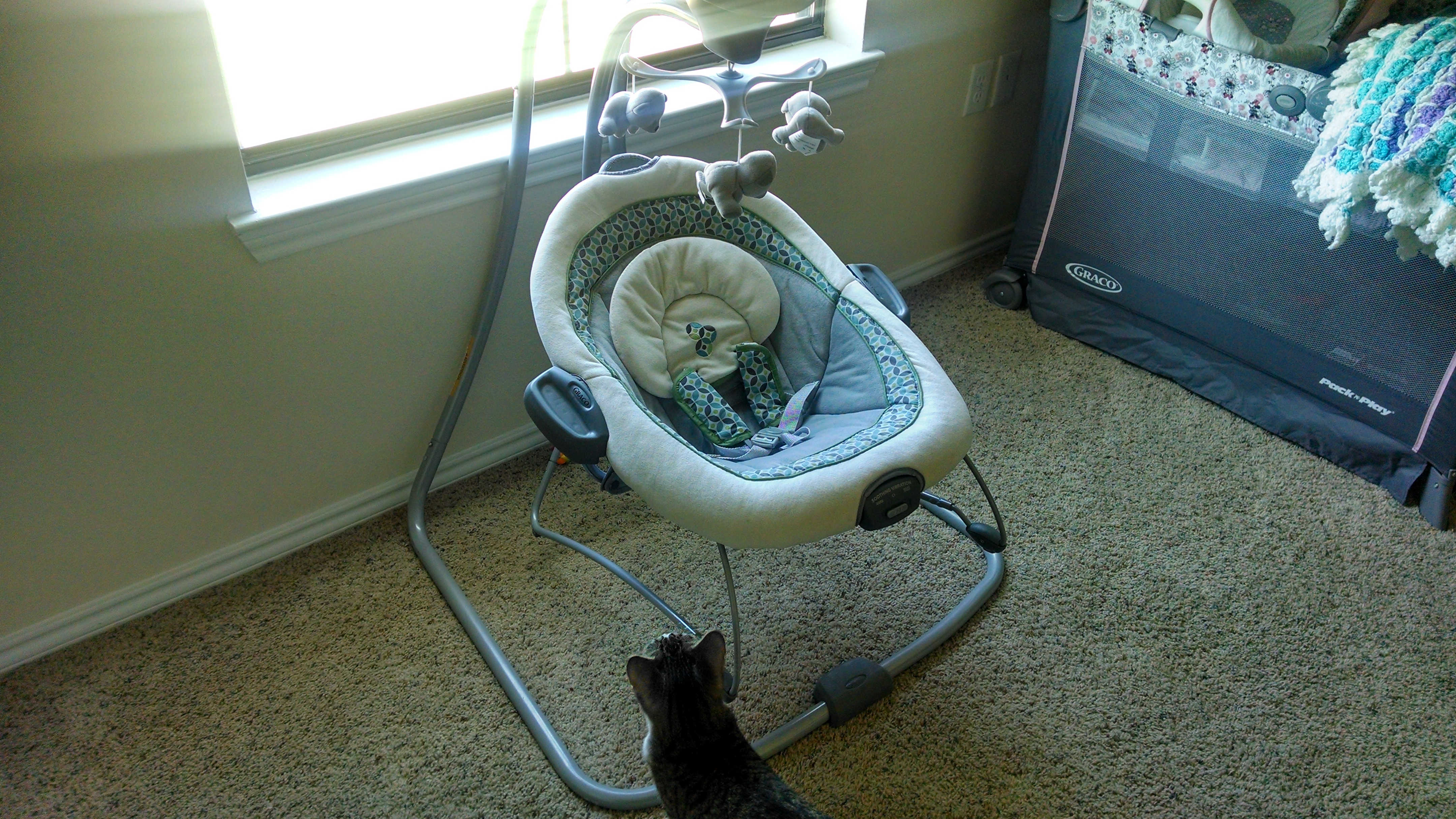 We found a Graco bouncer/swing with vibrations/sound.. Originally 150, we got it for 80 :)