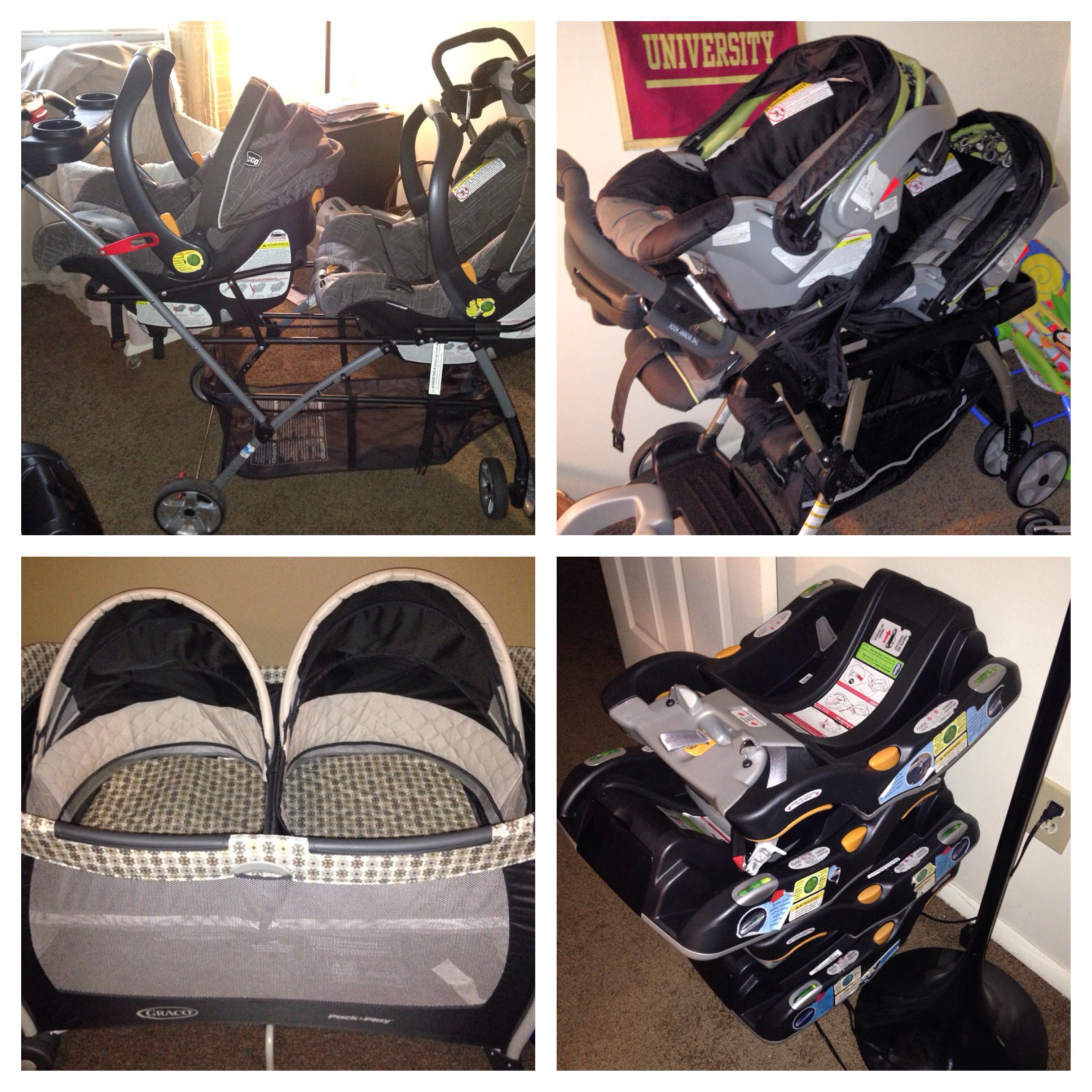Excuse our storage area for baby items, but we got all of this for $375. In case you can't see it well- 2 double strollers, 4 infant car seats (Chicco Keyfit and Graco Snugride 30), 6 bases, and the Graco Twin Pack n Play. Couldn't pass it all up for convenience sake of having two.