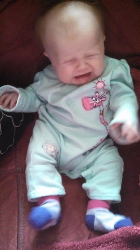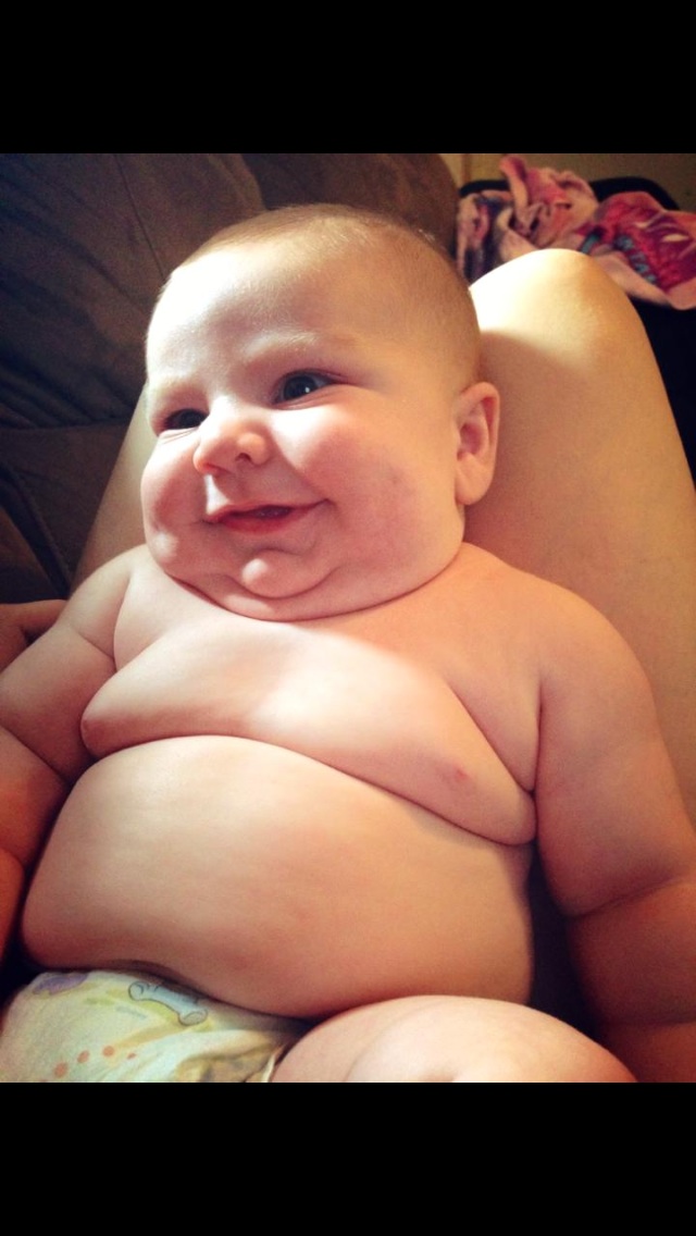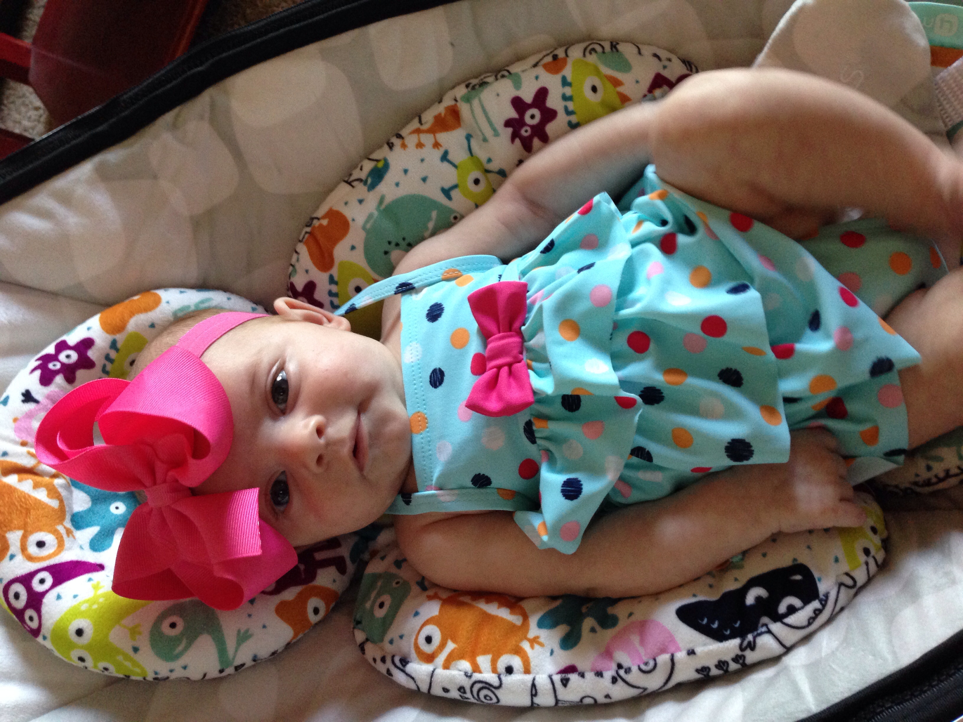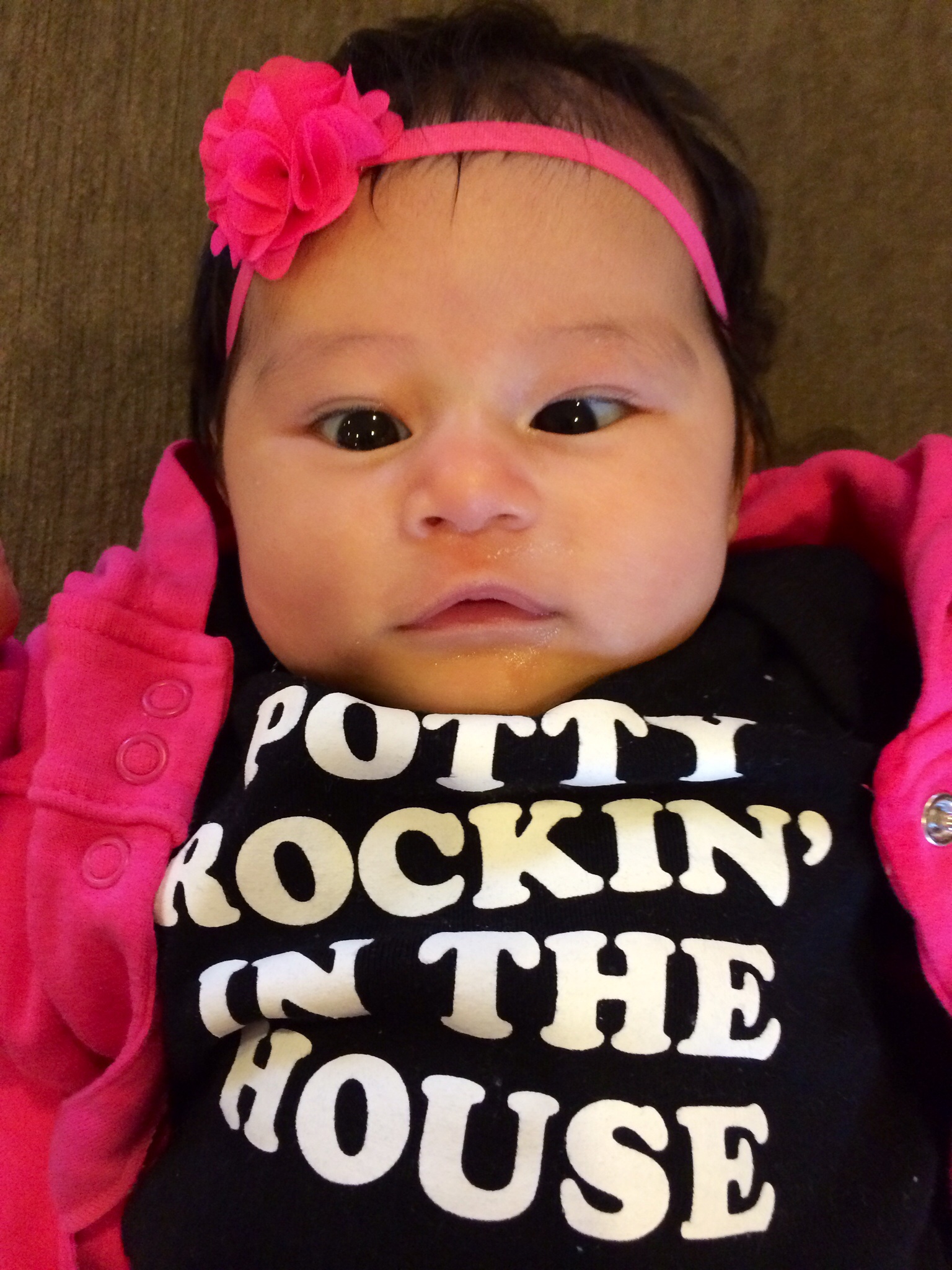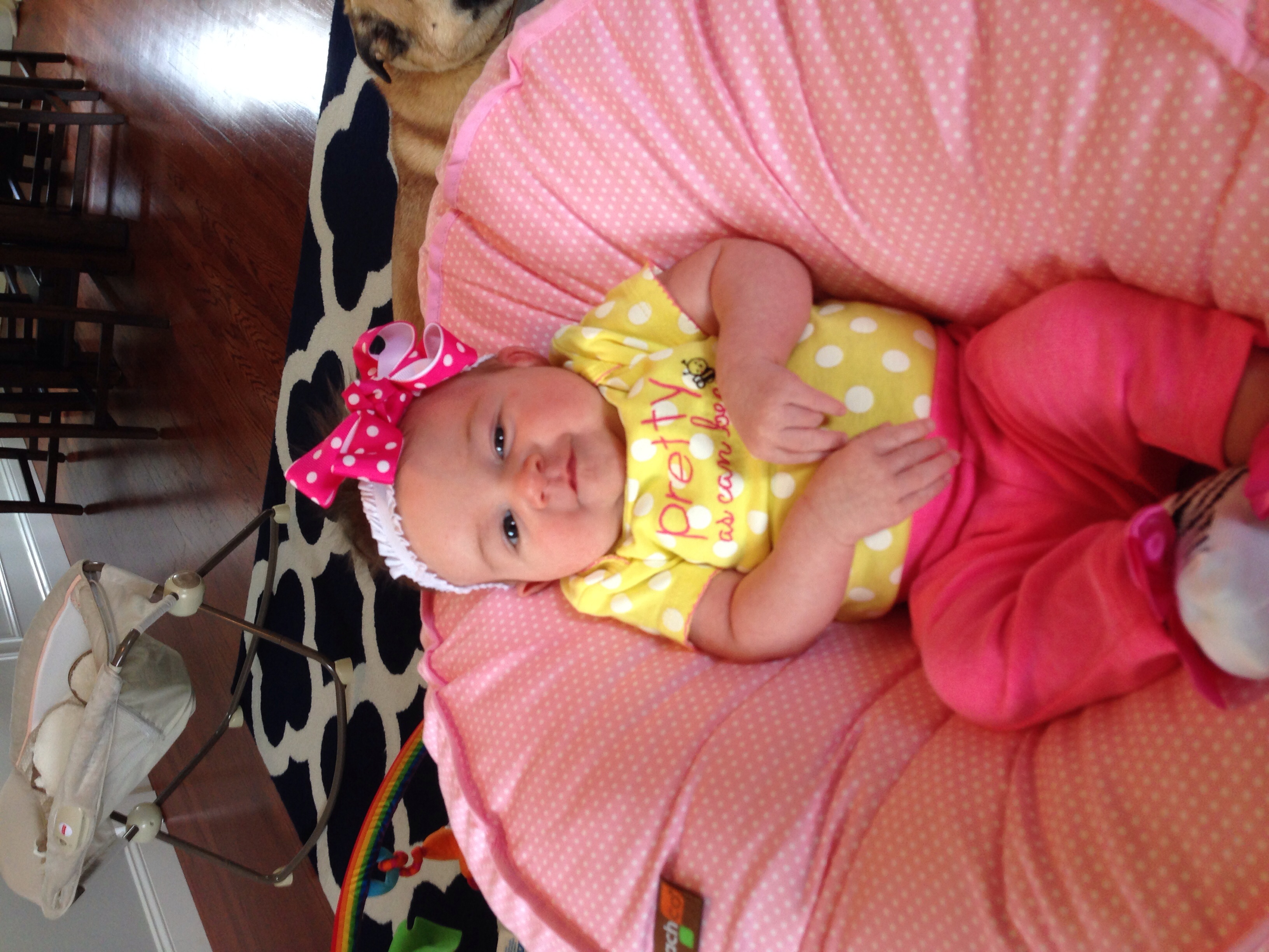 The second is of her sitting up on the couch--I picked this one because it made me laugh. She actually really likes sitting up on the couch and looking around, but every time I tried to take her picture while sitting that day she would cry! And then I would put my phone down and she would stop...and then when I tried again, MORE CRYING! LOL It was like she was trying to make me look like a fool when I told my mom she enjoys sitting up like a big girl...