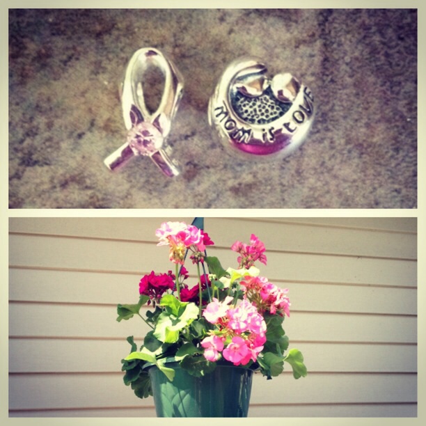 So far we have went to the flea market, went to breakfast with my mom, and are now relaxing at home. We are going to dinner with DHs parents around 6. I really want a nap. DH and DS got me two beads for my Chamilia bracelet, which are beautiful and a hanging basket of flowers. My aunt/godmother got me a hanging basket too. :) Happy Mother's Day to you all!! <3