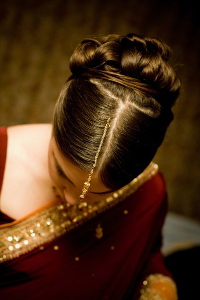 I bought the bridesmaids their jewelry for the wedding. That way they all had the same stuff and could theoretically wear it again. Because they wore sarees, they got earrings, necklace, bindi, and bangles. We had everything but the bangles made in India in the wedding colors. As far as Indian jewelry goes, they were pretty simple.  Here's a good shot of the bindi and you can kind of see the necklace.