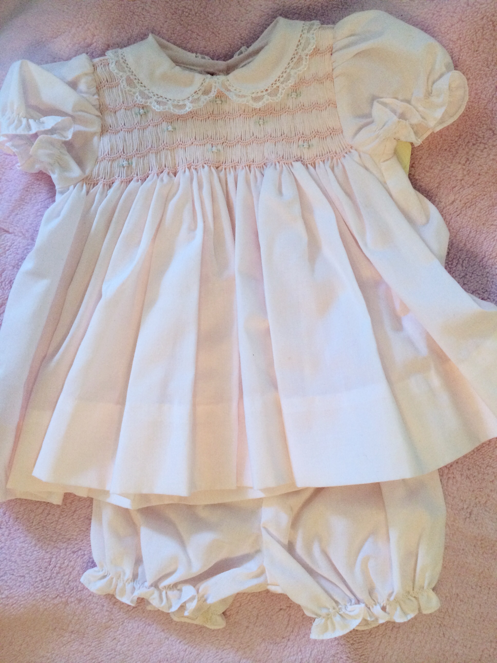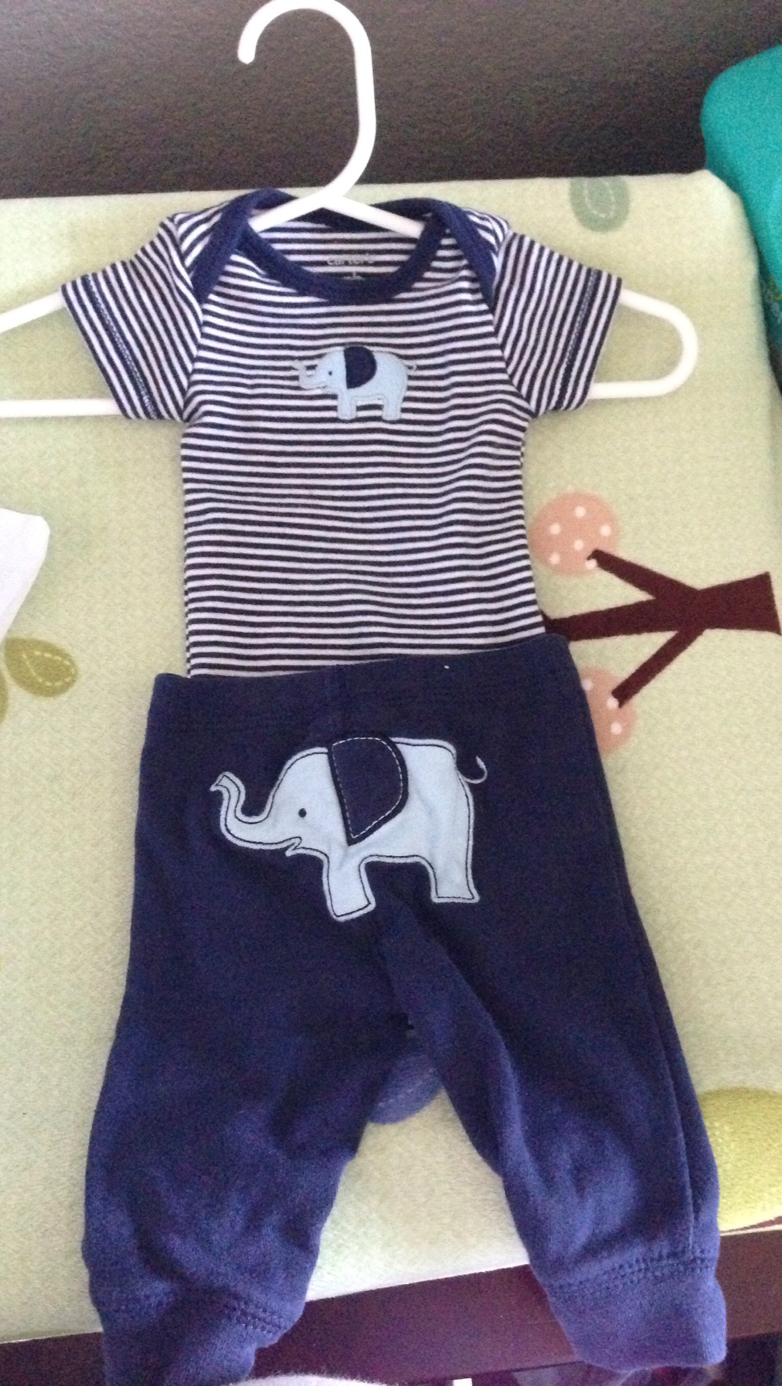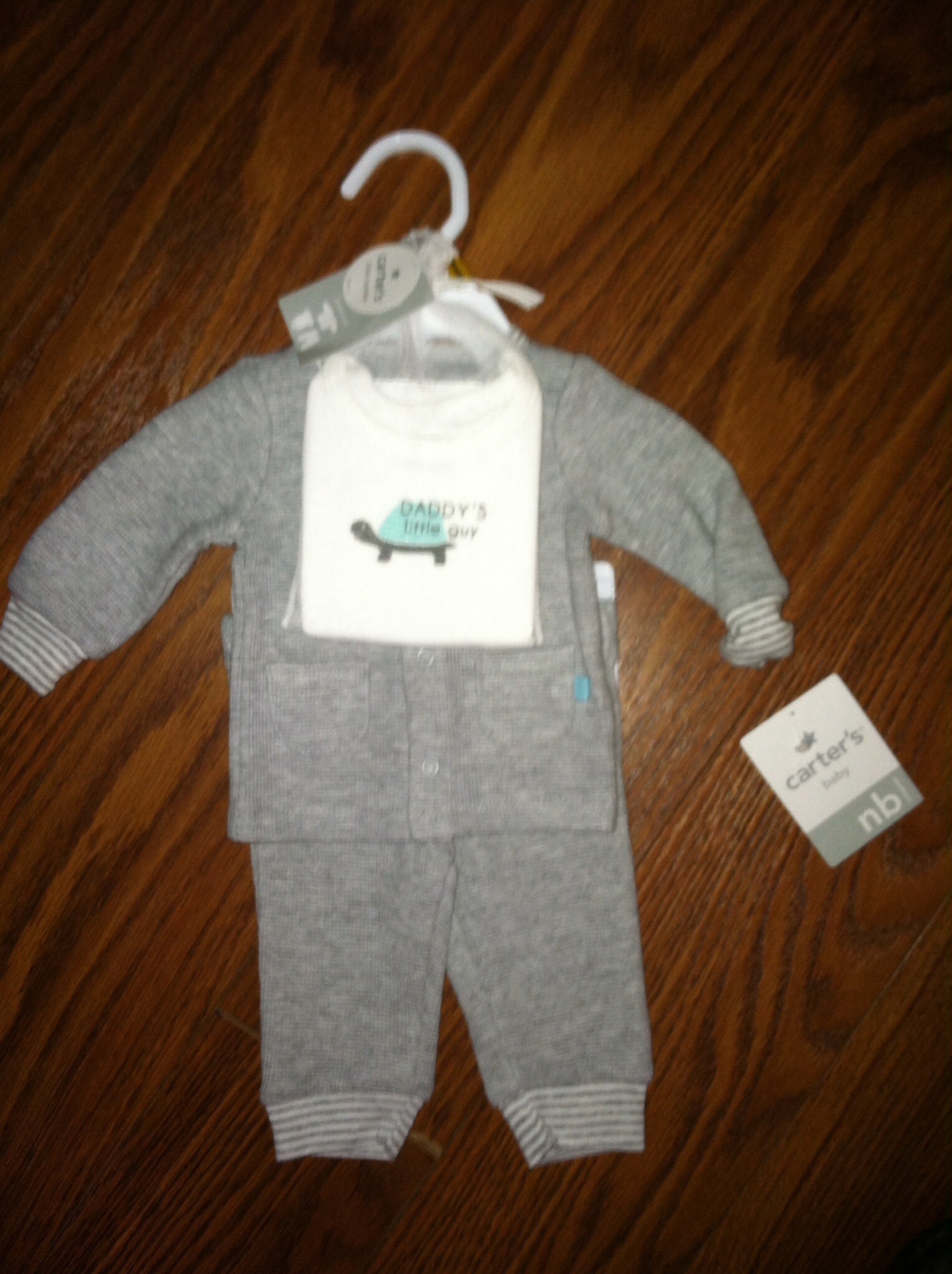 I got this cute dress and cardigan set for her to wear in NB size.  We have a backup outfit in 0-3 if she happens to be that big....but I dont' foresee it as my 8lb4oz 21in 3rd child (also the biggest) wore NB at birth.