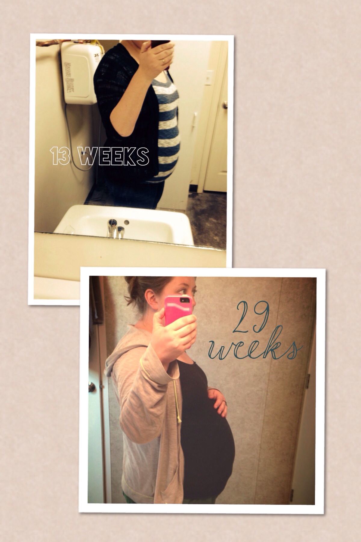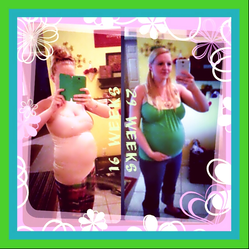 I hope this isn't too huge. Here's me already chunky at 4 weeks when I found out, versus last night at 29 weeks. People keep telling me I'm going to have a big baby. I look at them and say it's just fat.