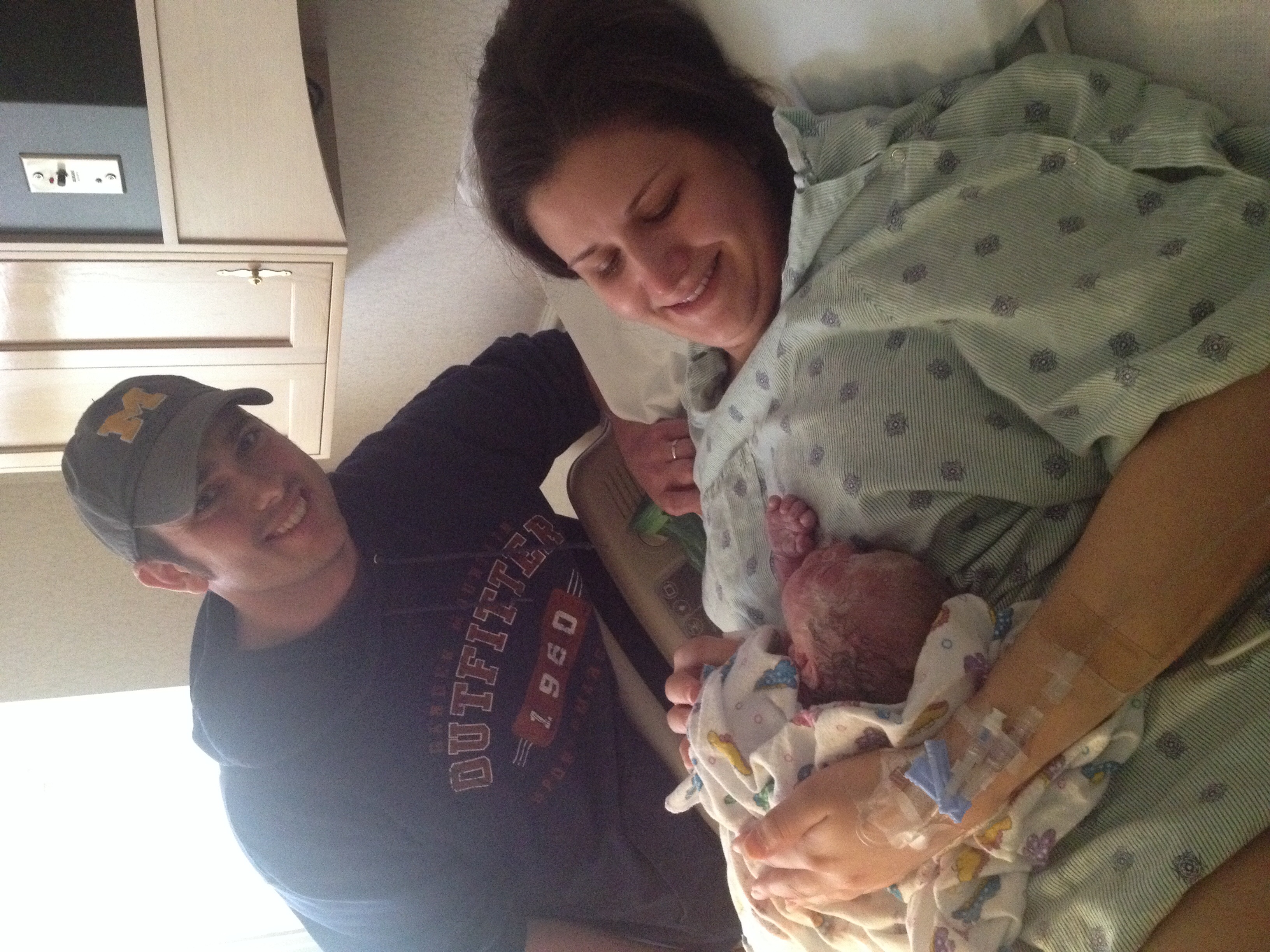 Woke up at 4am with contractions about 3-5 min apart. Got to the hospital about 5:30-6am. Epidural around 8:45 am. Parker was born at 12:10 pm, 5lbs, 18 inches. Epidural was awesome. Barely felt a thing and was laughing and joking with the nurses. Parker came out screaming! They let me hold him, did delayed cord clamping, and he started pouting his mouth so attempted breast feeding and he did great! Nurses say he is doing awesome for being early. All he has right now is an iv and monitors. They said he could be in the NICU for 1-2 wks, but if he keeps impressing the nurses and docs, who knows. I only had one med student in the room and the deal was he had to take pictures. I look like crap but love the picture of Parker right after birth. So happy . (His nose was smushed some from birth but it's slowly straightening out, poor kiddo)