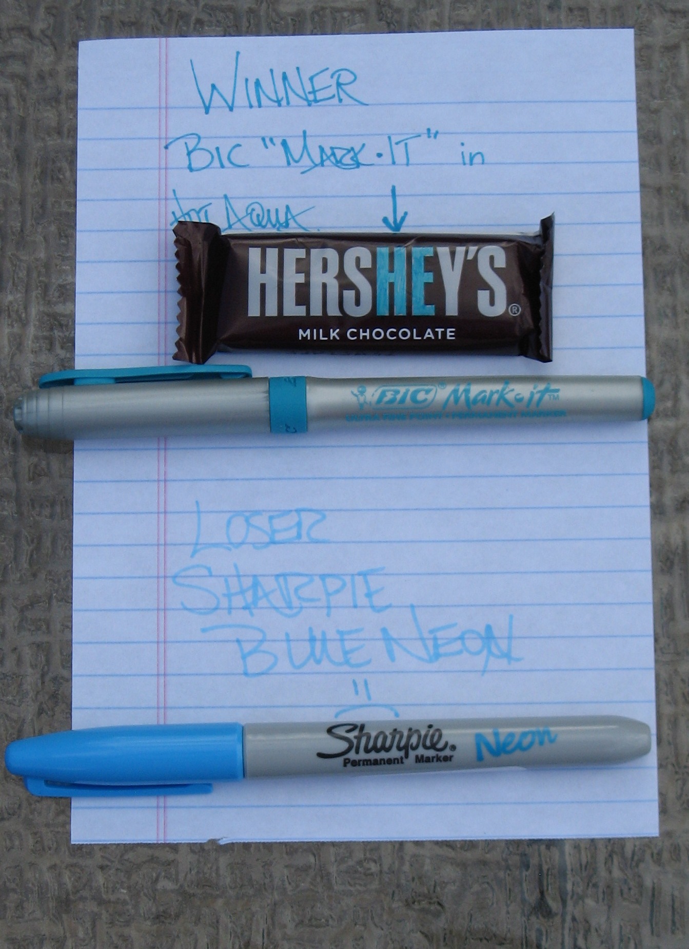 so, you may have read my post about deciding to do the hershey bar reveal idea below. i bought the same hershey bars and the exact blue neon sharpie marker and the damned thing will not properly write on the slick wrappers! at best i got a faint blue mark but if i try to color over it it does what sharpies do and kind of makes the line lighter instead of darker. i'm frustrated beyond belief. does anyone have an idea of how to make this work?
