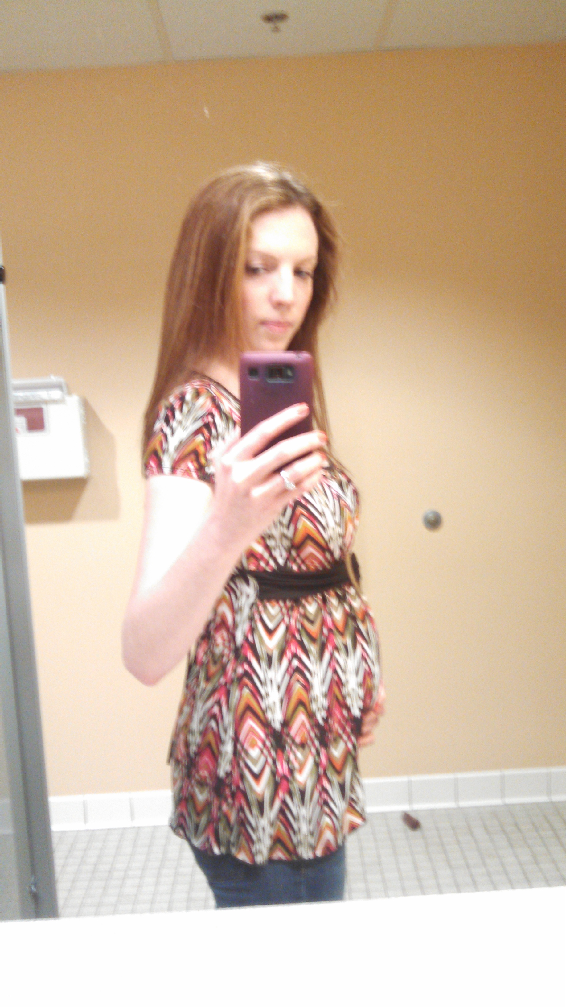 I apologize for the setting (work bathroom, ahh!), and for my serious expression (I was terrified someone would walk in on me, lol). No one here knows I'm pregnant yet so I'm trying to wear flowy tops and distracting patterns to keep it hidden for at least several more weeks! So really not much to see, but here it is anyway: