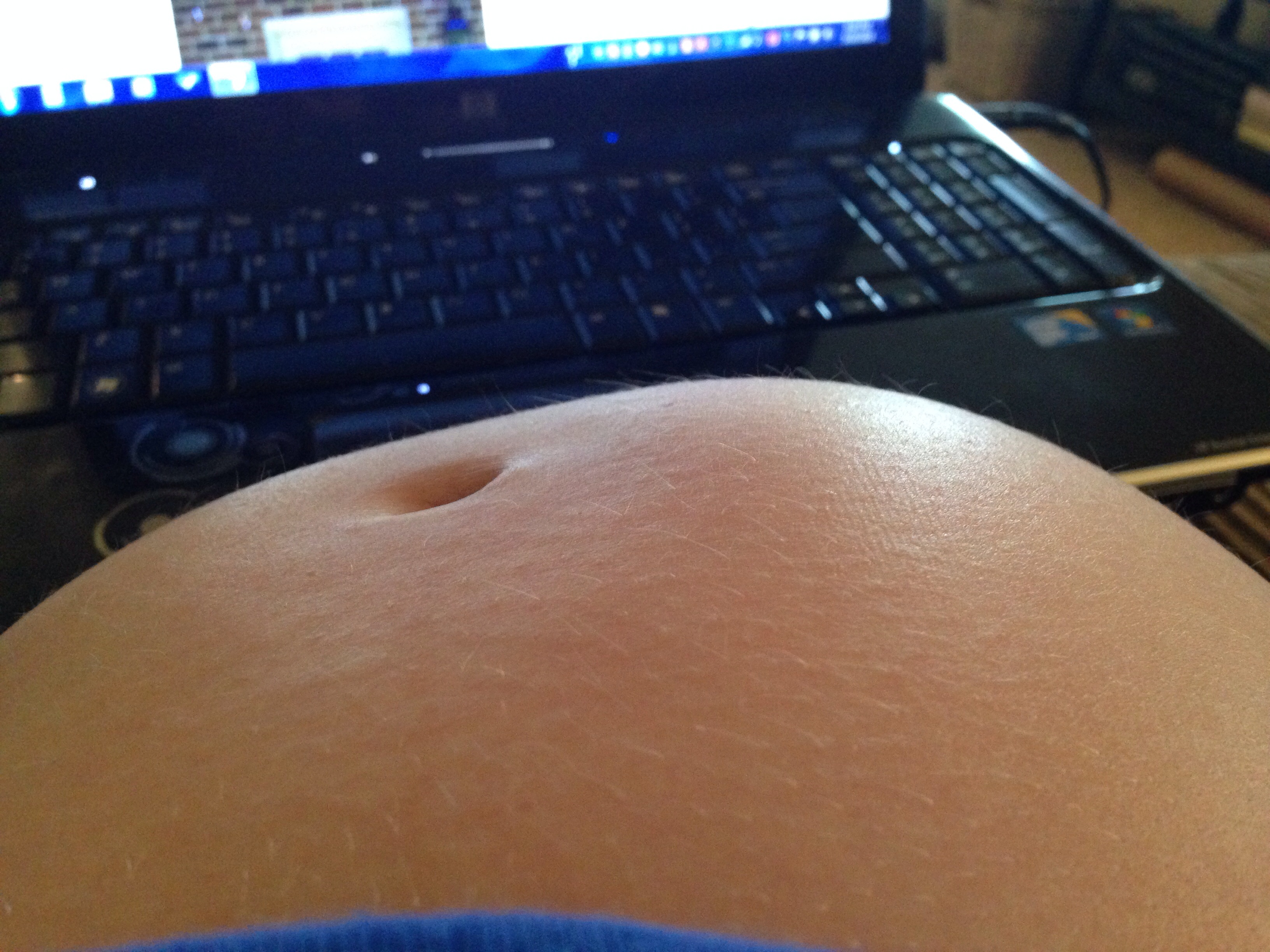 Here is my 27 week bump. That lopsided ridiculousness on the right is my daughters head. Or her butt. I think it's her head... I've also discovered my bump turns triangular if I'm doing a sit-up motion, although I haven't captured that yet...