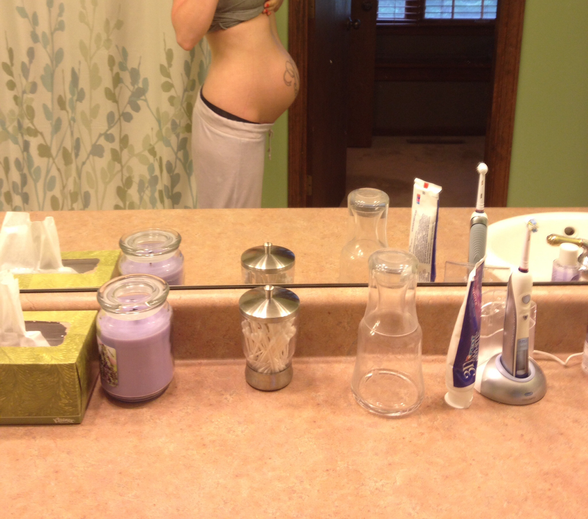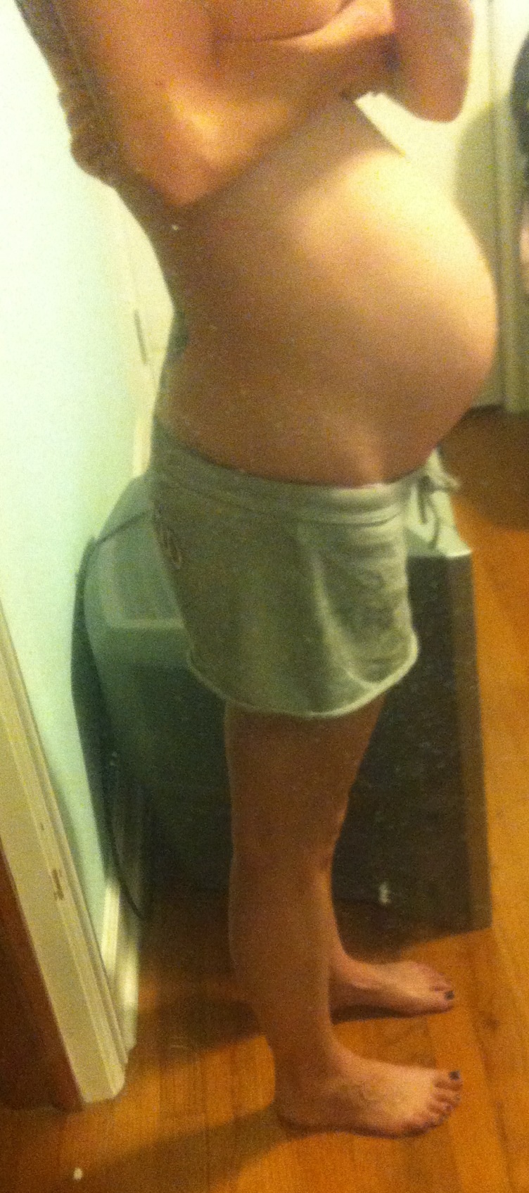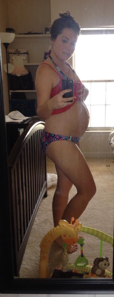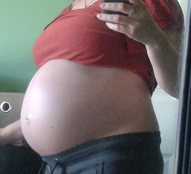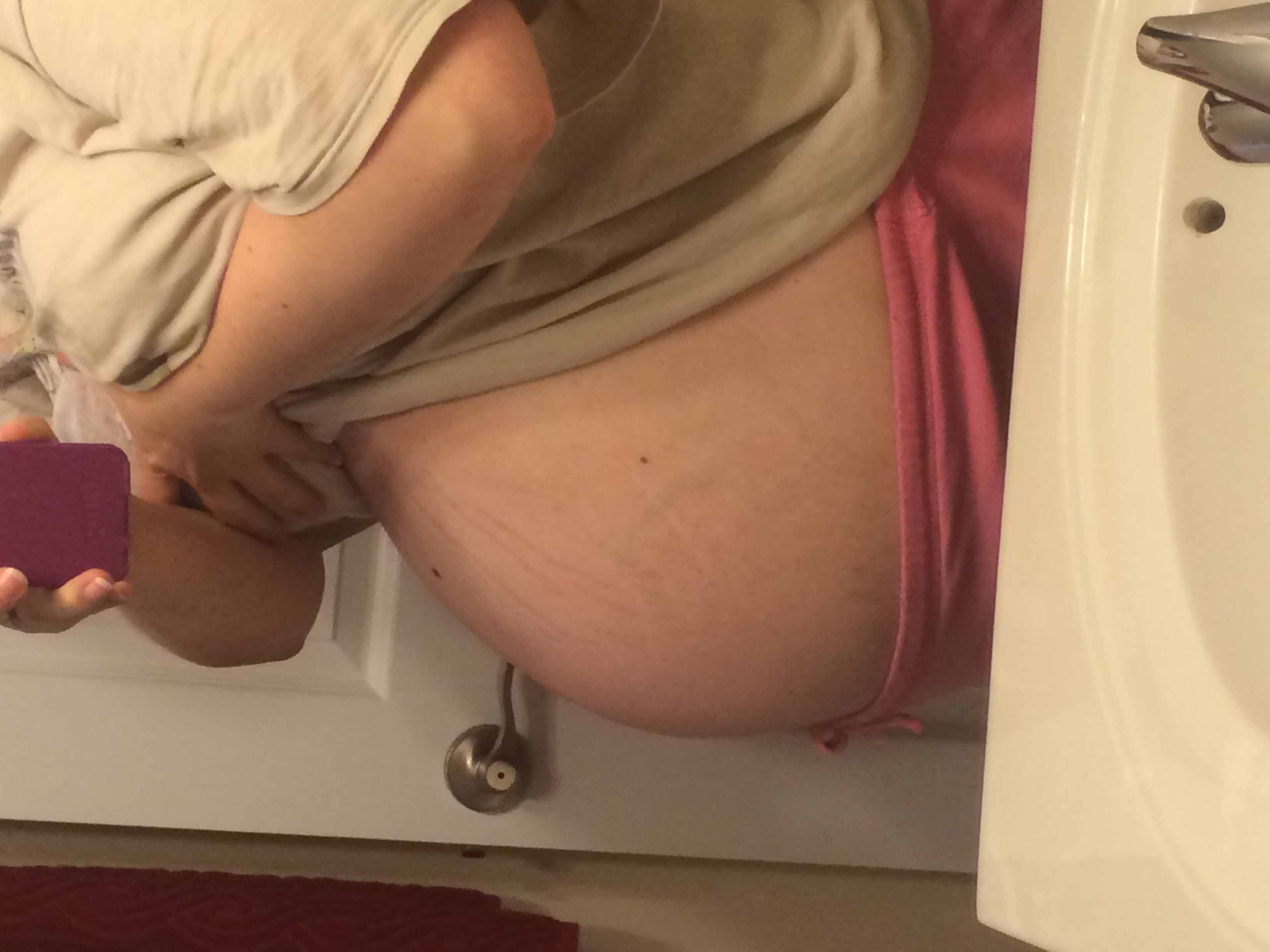34 wks 4 days:-) it's crazy how I can see her rolling around in there & body parts stick out!!! Dh is kinda weirded out by it but I'm loving watching her move:-D