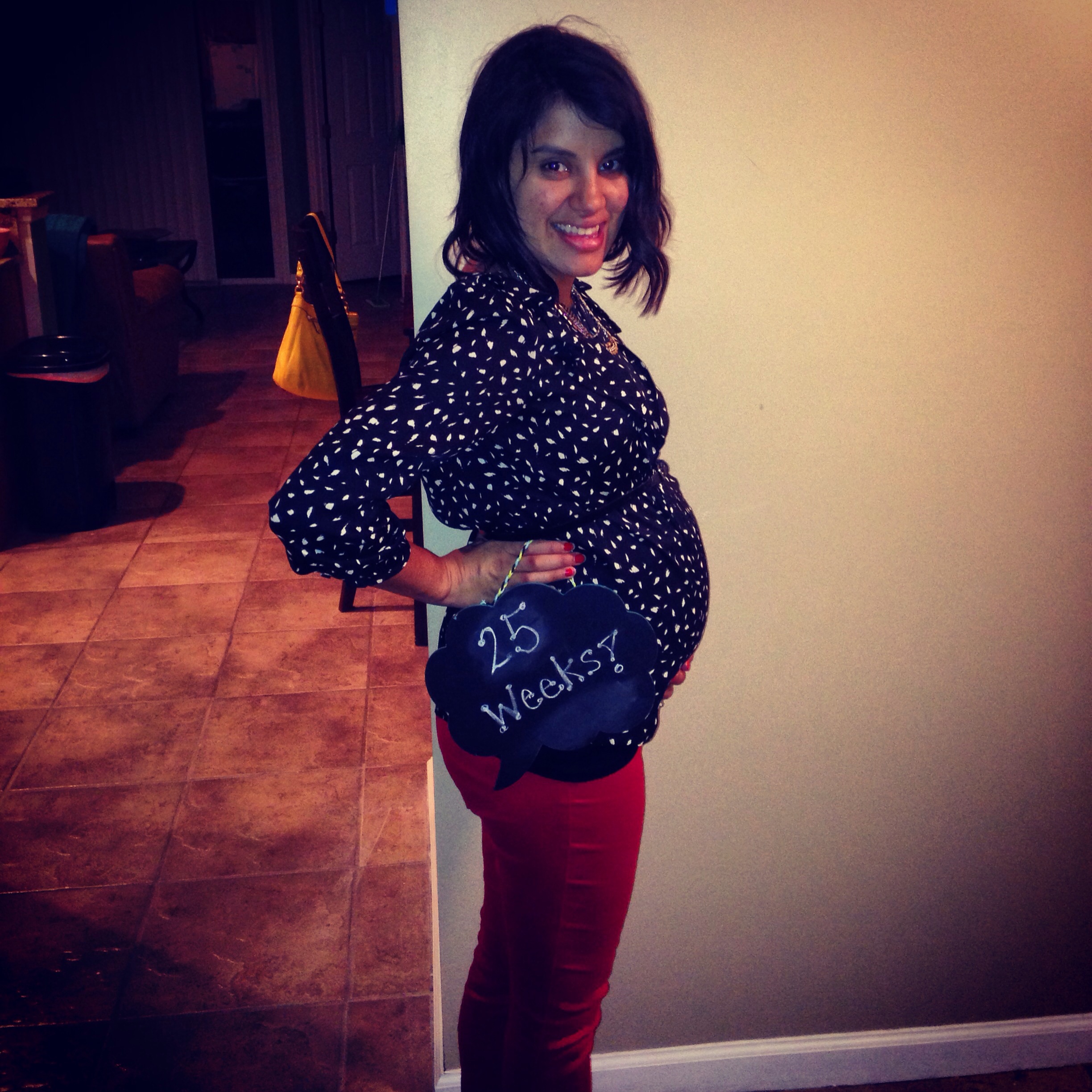 25 weeks...this past week got really uncomfortable. Although I look lower than when pregnant with DD, this kid won't get out of my ribs! Boo!