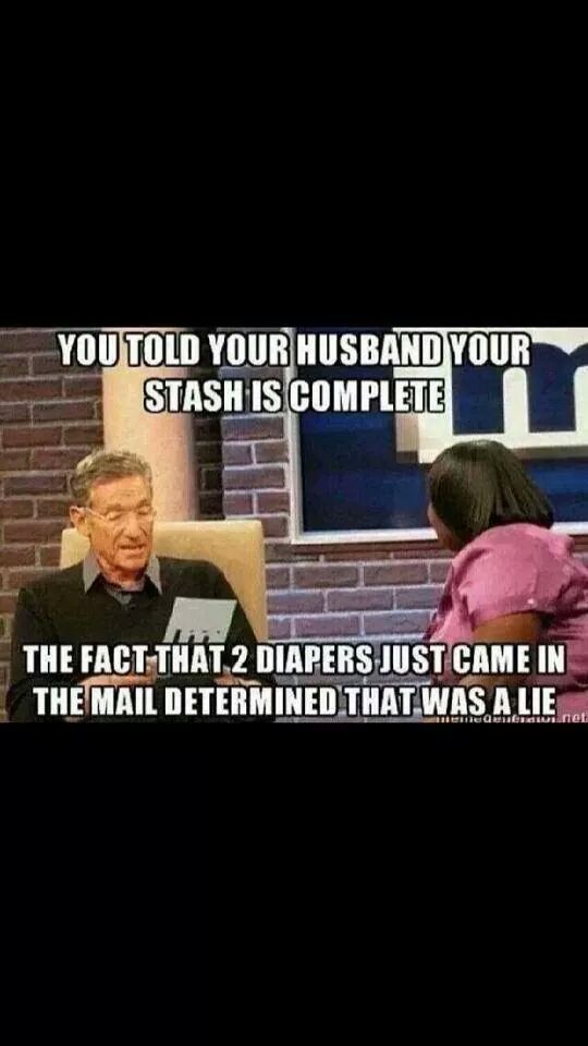 I showed dh a picture of a stash shot on a different site that covered a whole pool table.....dh stood there in awe.....then ds1 came over and dh showed him the picture and said "That's a diaper stash!!!!" Ds1's response: "That's lovely, but if you keep standing in the doorway I'm going to need one."