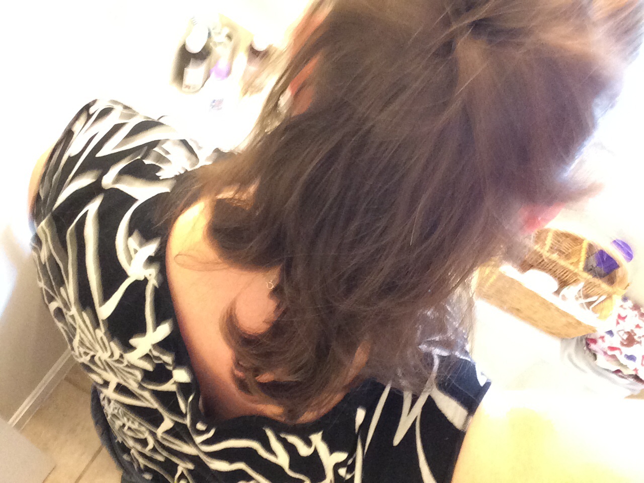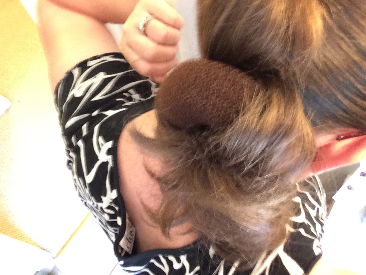 I pull my hair into a pony and then follow the tutorial's instructions to move the donut thingie to the end of my pony tail and start rolling.