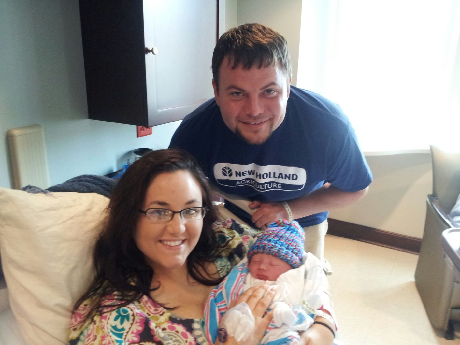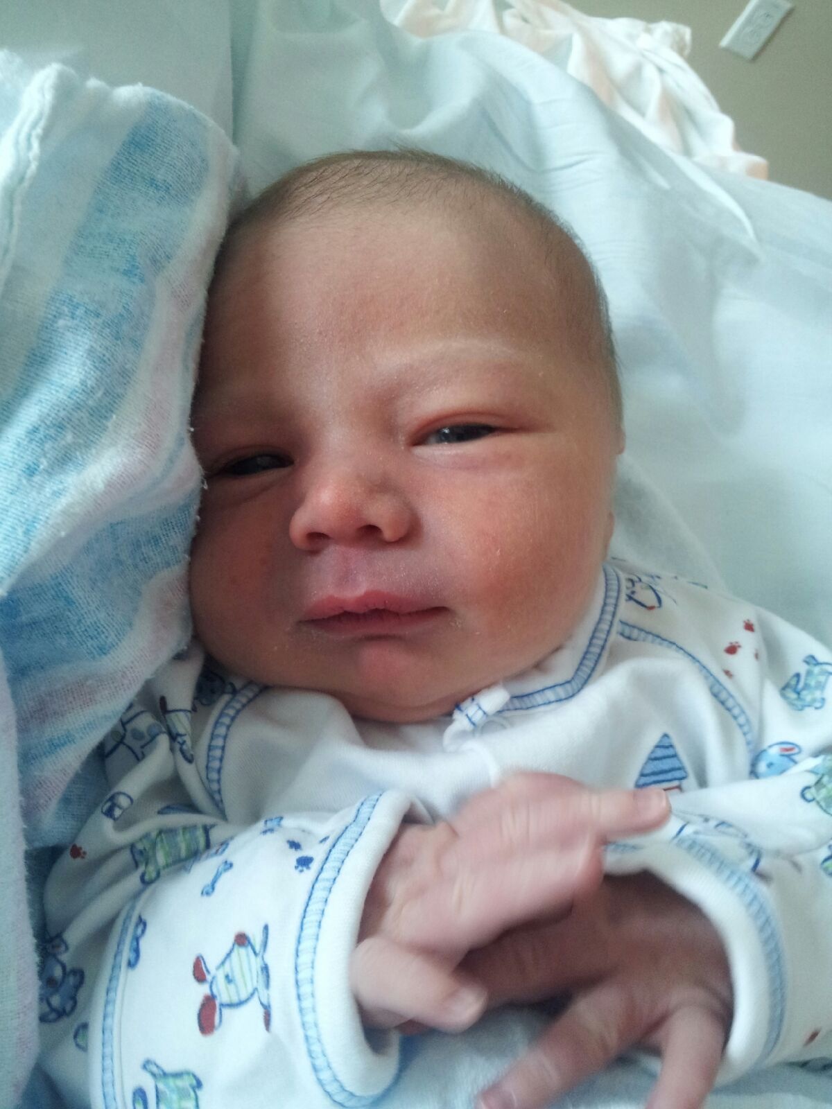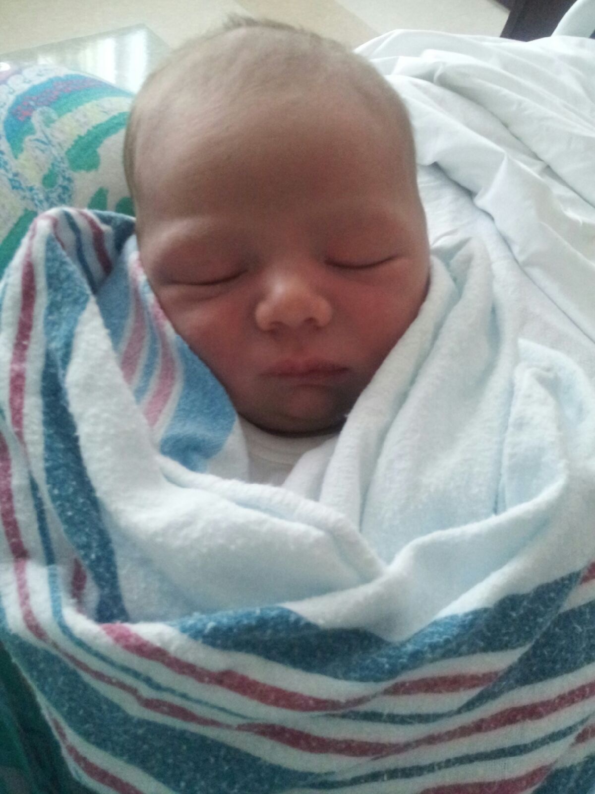 "At 4 Monday morning I lost my plug 4:48 my water broke, immediately horrible back labor started. We hurried to get to the hospital an hour away my contractions were 1 min apart and we made it, barely, here at 6:01. I previously had said I wanted to try going without an epi and use alternative methods of pain management. By the time we got here I was dilated to 8 and they let me know real quick I couldn't have anything passed 7cm. My heart sank. So immediately they moved me across the hall at 6:10 I was 10 cm dilated and needing to push. My Momma made it quickly behind us, my fab ob Dr. Lady was wonderful. I was in 9 kinds of hell, after pushing till 7 they didn't tell me but his head was out and the cord had wrapped his neck and his heart rate plummeted. I pushed one more time and Baylor Michael made his appearance at 7:03! I hadn't had drugs for pain, less than 2 hrs of sleep and a whirlwind labor with possibly a cracked tailbone but happy to report a healthy boy 7lbs 13 oz 20 1/2 inches long. We are asking for prayers, I've caught a NASTY stomach bug in the hospital and I've had to supplement this morning after breastfeeding since his birth. This virus has no mercy and you may go on yourself before you realize you breathed. Hoping to go home this afternoon and that no one else gets this!"