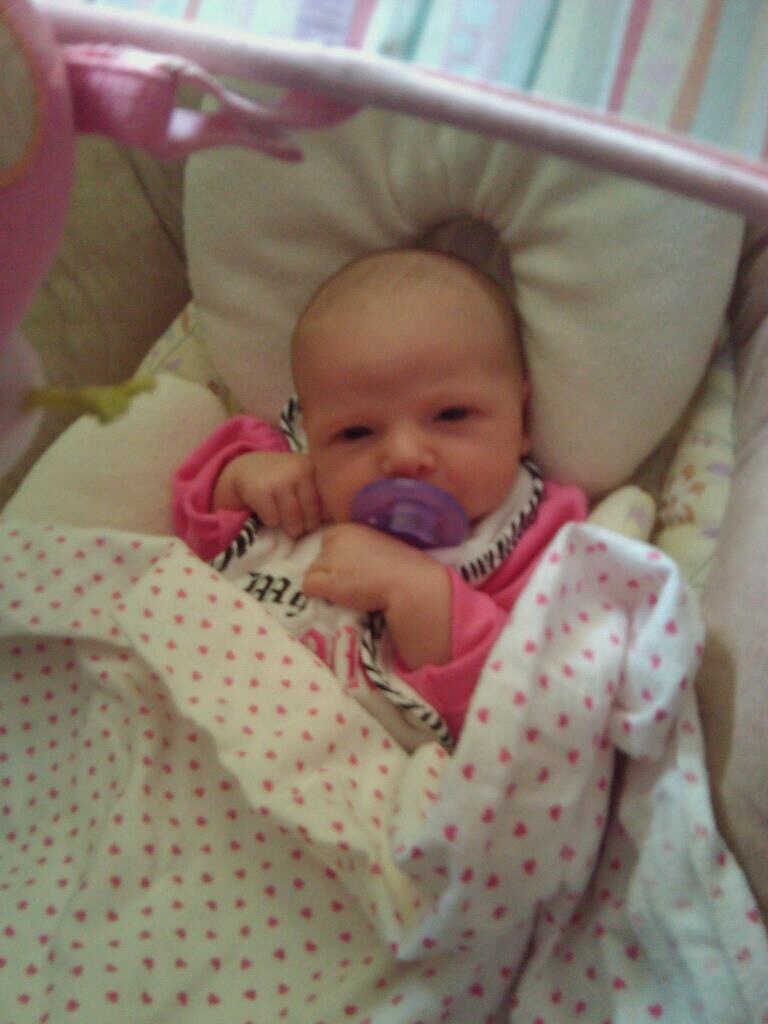When she was born I didn't think she looked like either if us. She came out with curly blonde hair and blue eyes but I guess all babies have blue eyes. Dh and I both have straight brown hair and brown eyes. My mom says she looks exactly like me as a baby though and she's bringing my baby book over to prove it. :) LO and I were the exact same birth weight which I think is kind if neat.