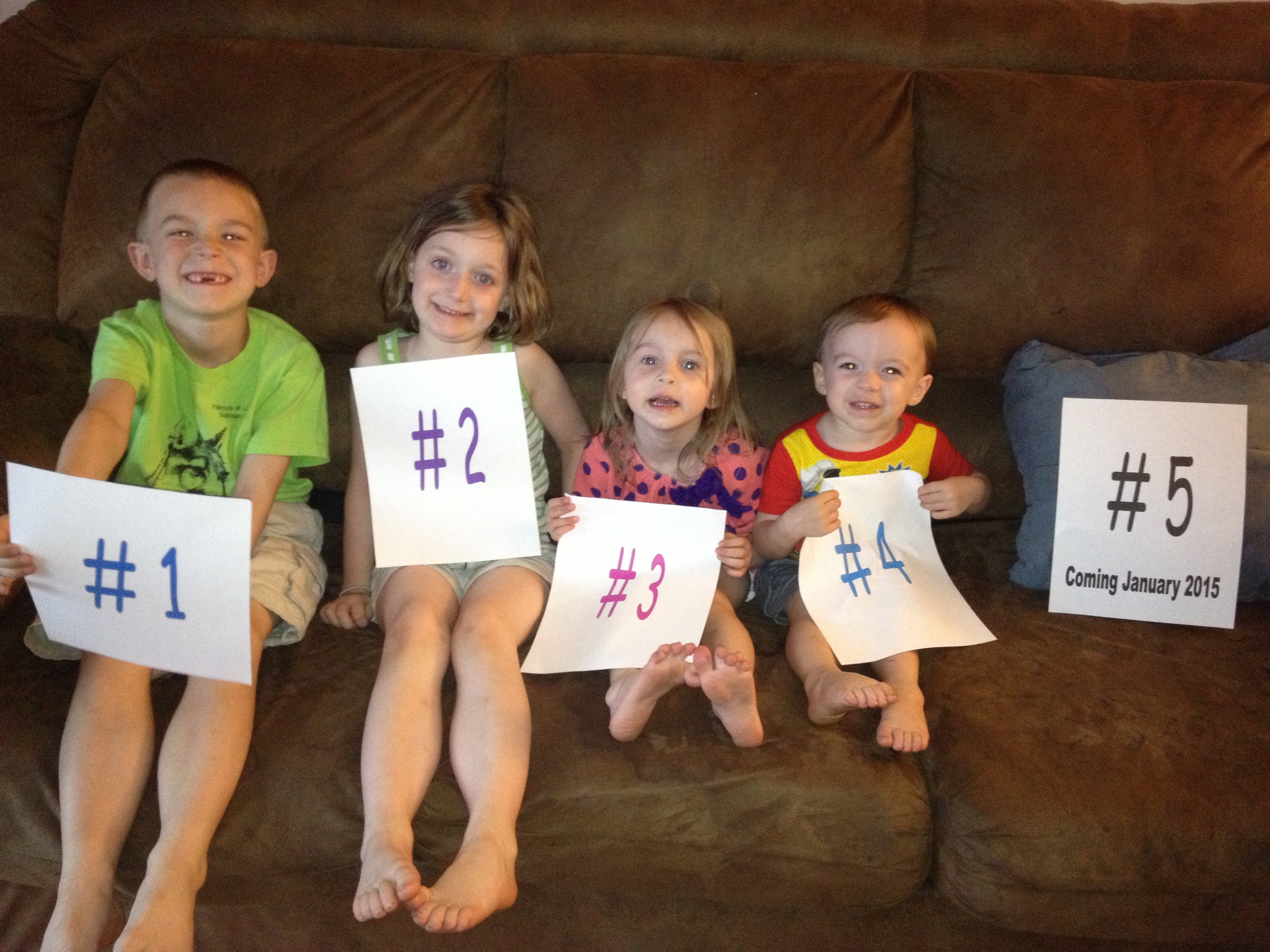 This is how we announced, I thought I was 6 weeks but when I went in for u/s we were only 4. Scared me! But now we are 13 and besides normal pregnancy issues (sickness, tired, mood swings) everything seems to be fine! We got a lot of congrats and then a few "again" or "you know how babies are made right". This is baby #5 and I love having a big family. I just turned 27, so I think this may be our last. Our other kiddos are 7,6,4,2.