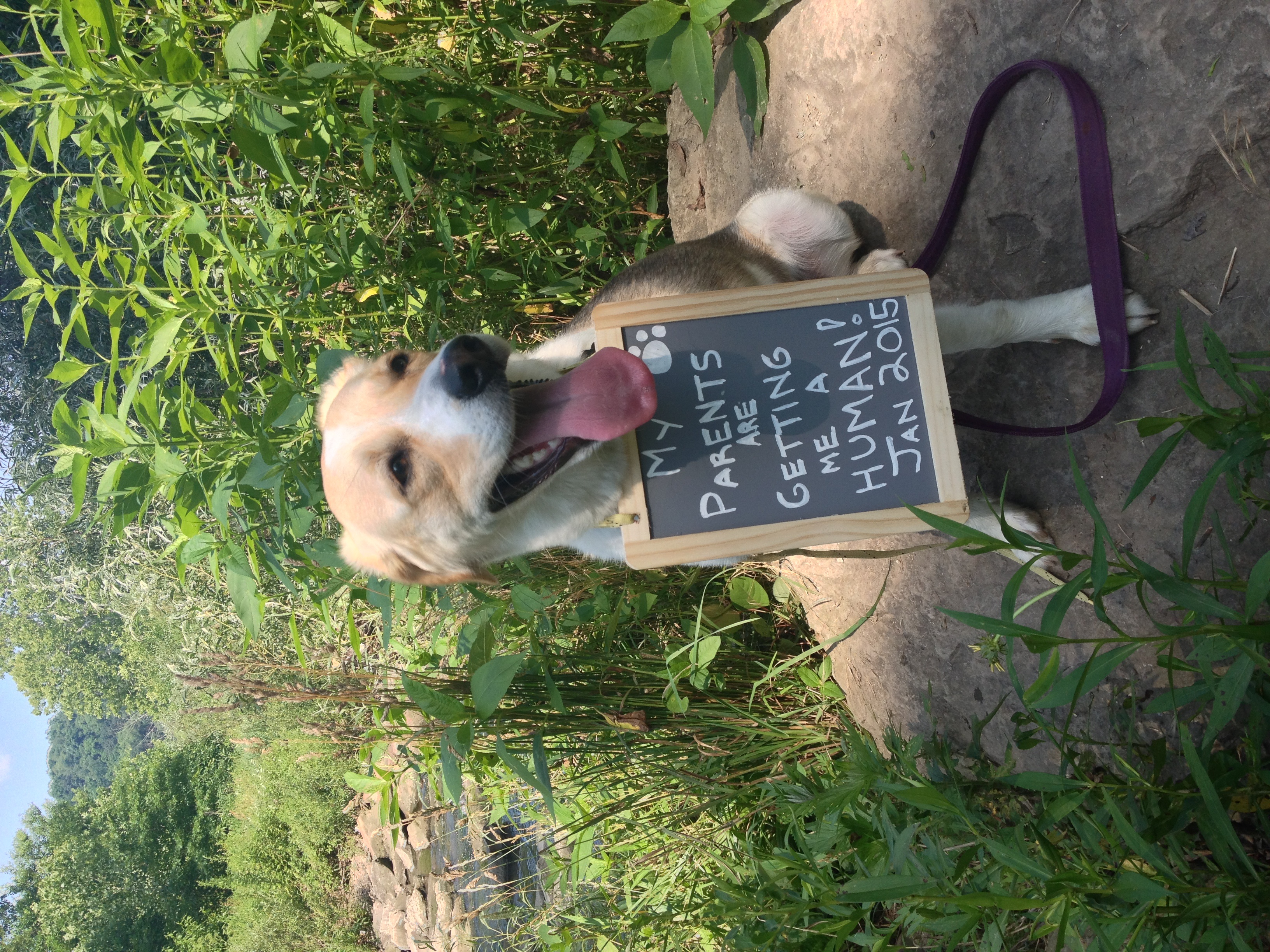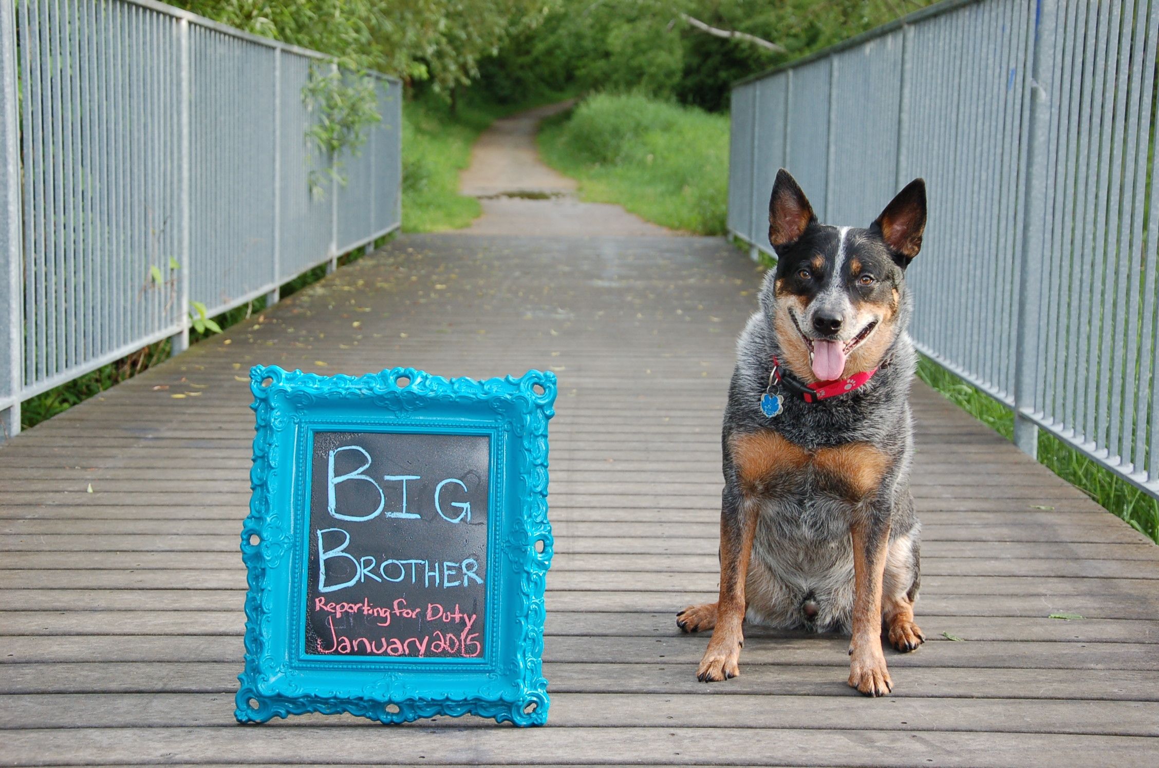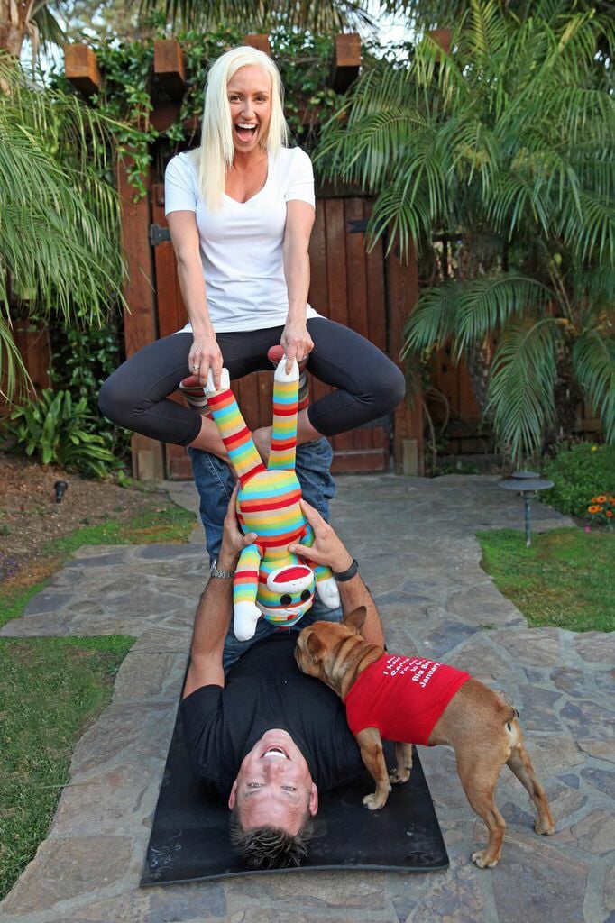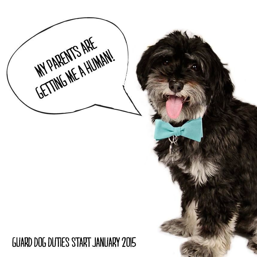 We both teach yoga and made a fun announcement card to mail to our family and friends 'the birthing pose' with a monkey (baby nickname). It was easy to include our dog, we also made another photo of him wearing the shirt 'I'm being going to be a big brother Jan 2015. We thought it was pretty funny:)