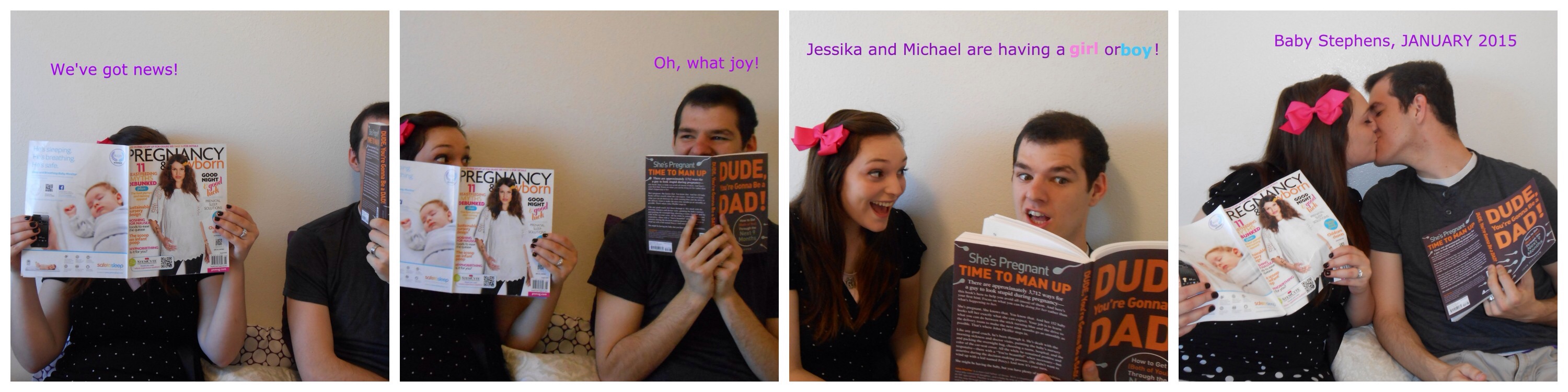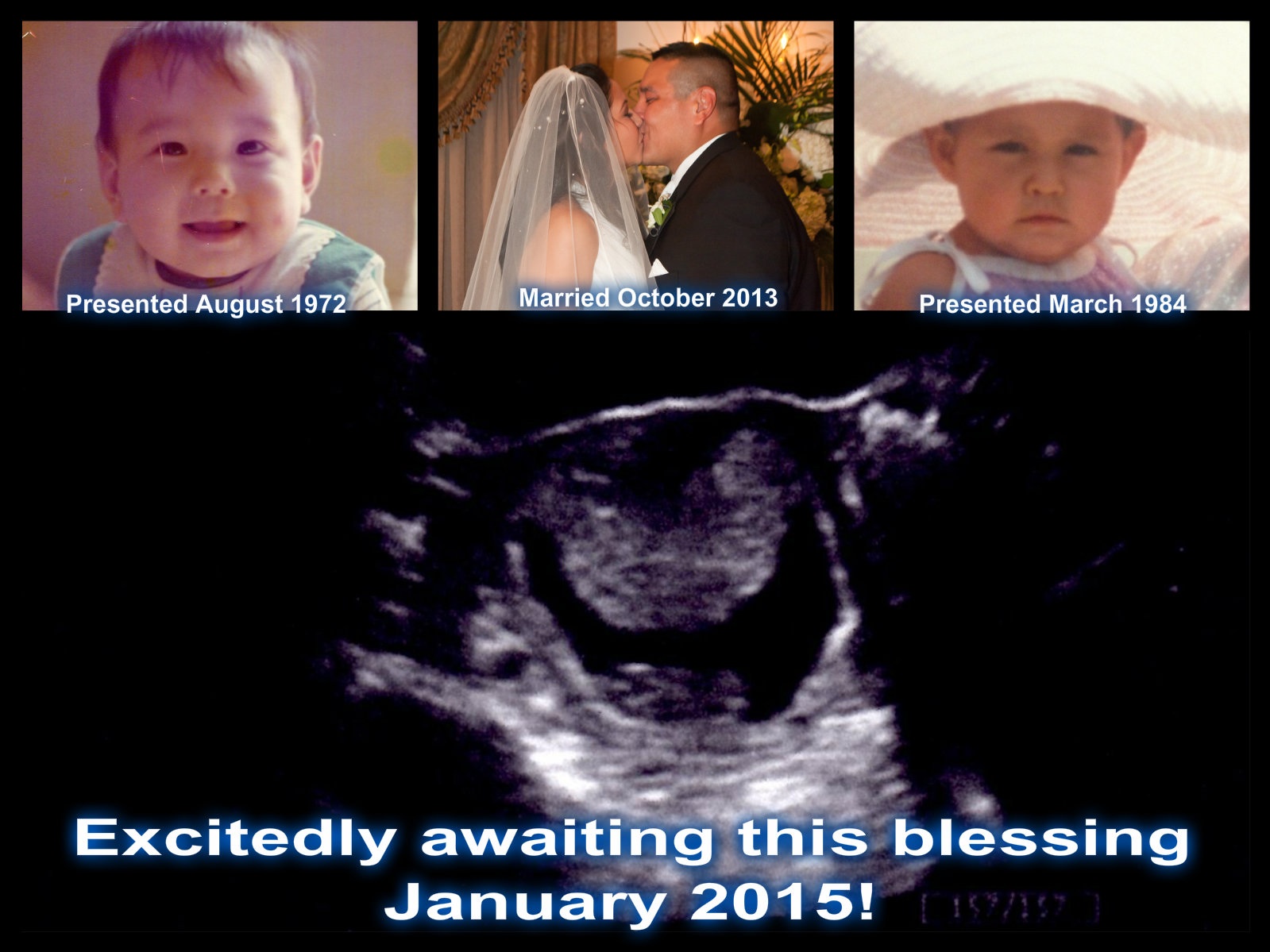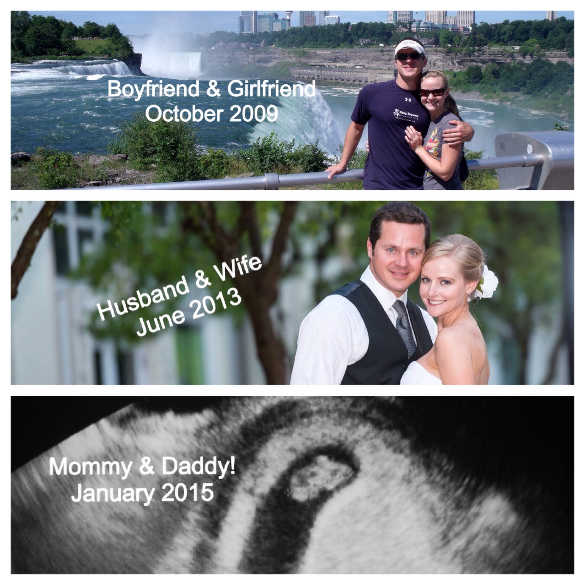 Between 11 and 12 weeks we decided to post on Facebook for our extended family and friends. I made a collage photo of us when we were dating, at our wedding, and the ultrasound picture with dates of those major milestones in our life. I attached the picture below.