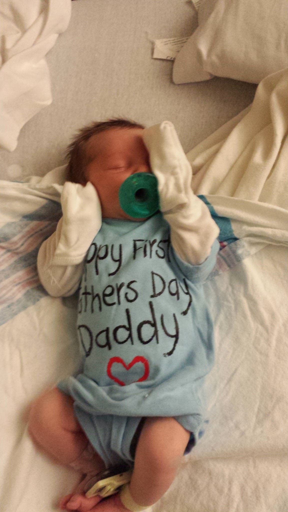I had spent all night Friday the 13th puking (which was not unusual for me as I'd been battling severe GERD and middle of the night puking since 26 weeks).  Saturday morning I was woke up at 7am by my father in law trying to do a video call to my phone at 7am and the again at 7:30am.  DH is an early riser and usually goes to do the grocery shopping early on Saturdays.  After the two interuptions I decided to jump in the shower and then maybe go with him to the store and get some more miles in... When I went to situp out of bed my back started cramping pretty bad.  I had these "zingers" off and on for days so didnt think much of it and just waited til it passed.  In the shower, the zingers started coming one after the other.  I made it a long shower since at the hospital tour they had said that hot showers can help induce labor...by the time I got out, they were coming every 5 minutes.  DH didnt know that I had gotten up and he had left to the store without me!  I stayed as calm as could be, wanting to make sure that if I called him home it was for the real deal.  I got dressed, blowed my hair out, and put on my make up.  I grabbed the "Happy First Father's Day" onesie and stuffed it and my chargers in my purse and texted DH that he should probably not take his sweet time (grocery shopping for him is a 3-4 hour ordeal with multiple stores on the list) and that he should check out and come home (8:15am).