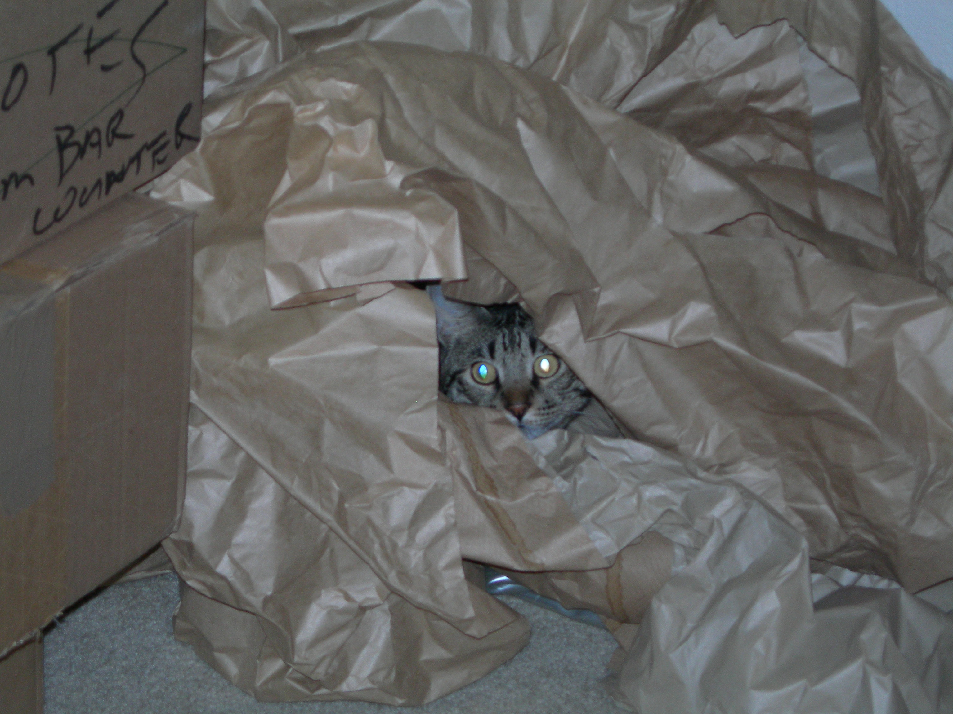 When we were moving, we were like, "Where's Rocco?" Oh, he has buried himself under the packing paper. haha