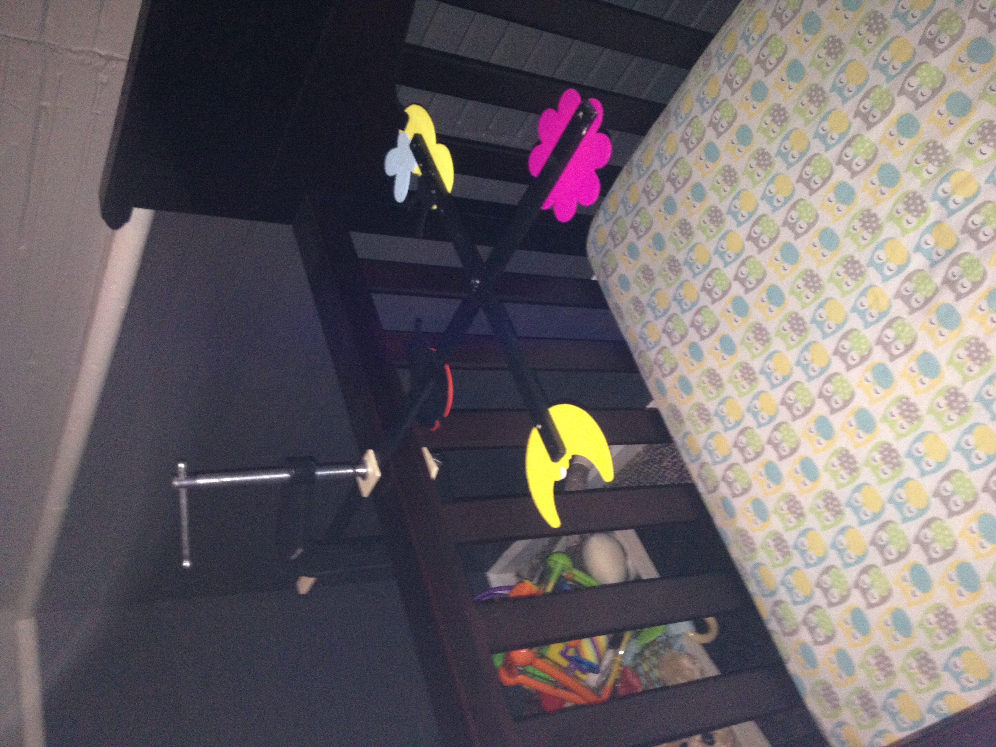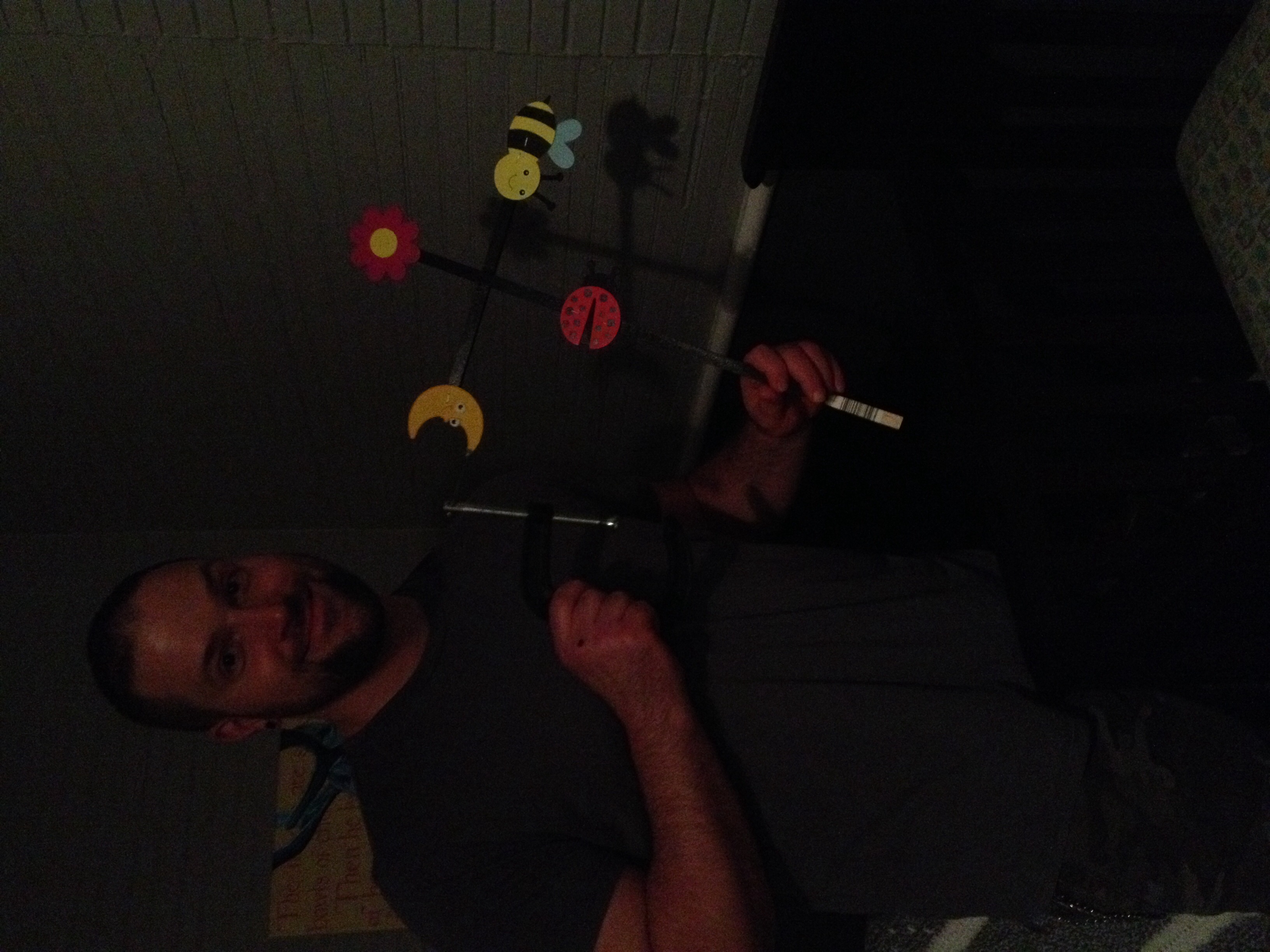 Hours later, I have one rough mushroom shape finished. Whittling is hard, probably harder than sewing, and a terrible idea. DH, after much swearing and frustration, proudly affixed his mobile to the crib. Clearly we have more than one artist in the family:
