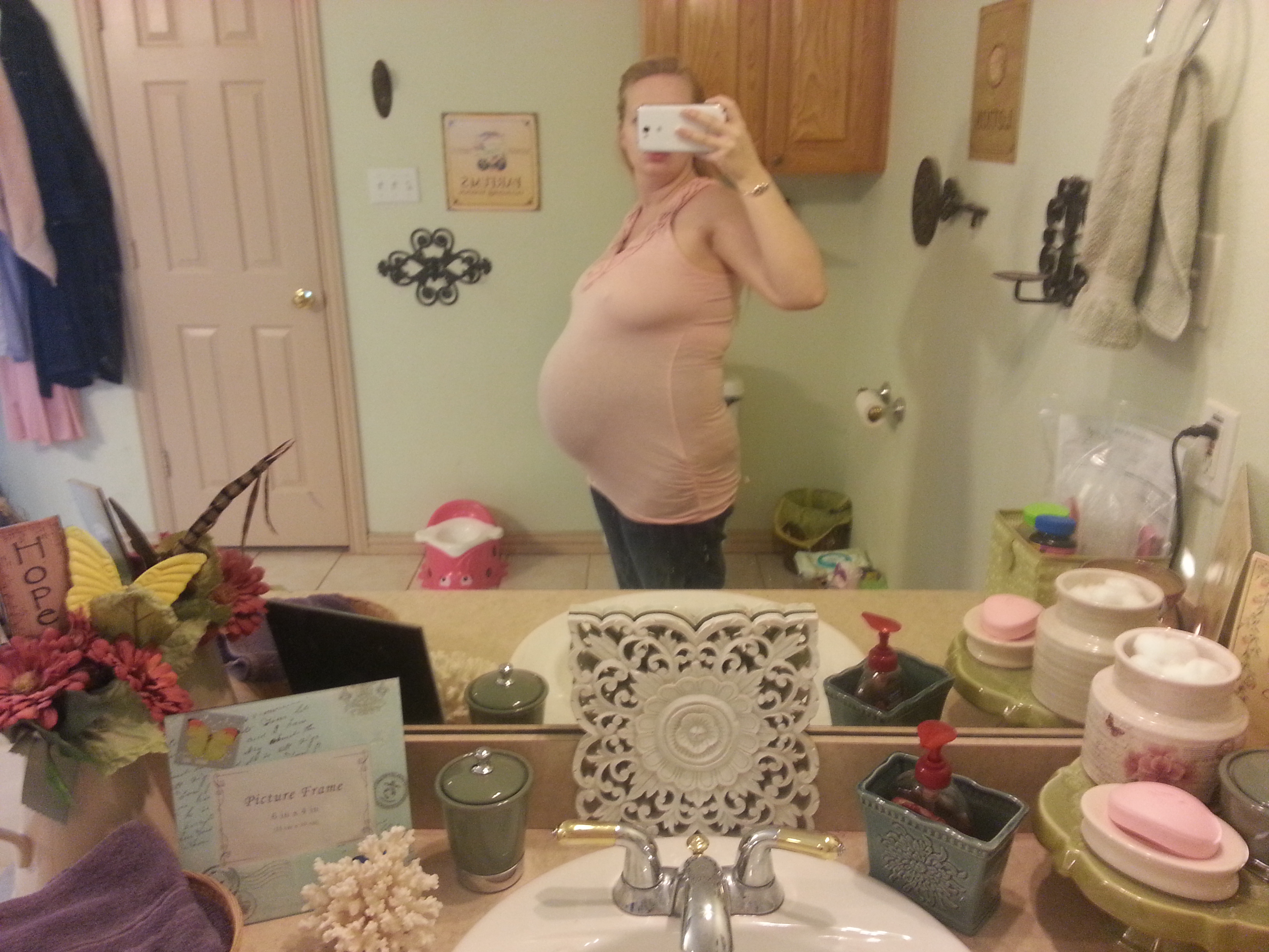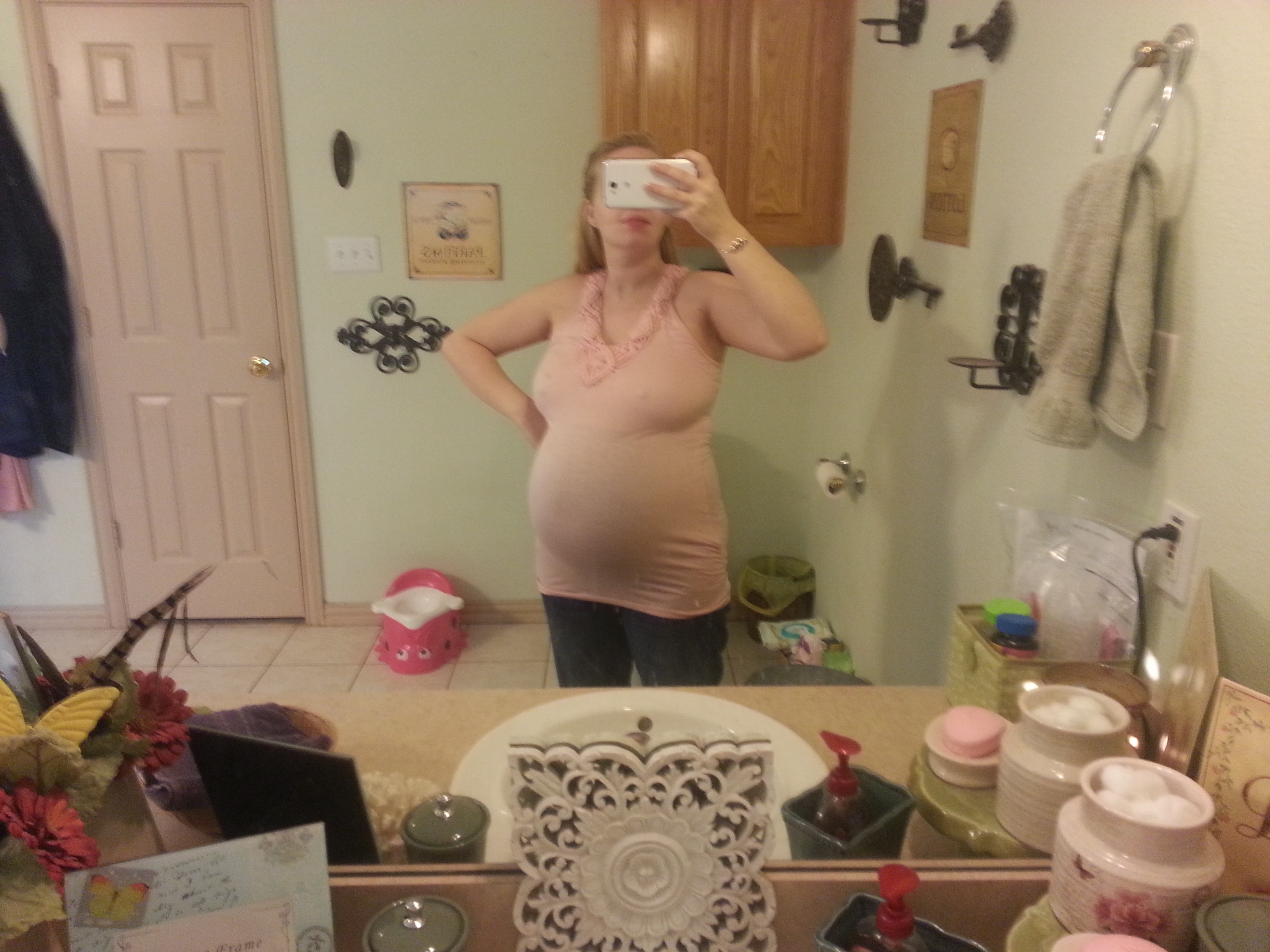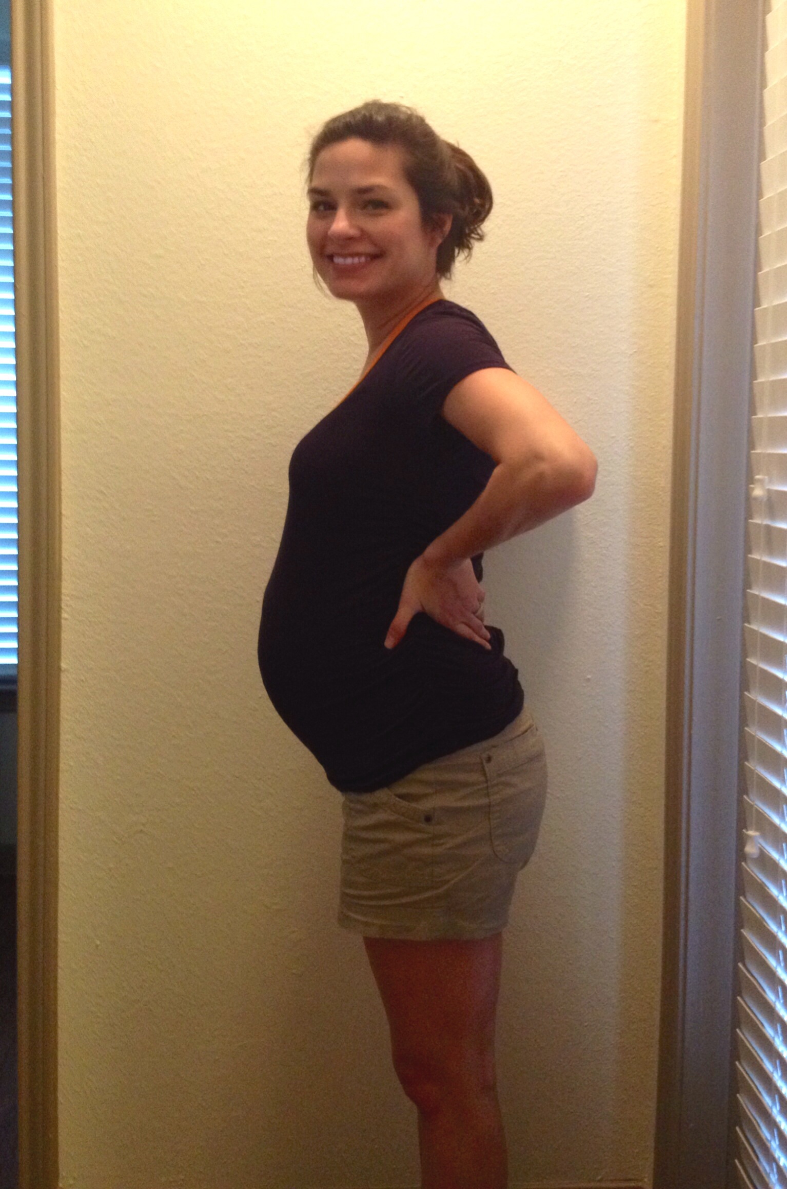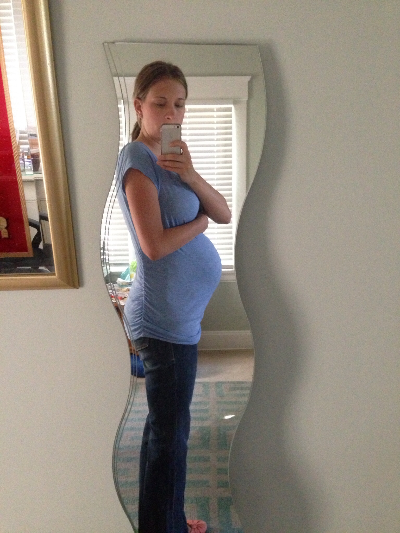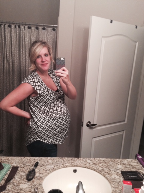 33 weeks! This is my 3rd. Hubby says he thinks my bump is bigger and I am smaller this time. Usually I look pregnant all over! I also attached one of my weird lopsided bump!! This happens when I have a Braxton Hicks! Anyone else?