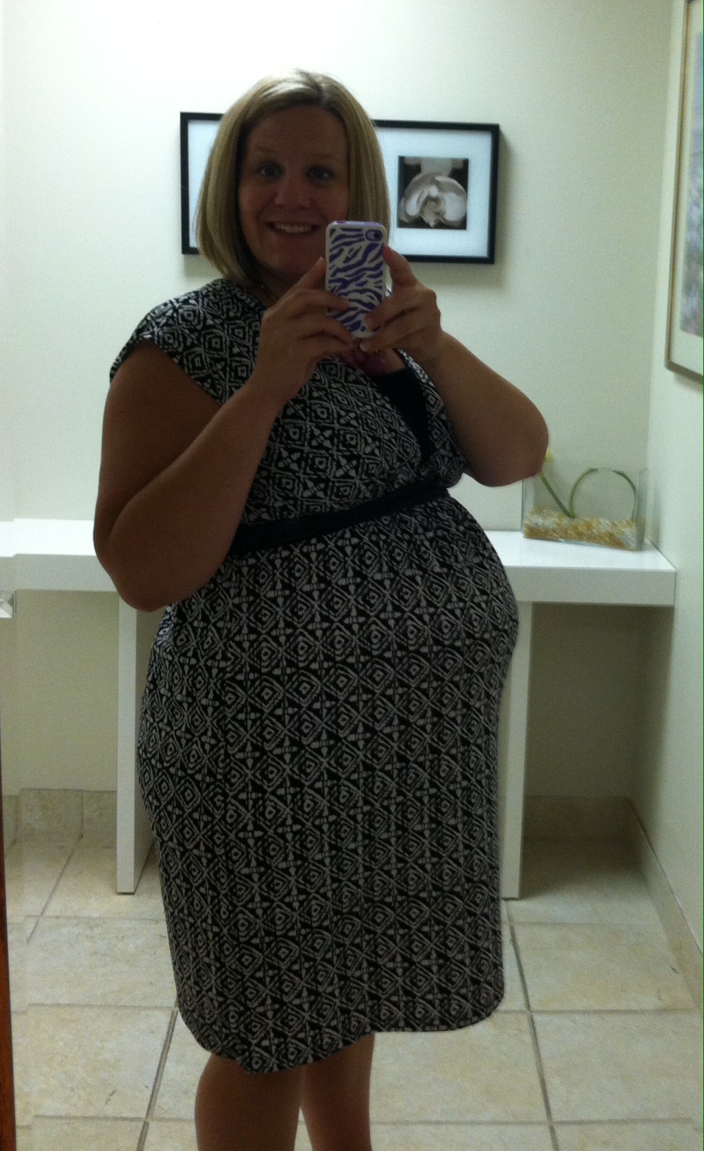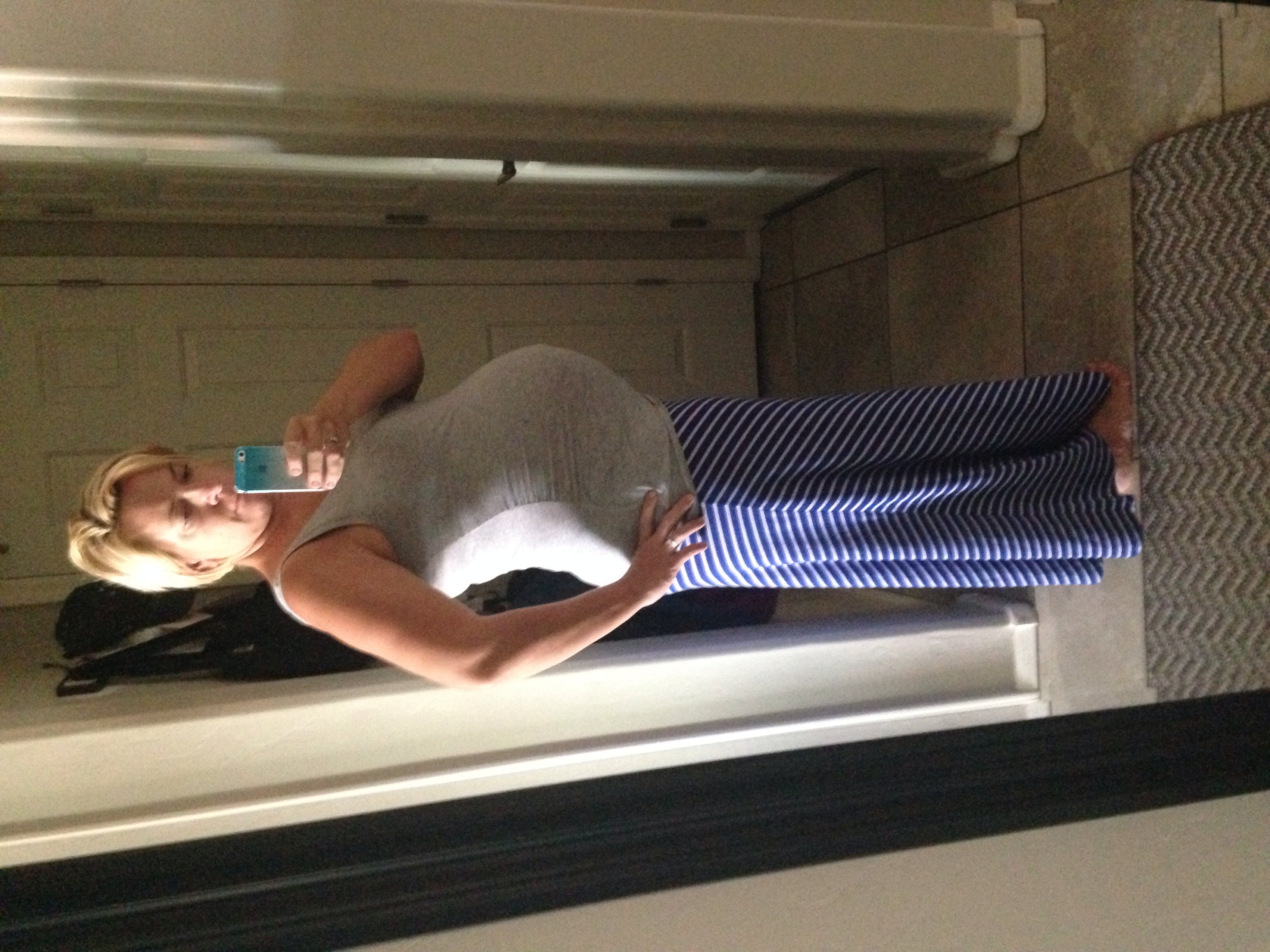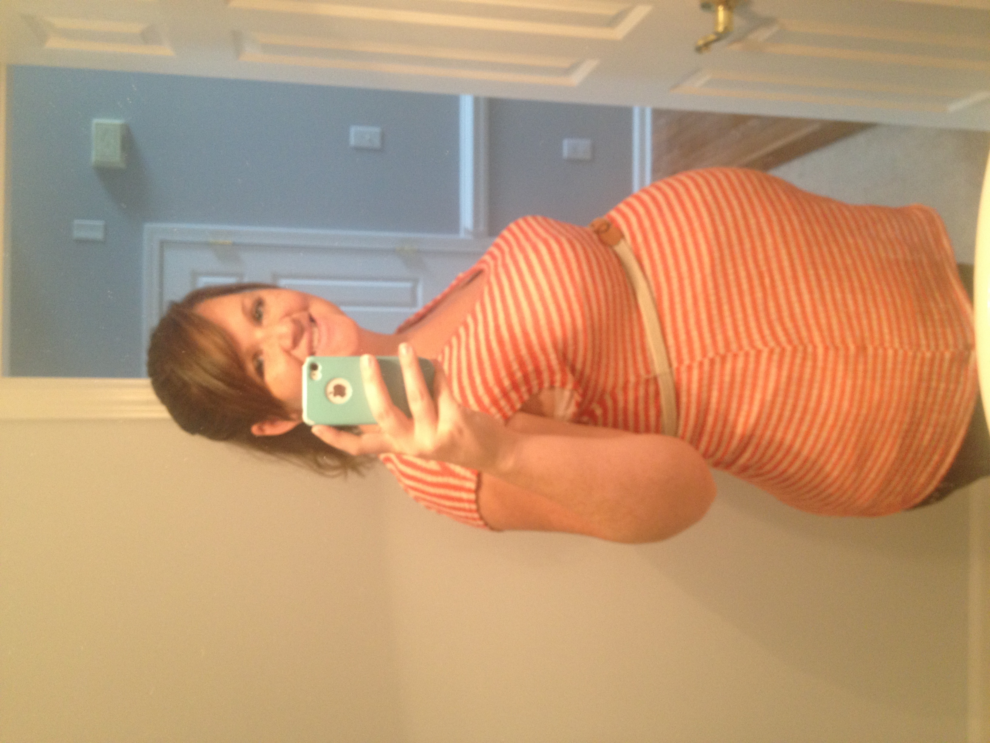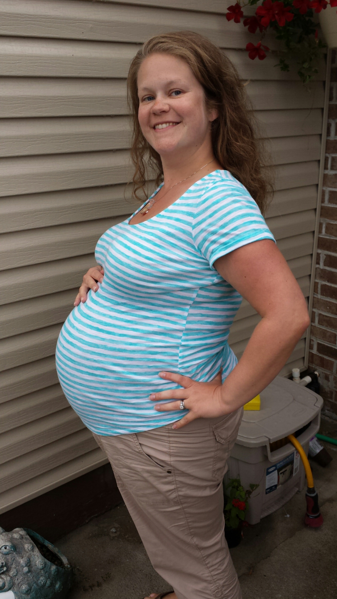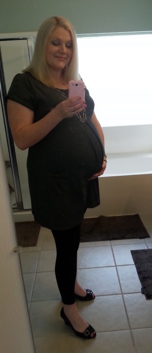 33 weeks! This is my 3rd. Hubby says he thinks my bump is bigger and I am smaller this time. Usually I look pregnant all over! I also attached one of my weird lopsided bump!! This happens when I have a Braxton Hicks! Anyone else?