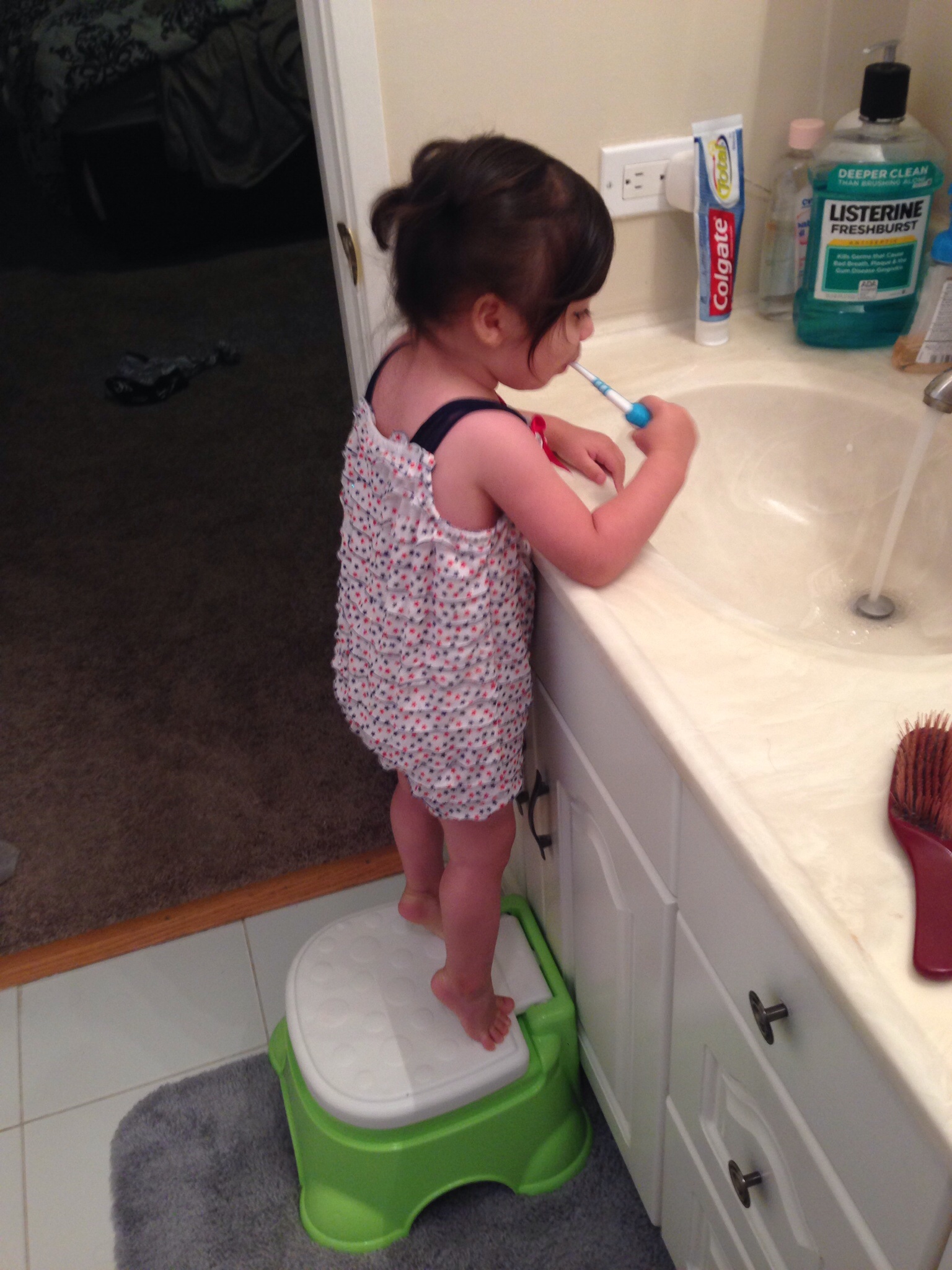 • O has gone on the potty a few times in the last week. We also CD and she wakes up dry pretty often. We are ways away from trying undies, but so far she is getting more comfortable with the concept. She has one that plays short songs when she goes and it makes her smile so big. It's also a step stool and once the little pee/poo receptacle is removed, she drags it everywhere and gets into everything. She especially likes the sink.