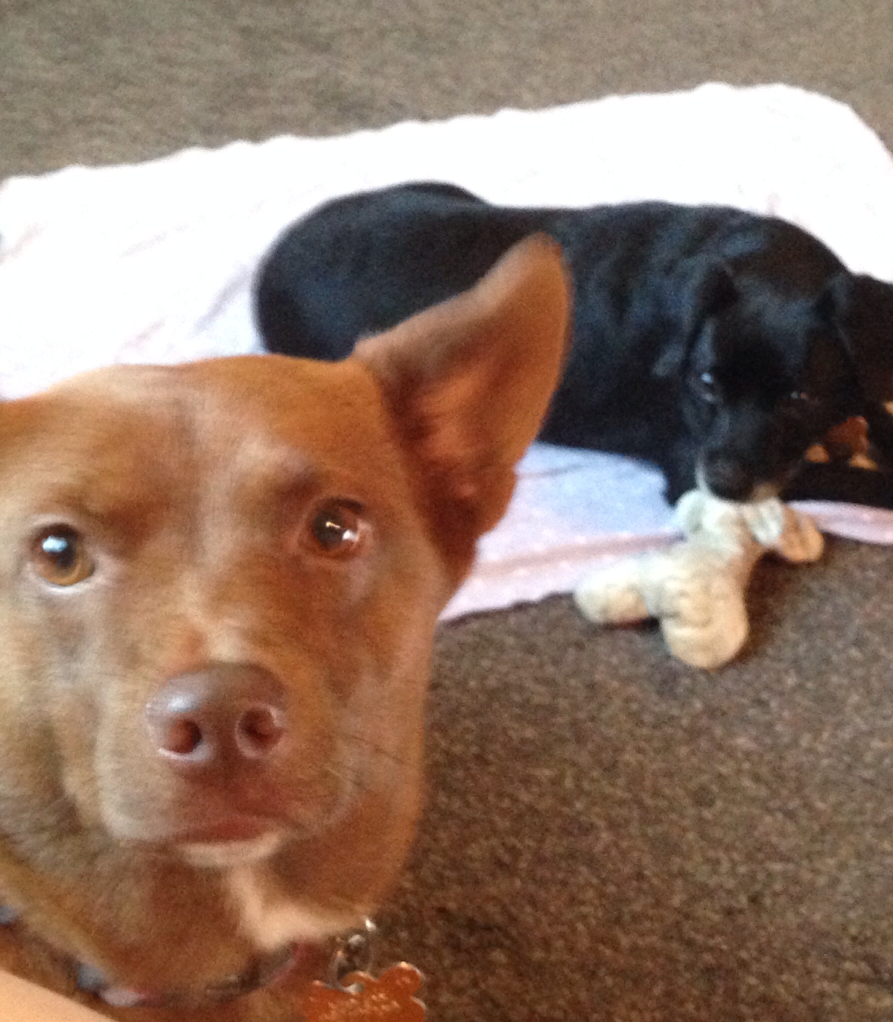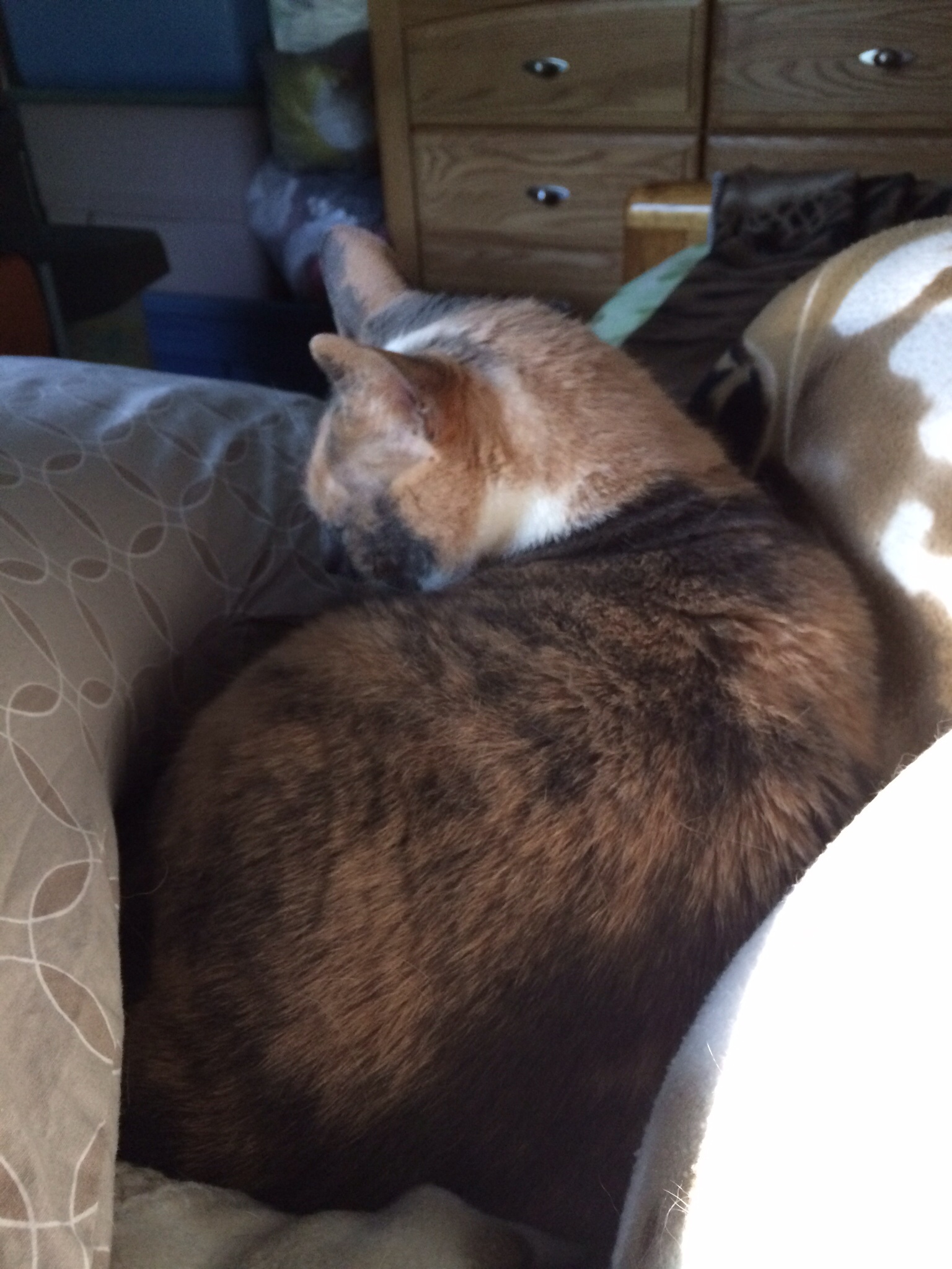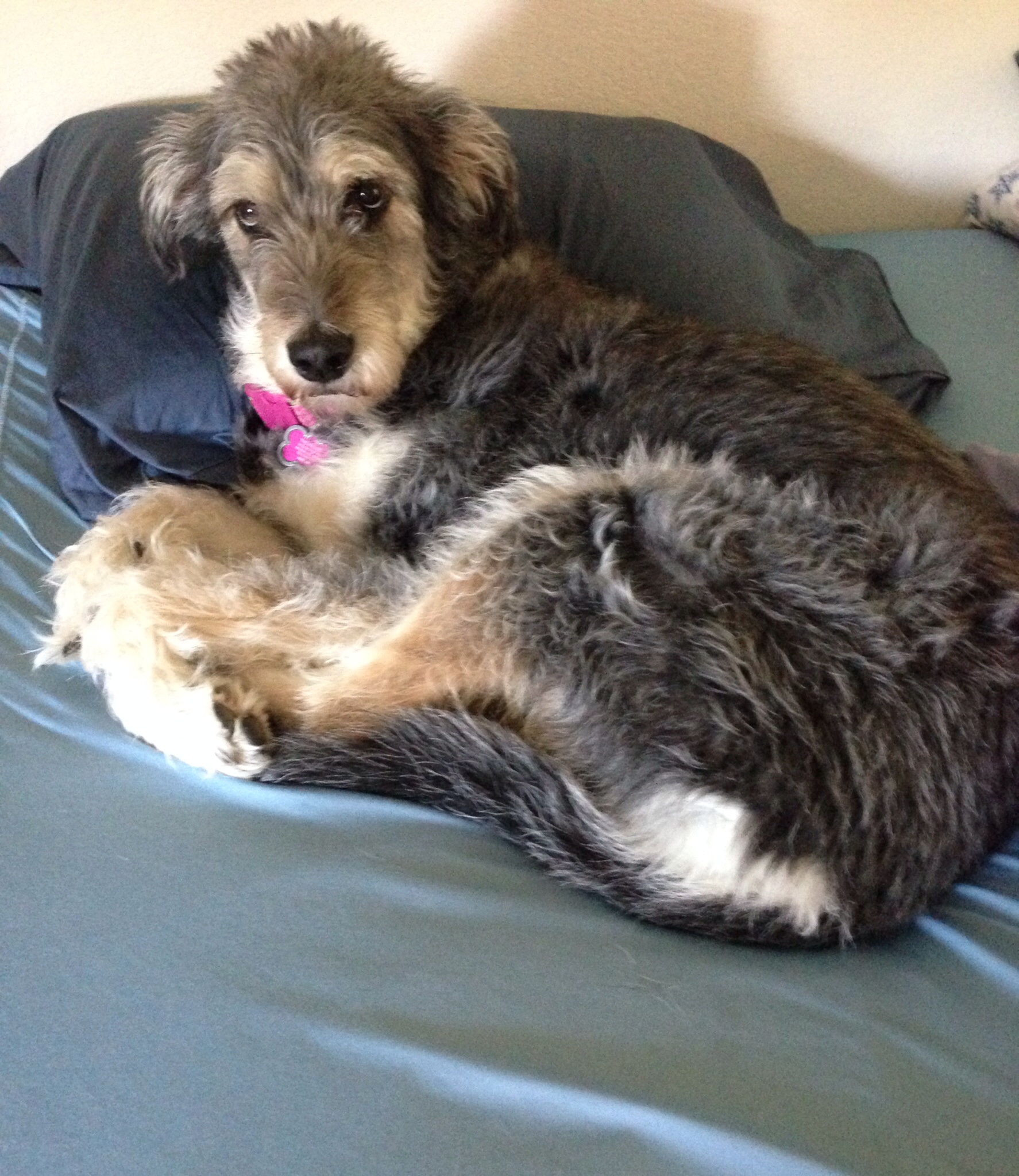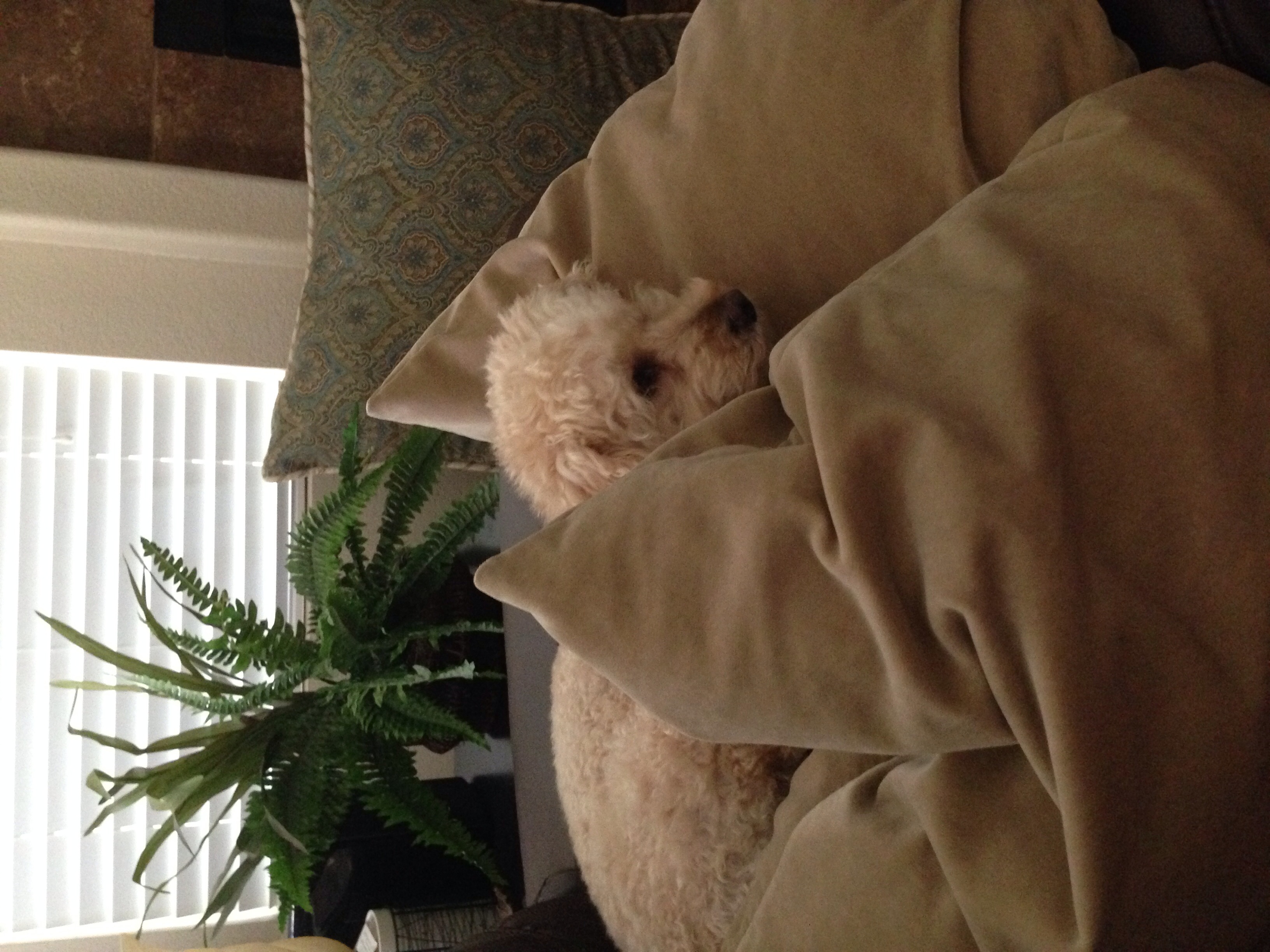 Another left out doggy over here, getting snuggles from pillows instead of me.