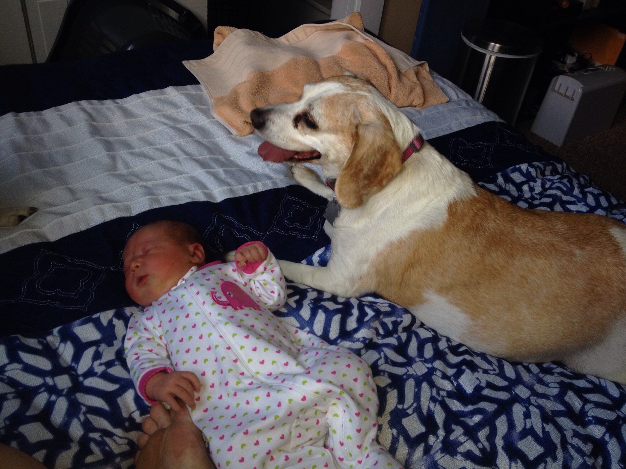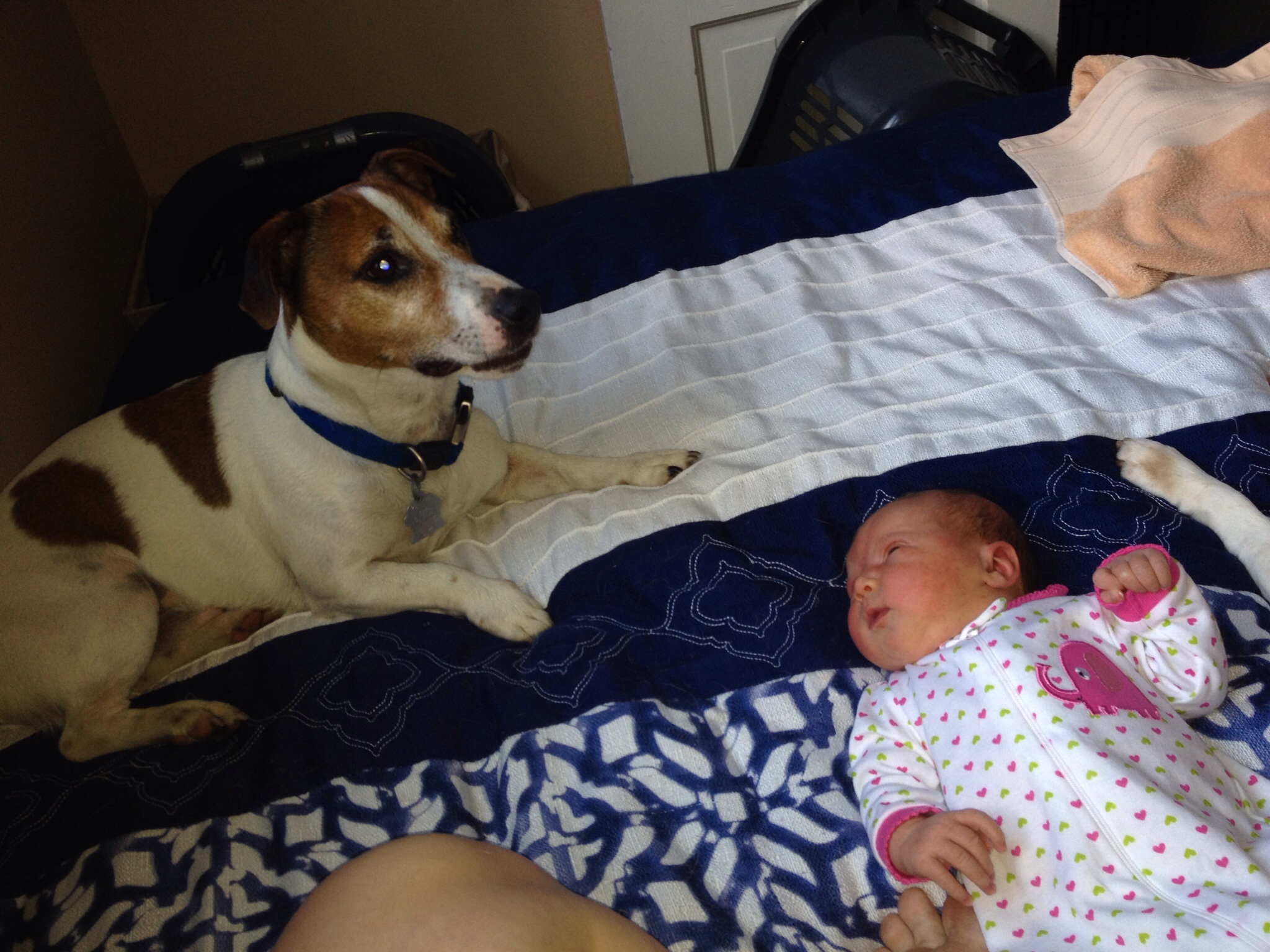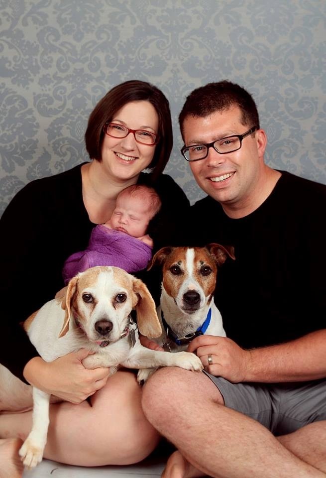 This is when Baxter & Elly met DD for the first time. They are feeling a bit neglected as well, but we try every day to have some cuddle/play time with each of them. Plus Baxter gets extra cuddles at feeding time cause he snuggles up under DD legs. Also, the family pic from our newborn photo shoot...