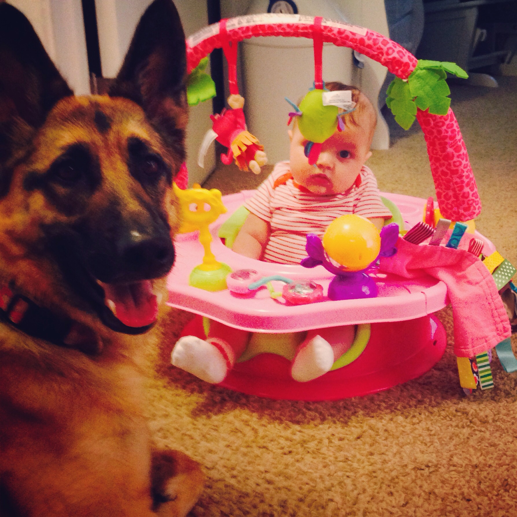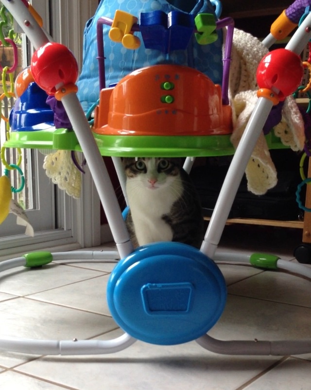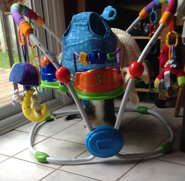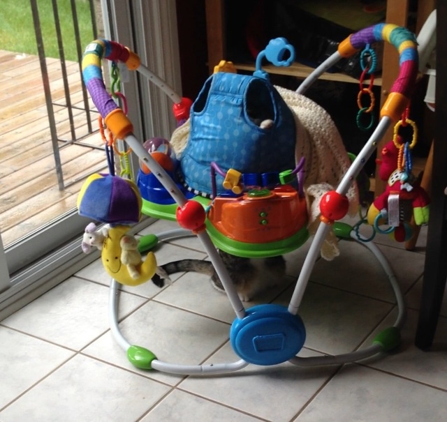 Mr Kitty playing with LO's Baby Einstein bouncer.