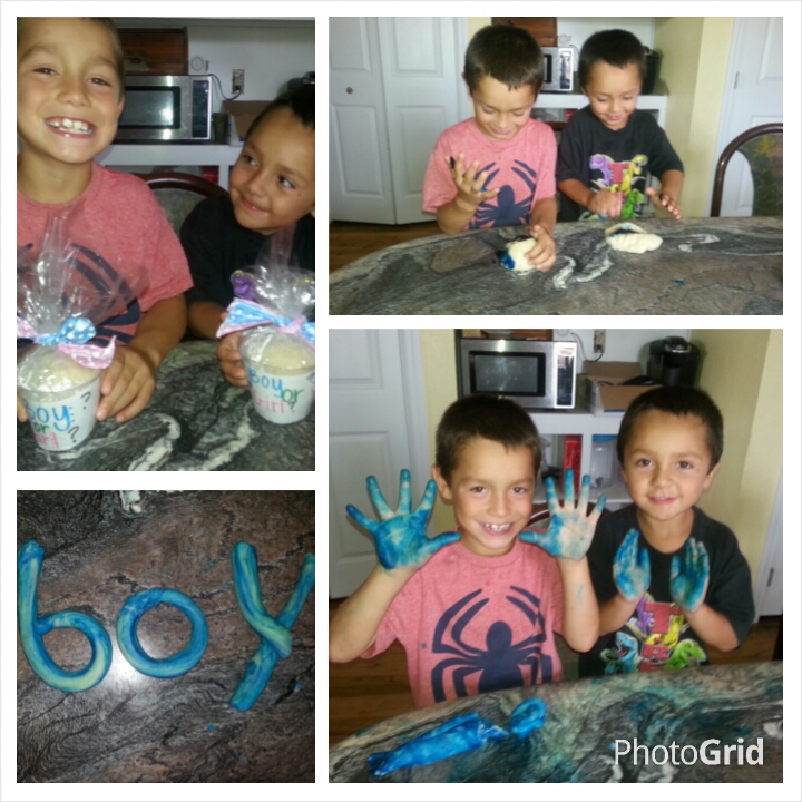 I told myself I wasn't gonna AW this but I am way excited. A/S was today and after weeks of anxiety found out we were having healthy Boy #3. So I made white playdoh and filled it with blue food coloring and the boys mashed it to find out they were having a little brother. Here's the pic we used for facebook