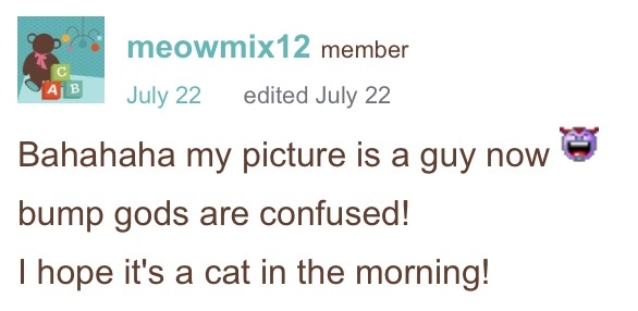 @meowmix12 Now it's the teddy bear and blocks that I use. (3:30am) It's confusing me to be scrolling and see my avatar places I know I haven't posted. Lol.