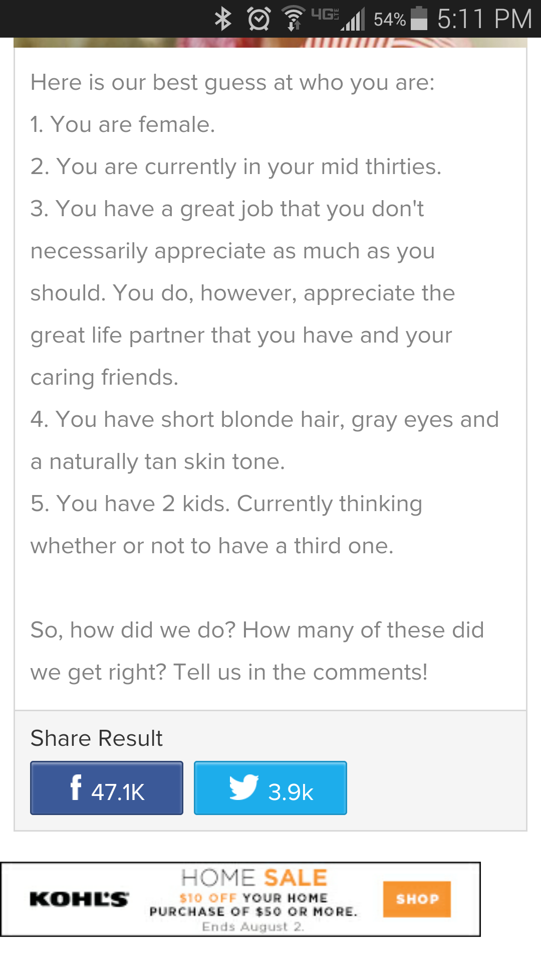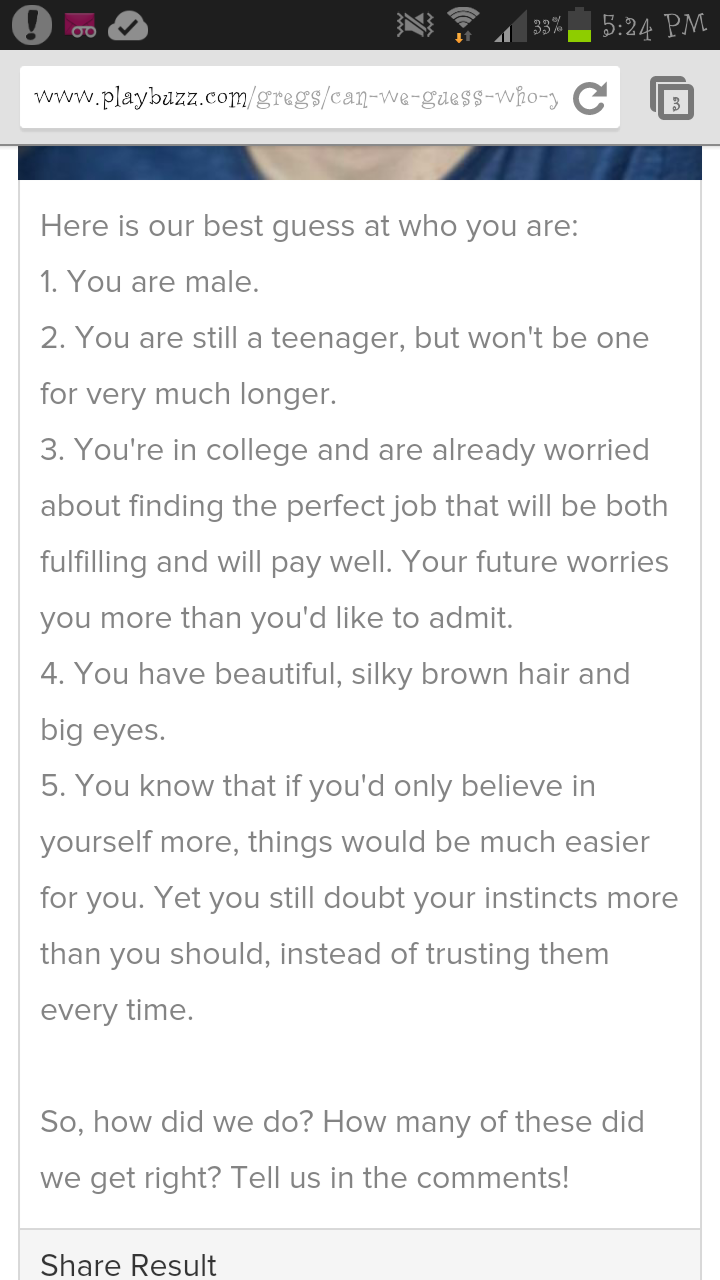 I just took this dumb quiz on FB and it was pretty accurate. It got my hair color wrong but everything else was spot on! I figured I would share since the board is slow.