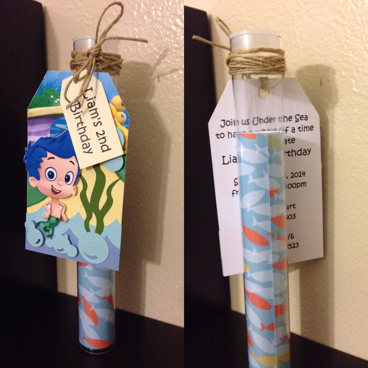 • We are having a Bubble Guppie/ Under the Sea theme for Liam. His invite will consist of a tube filled with actual gold fish crakers.