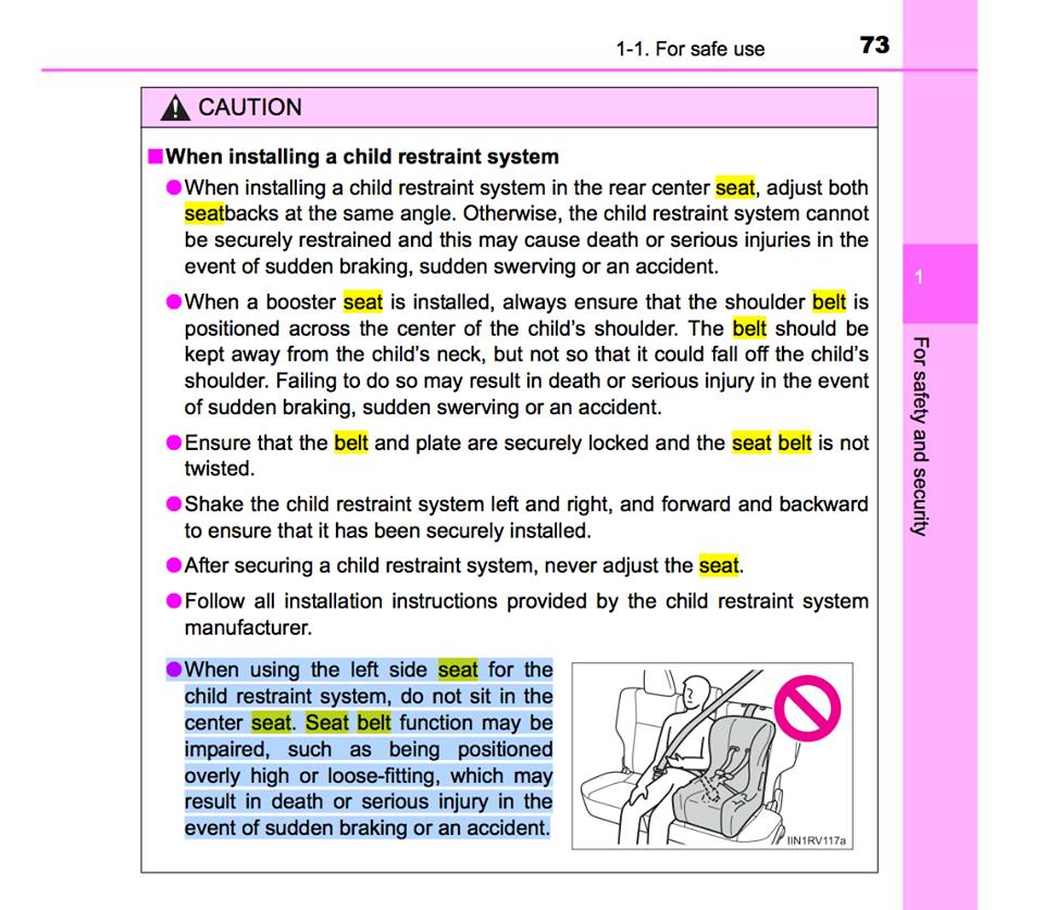 @sillygirl85 This is from the Rav4 manual. Now, it specifically says not to use the side seat when a child seat is installed in the middle BUT if you read it, it's because the seat blocks the other user's seatbelt, just like a human sitting in the seat would. The seatbelt for the other seat comes literally from the buttcrack area of the person sitting on the seat next to it and that means the belt geometry is changed.