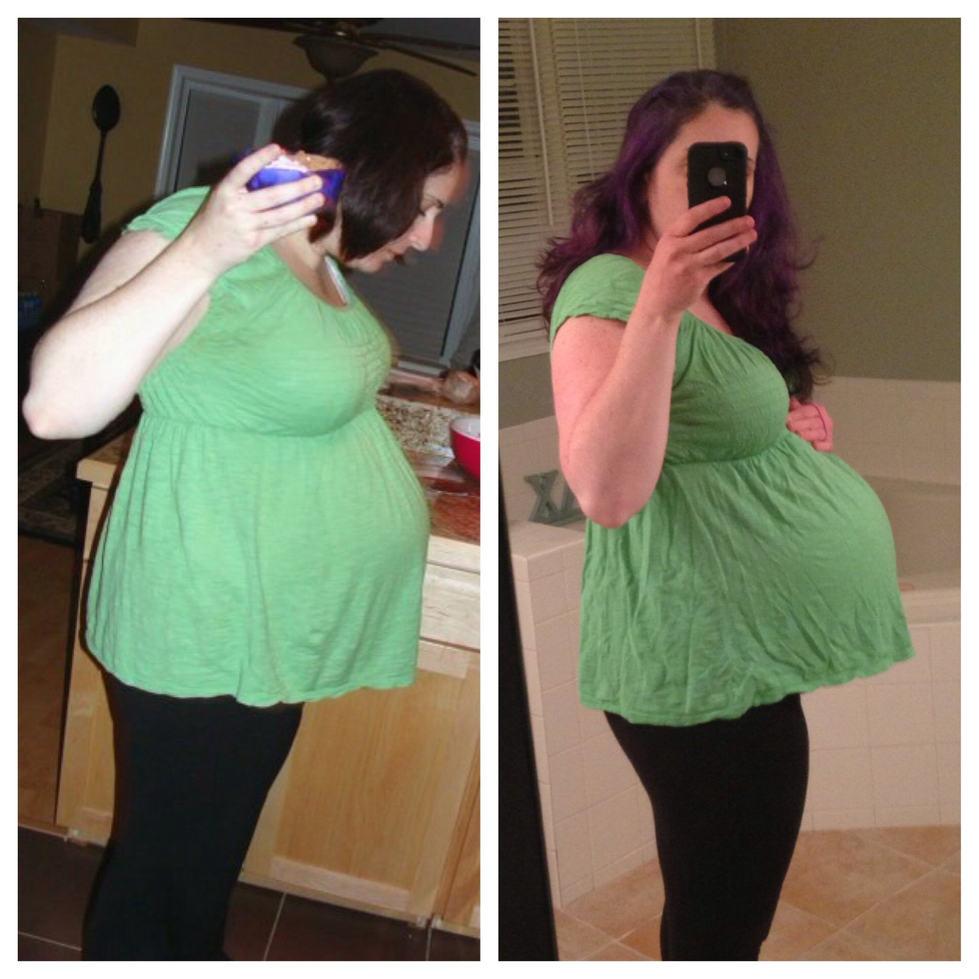 The pic on the left is two days before my due date with my first pregnancy and the one on the right was today at 4 days before my due date. Luckily I still have the same beat up old shirt to compare lol. I'm definitely way more belly this time around.