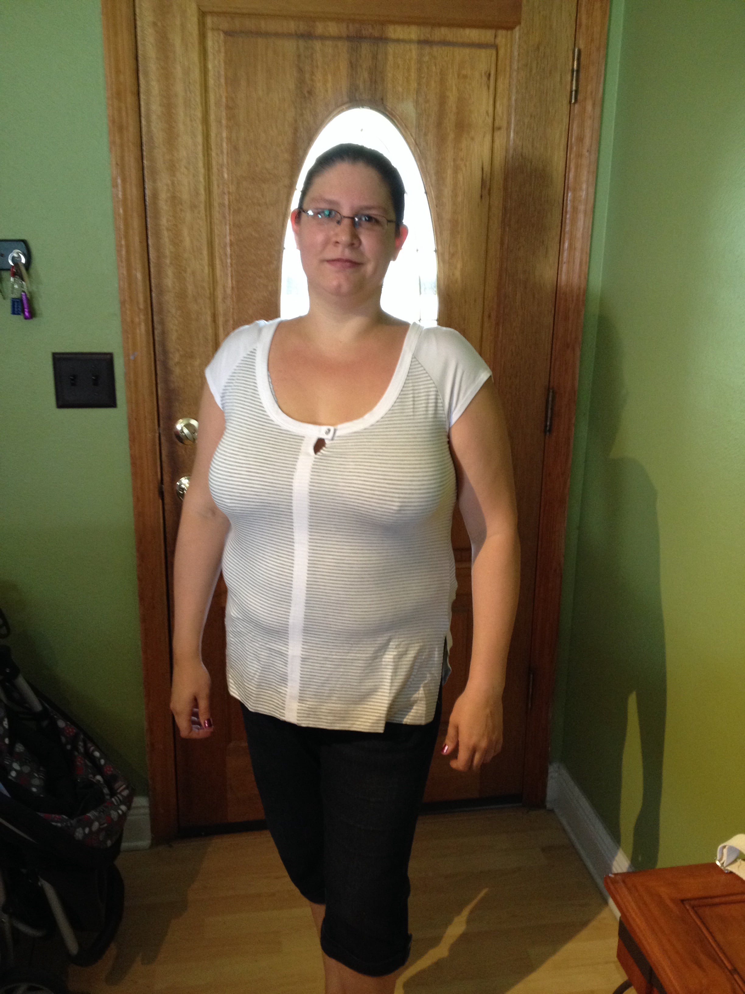 The gray top actually fit and was incredibly comfy, but I hated the keyhole feature and the stripe down the front. Excuse my nips, apparently I was cold. ;)
