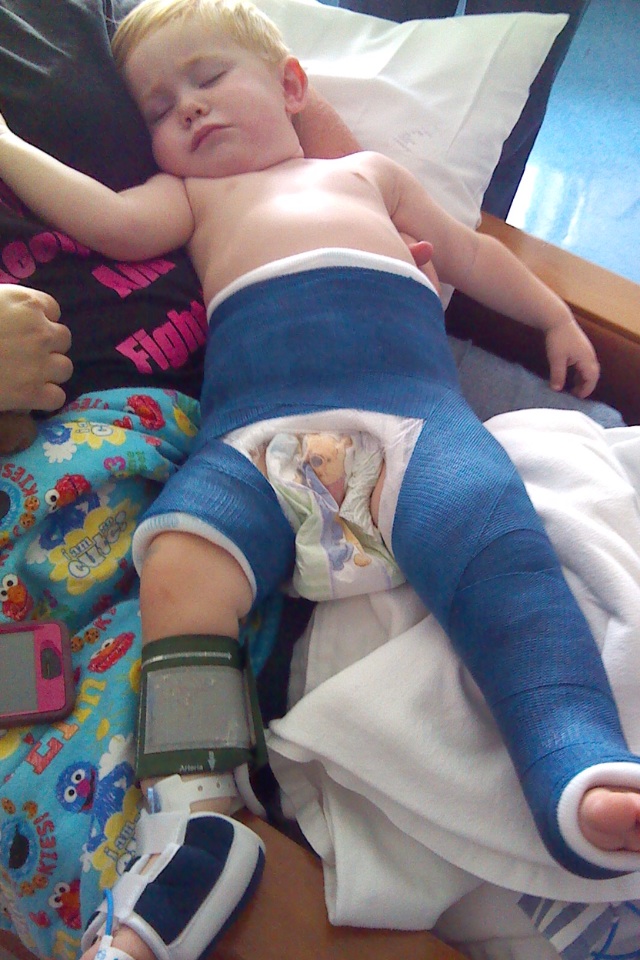 I posted last week about my 18 month old nephew having a broken femur that was not found by the doctors after my sisters wreck. Then, I spent the weekend in the hospital with them, phone died so I couldn't update. I came to work yesterday and my hard drive crashed, so I am FINALLY able to bump again. My 18 month old nephew had surgery to re-set his femur (re-break) and he is in a hip spica cast for 6-8 weeks. His cast covers his entire left leg, goes up to his rib cage, across and down to just above the knee on his right leg. I don't know how they missed it on x-ray, but it is healing now. He is very restricted in the cast, but he is not in any pain and is acting much better and is eating normally again. Also, someone asked if he was the same nephew that had his arms broken in the wreck (maybe it was