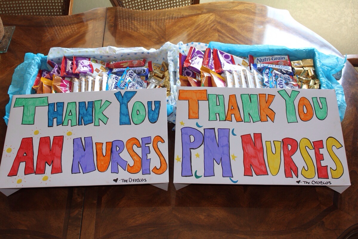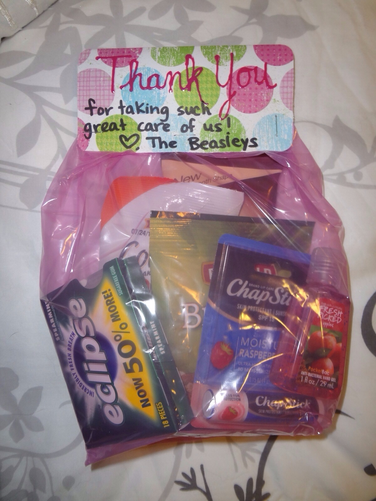 Or instead of doing individual baggies another idea would be to have a basket of random grab and go snacks/drinks that nurses or docs can help themselves to.