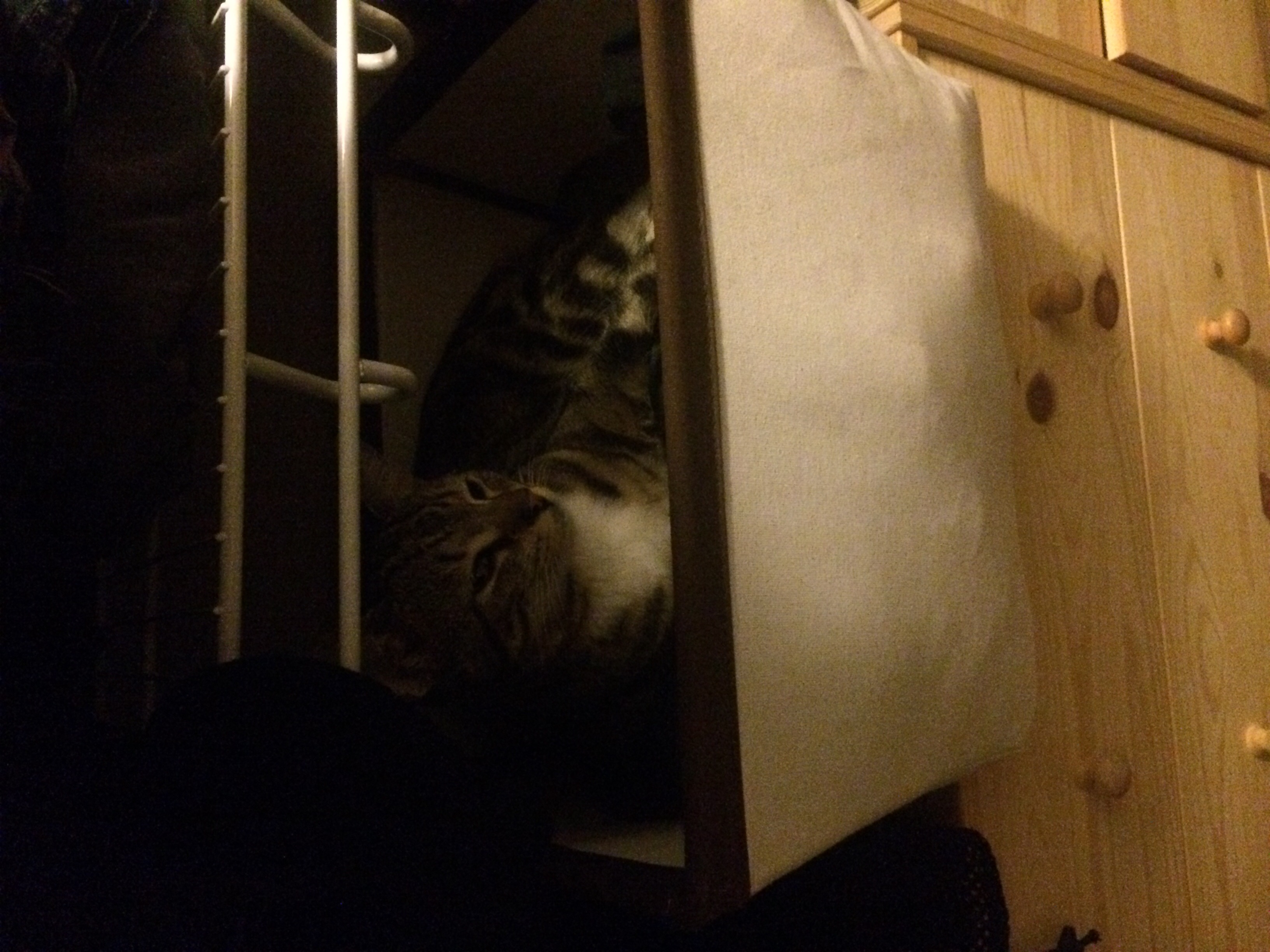 I lug everything upstairs. Put almost everything away, settle down in my armchair and one cat curls up with me. I'm getting way too comfy then I realize the other cat is missing and it's out of the norm for him. I force myself to get up and look for him. Turns out he's safely hidden in my closet.