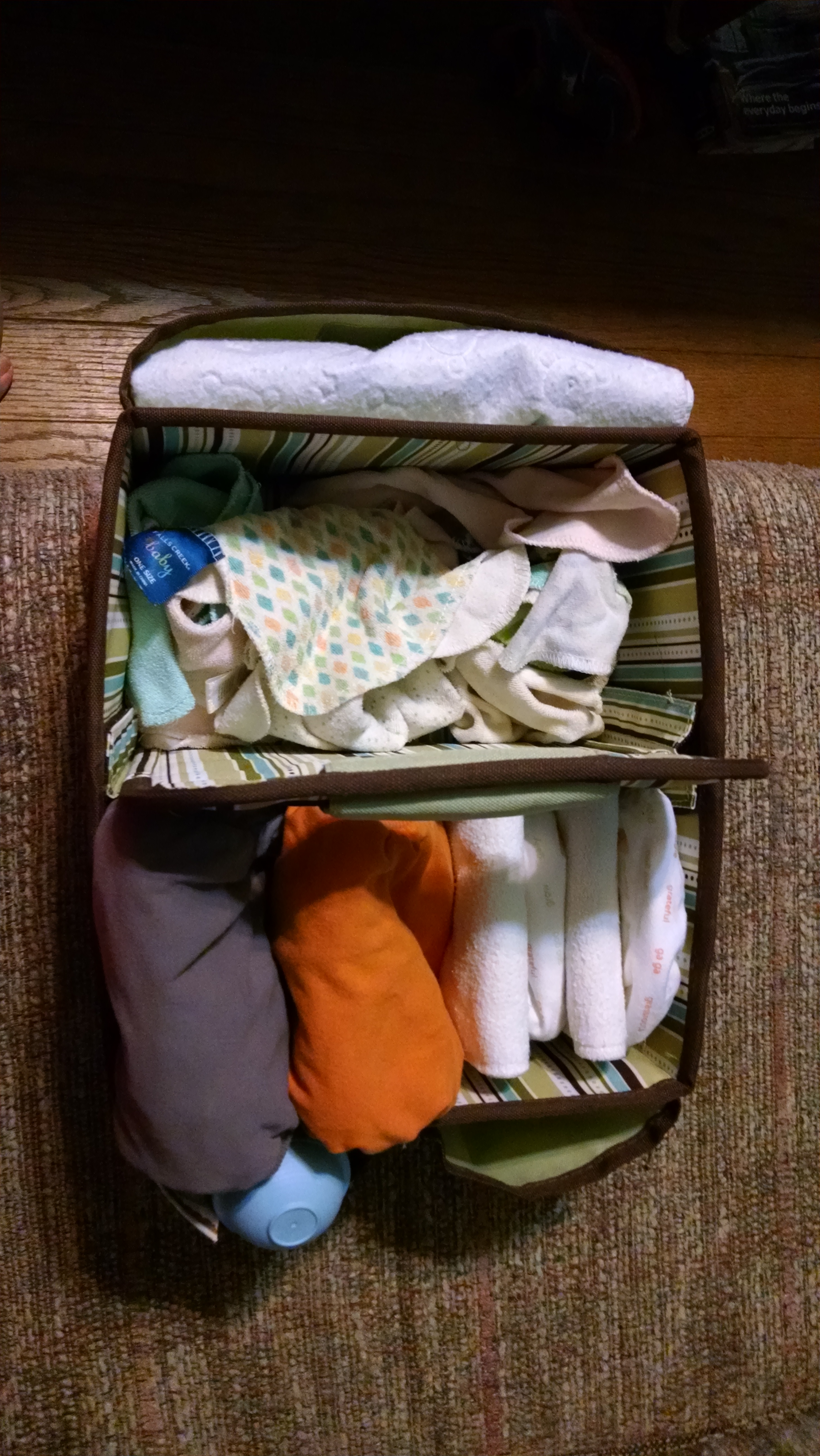I'll have two in cloth so right now the whites are my newborn tints, the colored ones are for my 18 month old. The empty pocket is where we kept pacis. Here's a pic of my basket:
