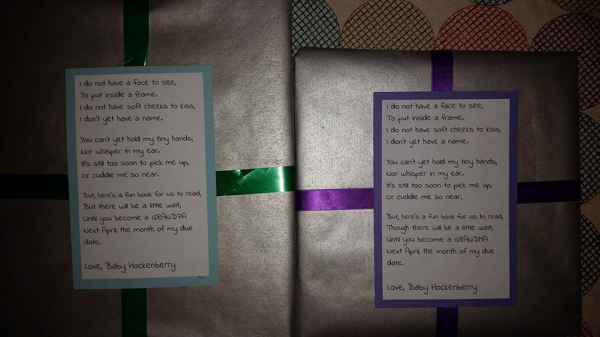 We're announcing to the ILs today with children's books that I got them. MIL get the Little Critter's book, "Just Grandma and Me" and FIL is getting "I Love You Grandpa". They're wrapped up with a poem on the cover.