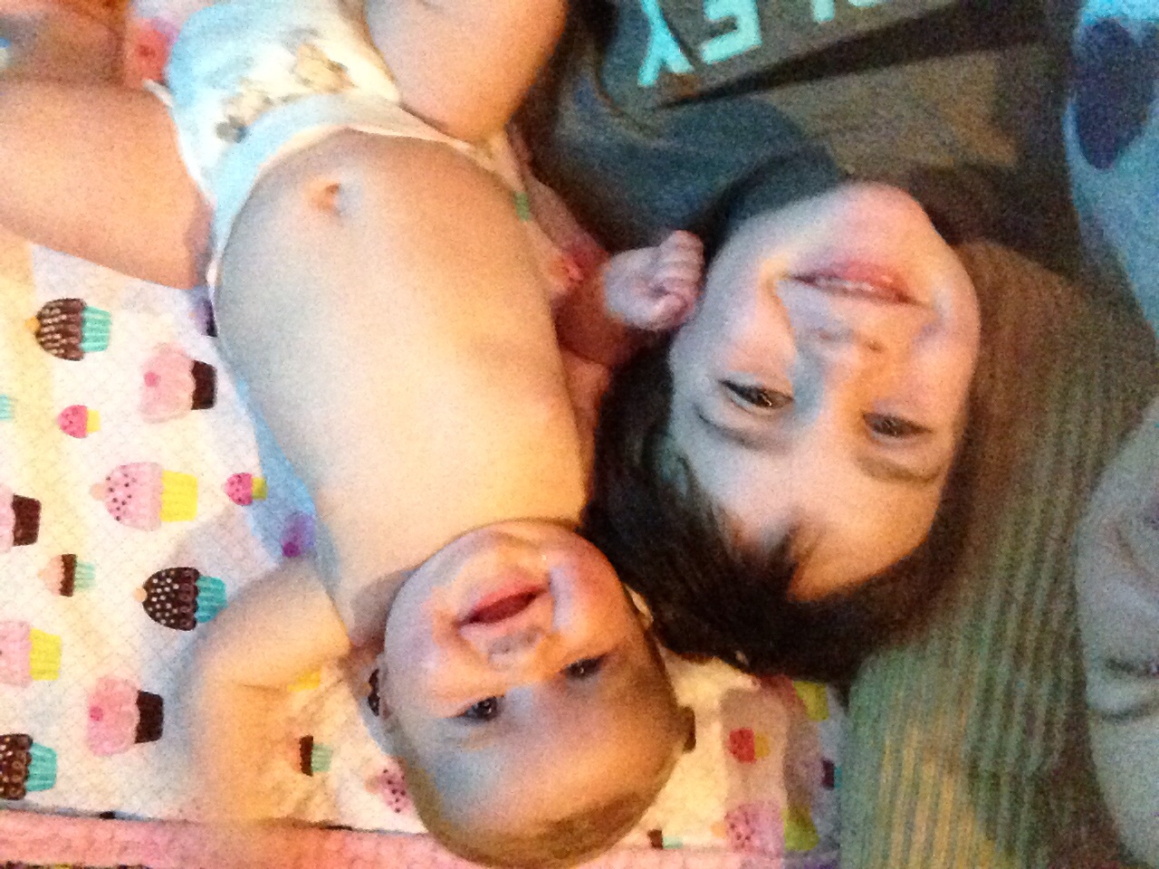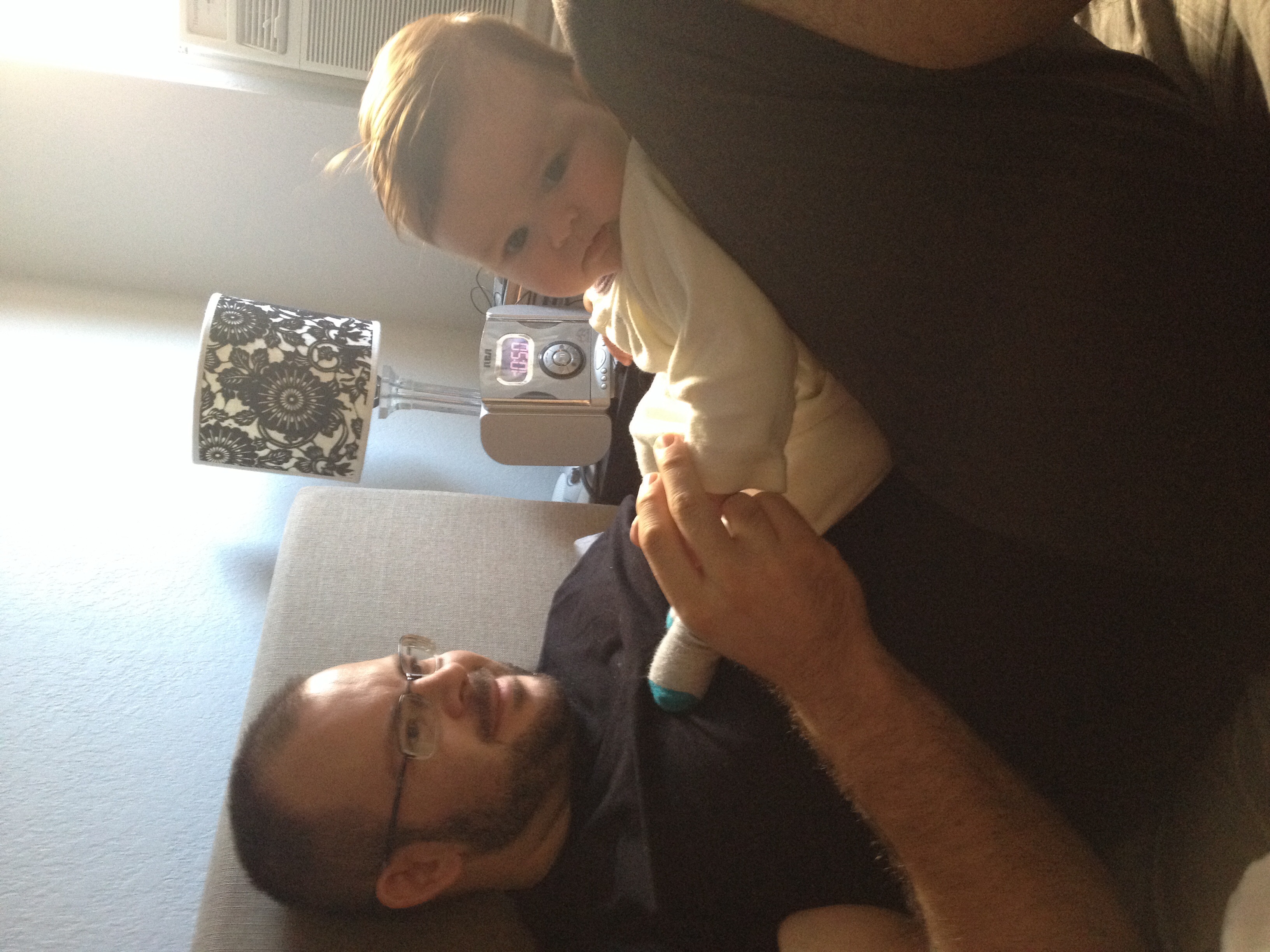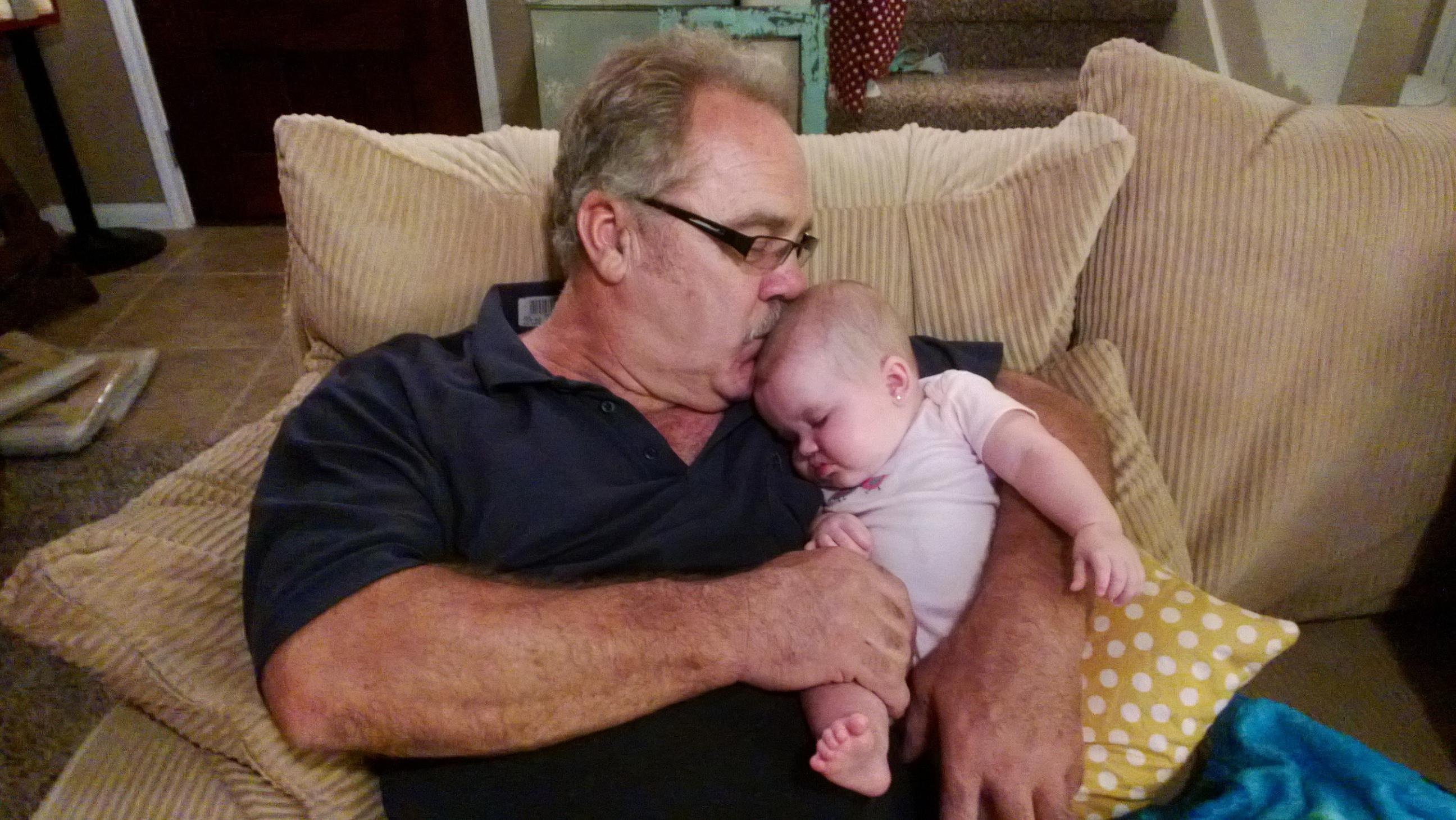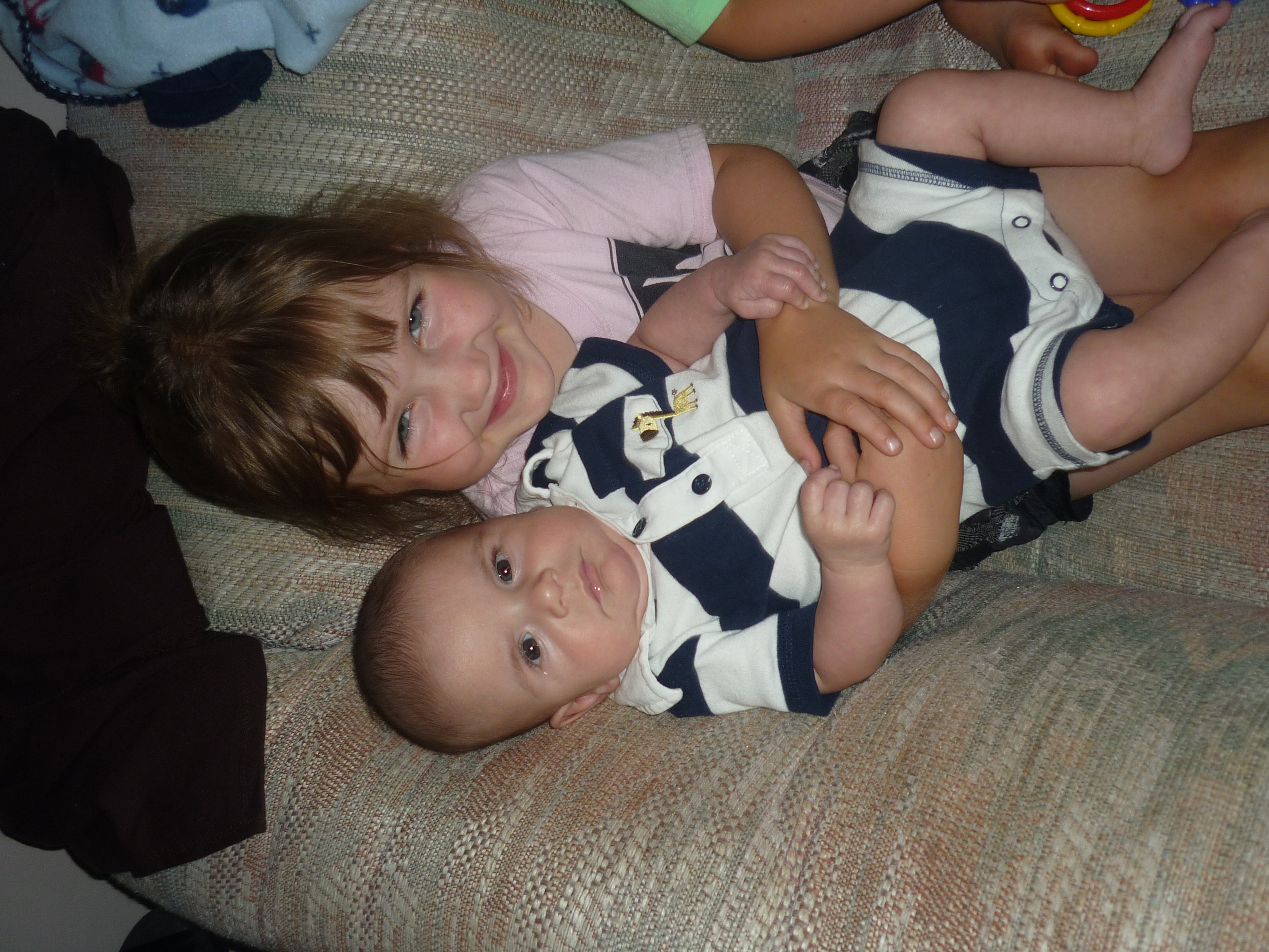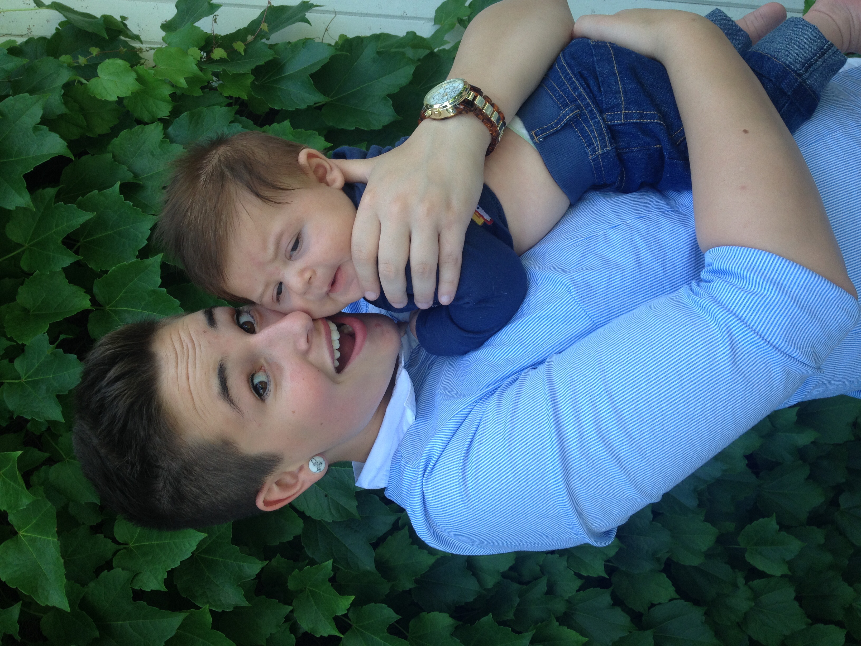 With his cousin, great-grandma, grandpa, aunt and dad. This boy never gets put down :P