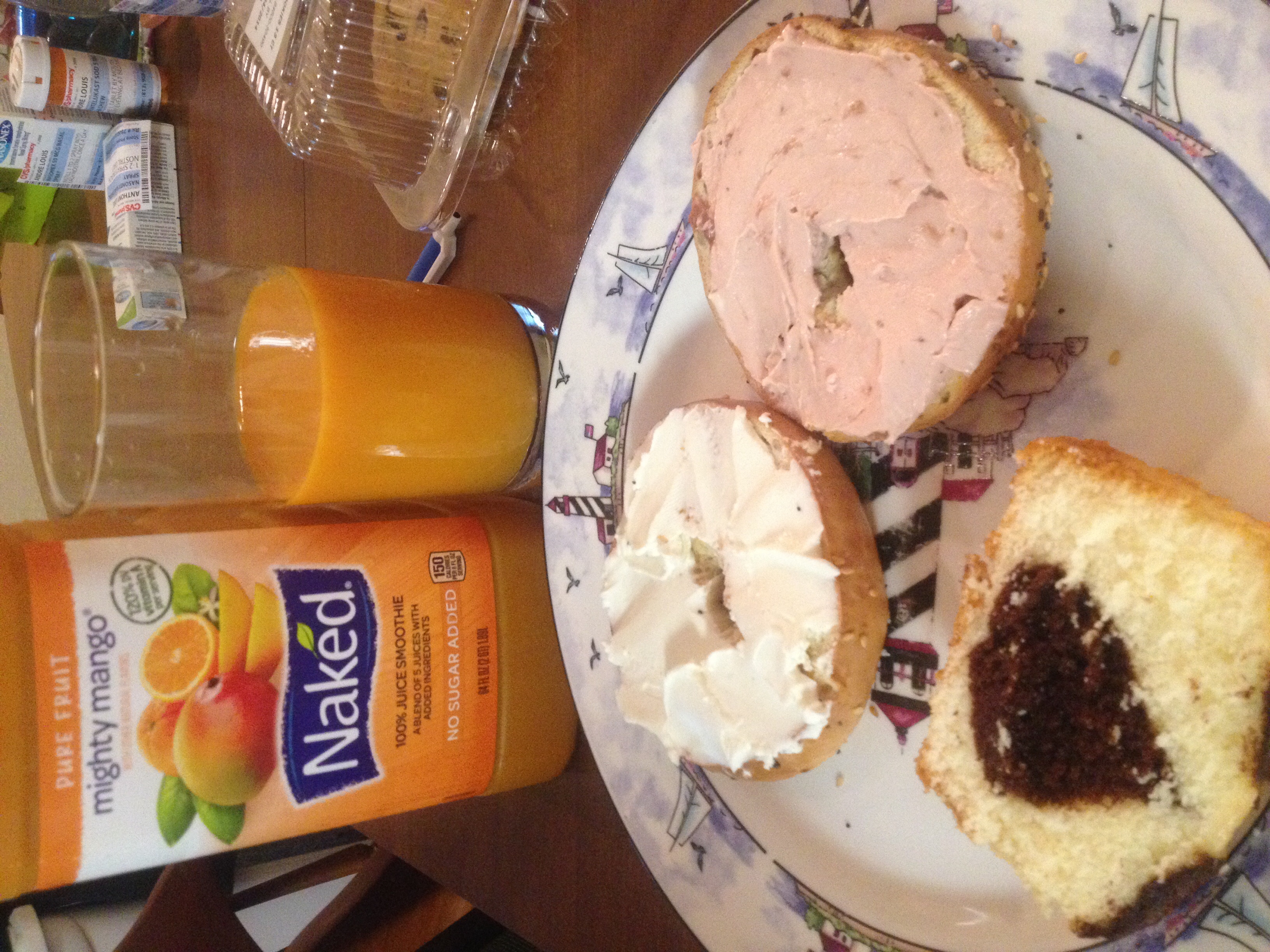 So I read this post and have been CRAVING bagels since!! Publix has them BOGO right now!!! I went nuts! Lol then I saw a marble cake and mango juice!!! Yummy!